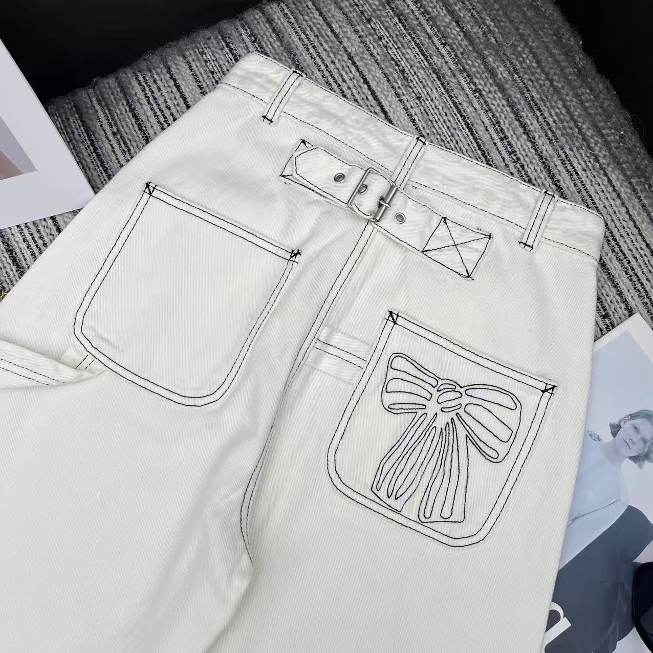 Acne Studios 2026 Spring/Summer Collection. New embroidered bow pocket curved blade denim wide-leg pants. Authentic product with mold-made design. Features distinctive bow knot detail and wide-leg silhouette.