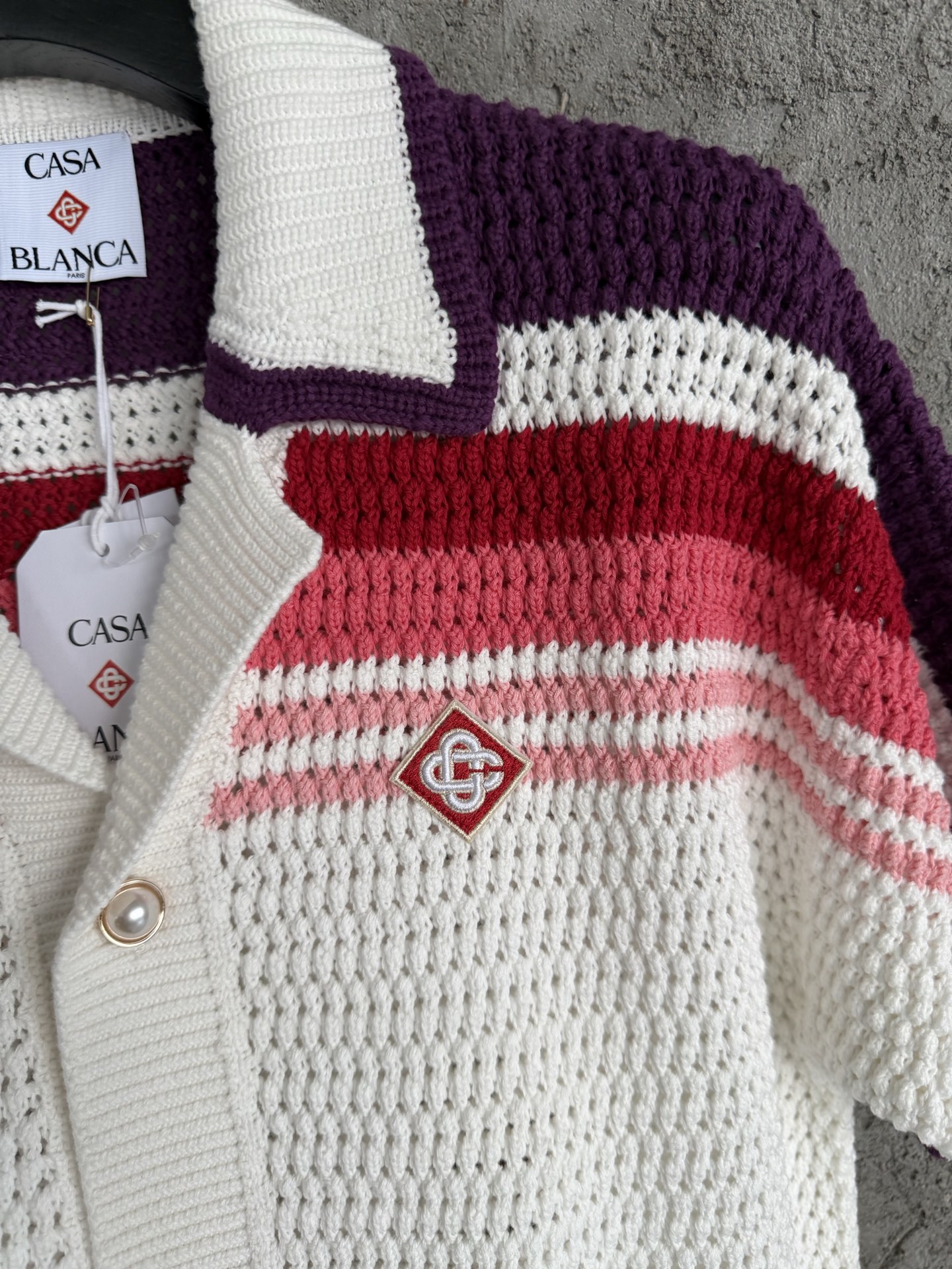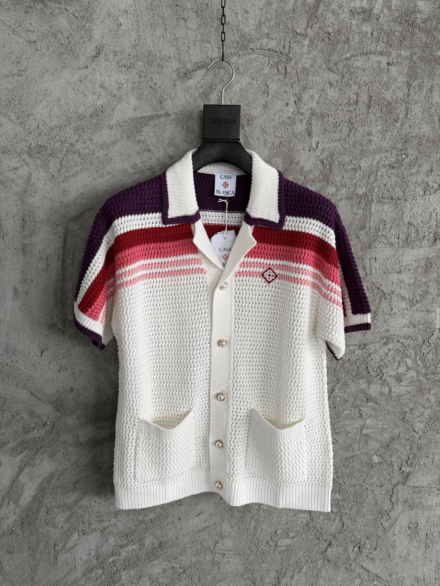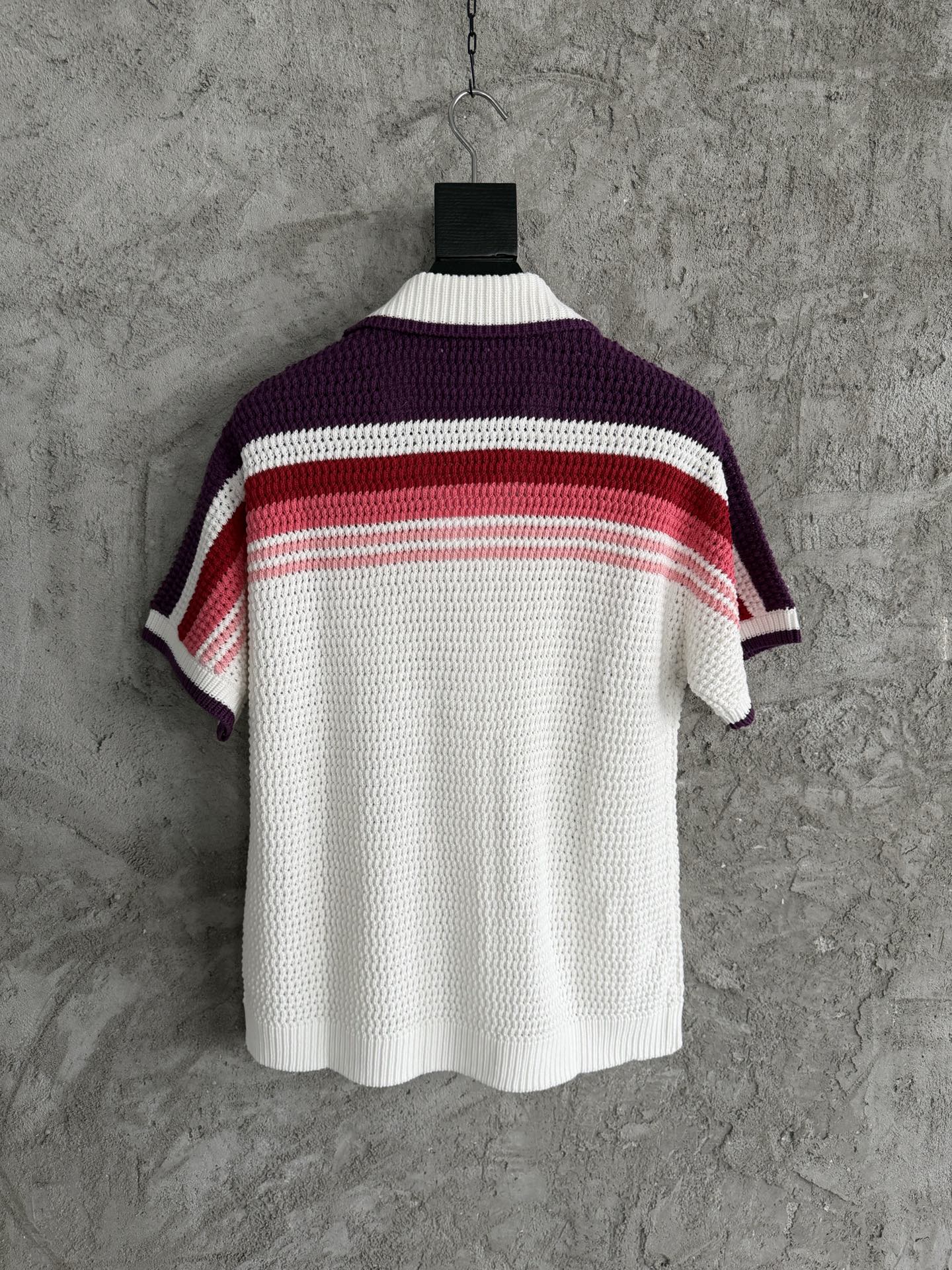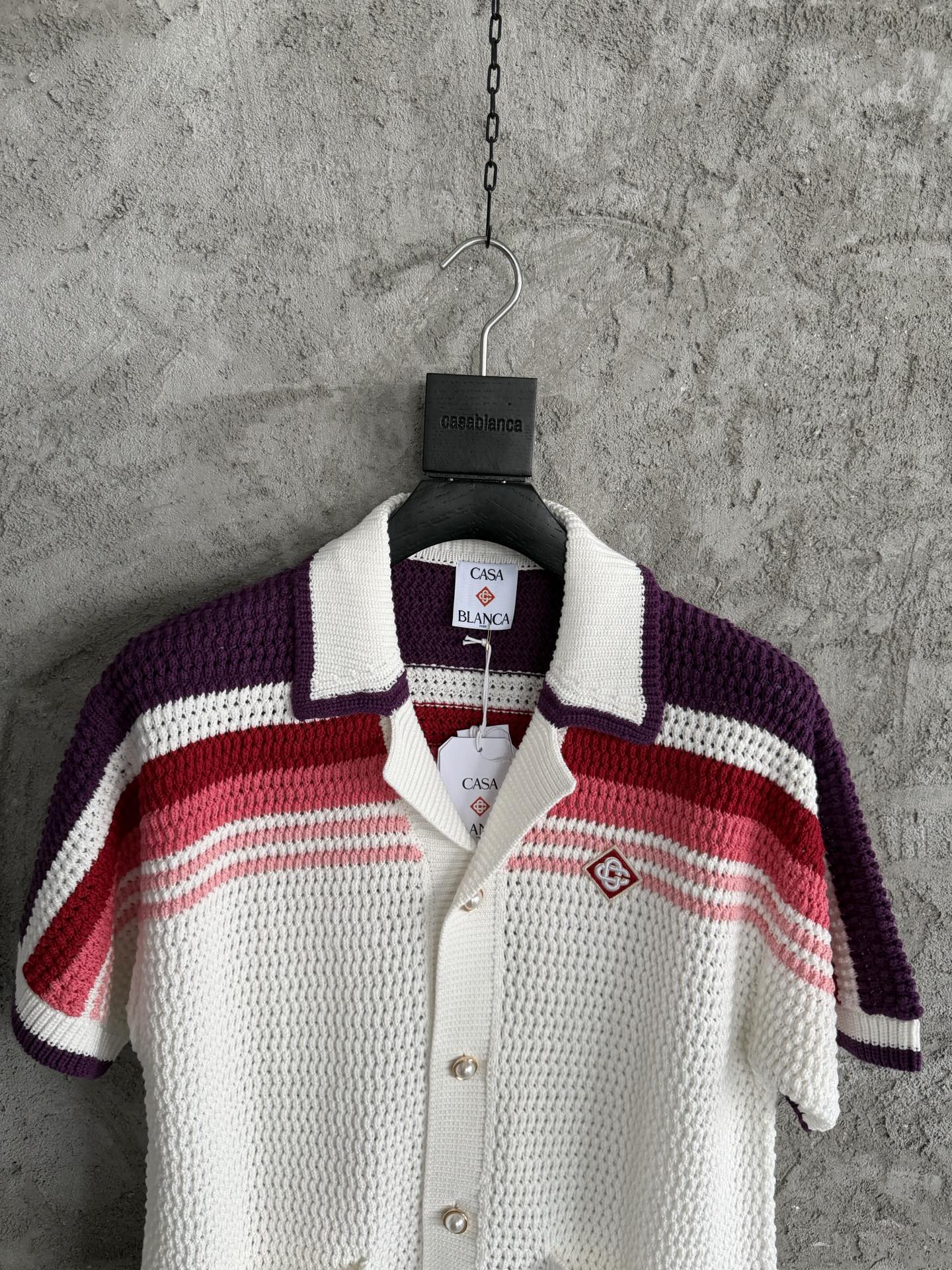 CASABLANCA 2026SS Knitted Pink Striped Sweater Short Sleeve Shirt. Custom 100% cotton fabric, imported high-density crochet knit, custom pearl buttons. Size: S, M, L, XL.