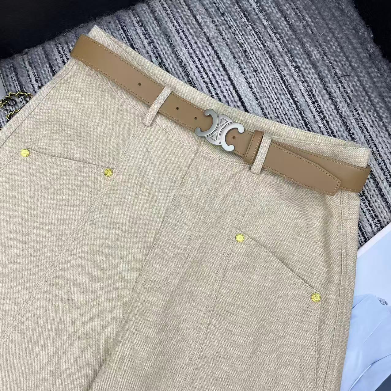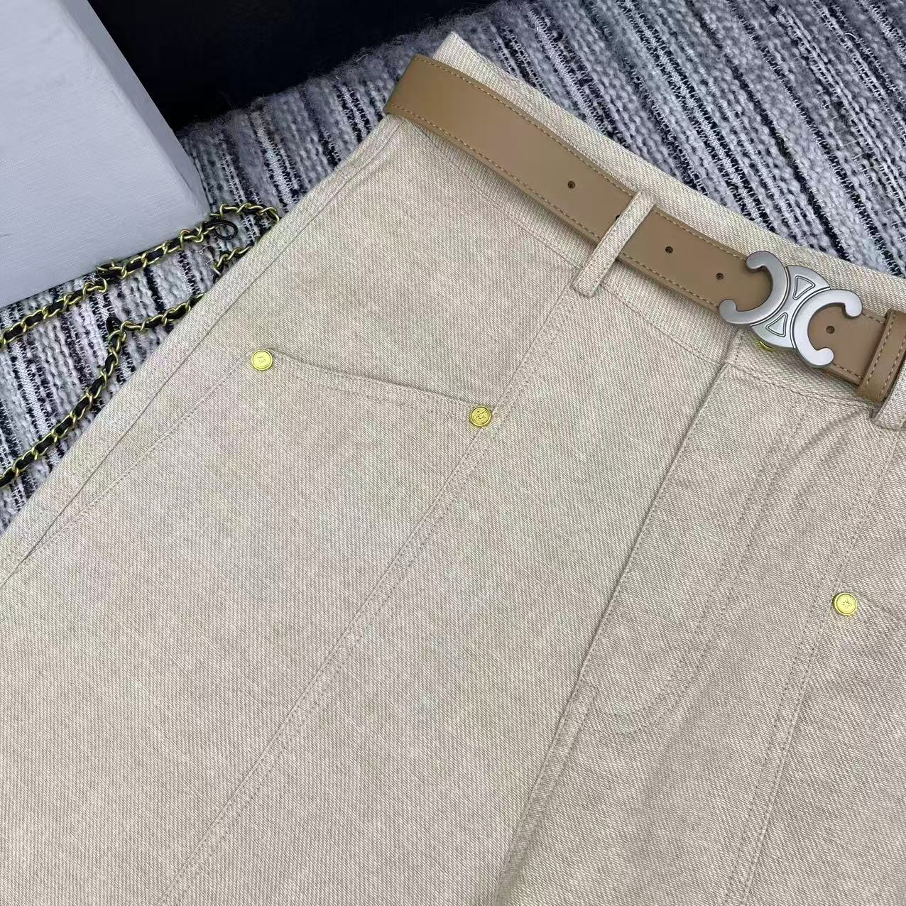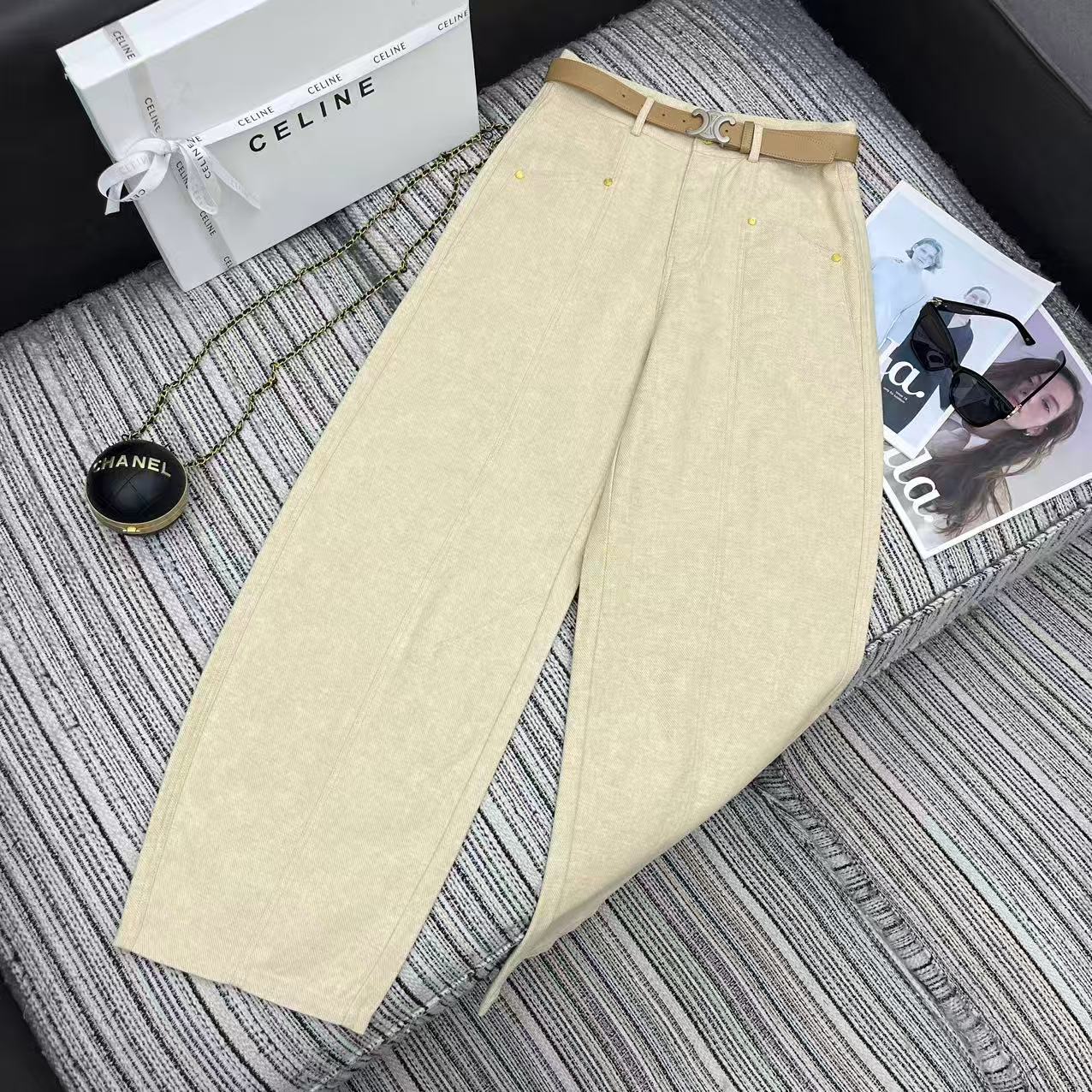 Celine 26SS New Curved Wide-Leg Trousers with Custom Leather Belt. Arc de Triomphe pocket details. 2 colors available. Size exchange within 10 days.