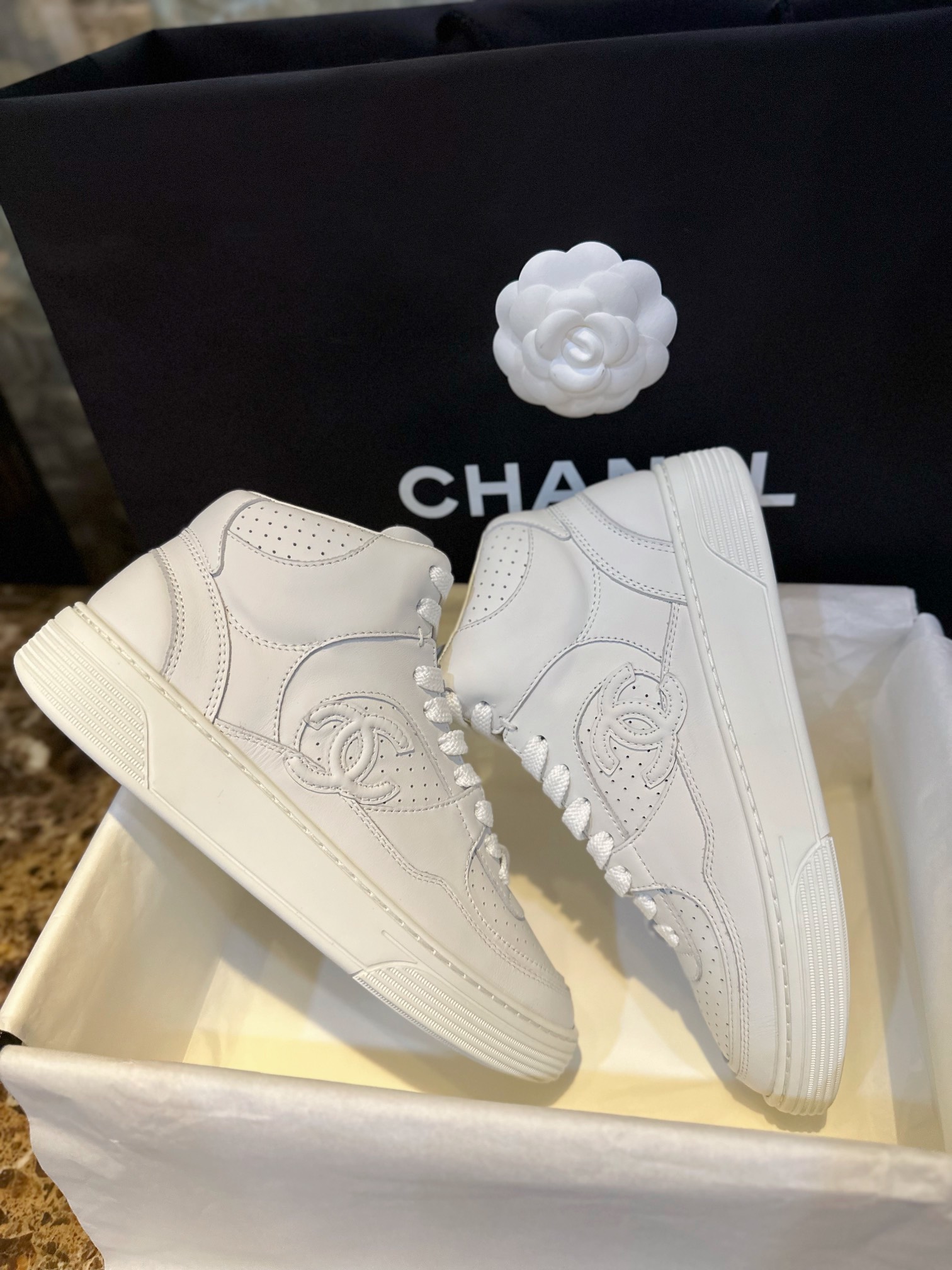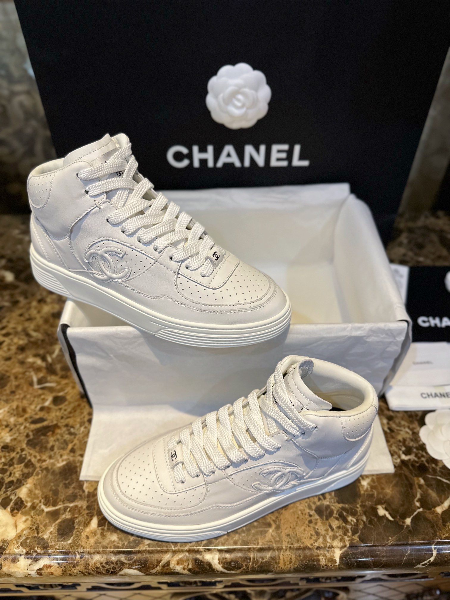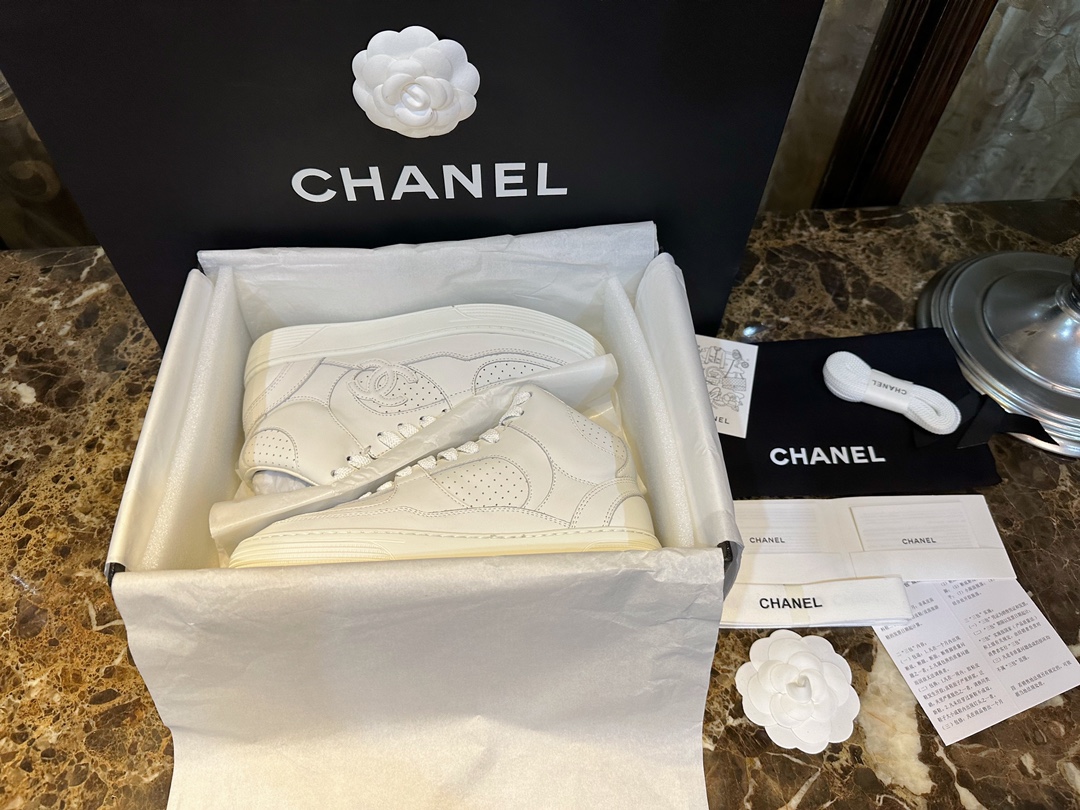 Chanel 23A Air Force One High-Top Sneakers. Classic high-top silhouette with signature Chanel branding from the 23A collection. Premium leather construction. Sizes 35-40.