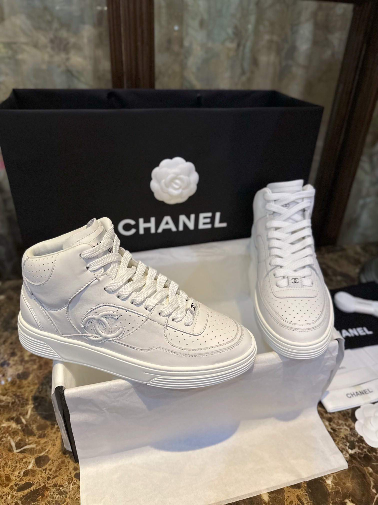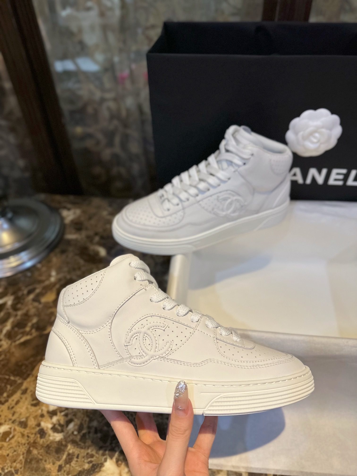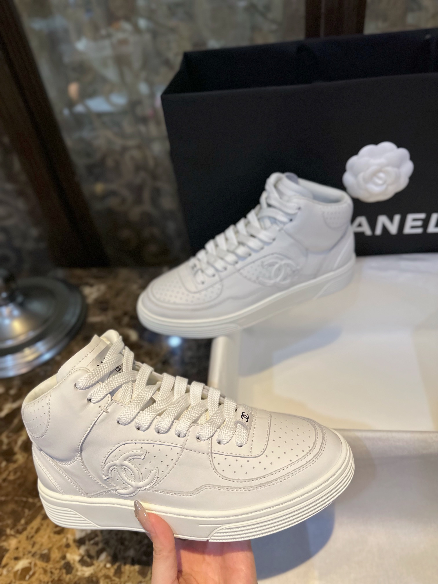 Chanel 23A Air Force One High-Top Sneakers. Classic high-top silhouette with signature Chanel branding from the 23A collection. Premium leather construction. Sizes 35-40.