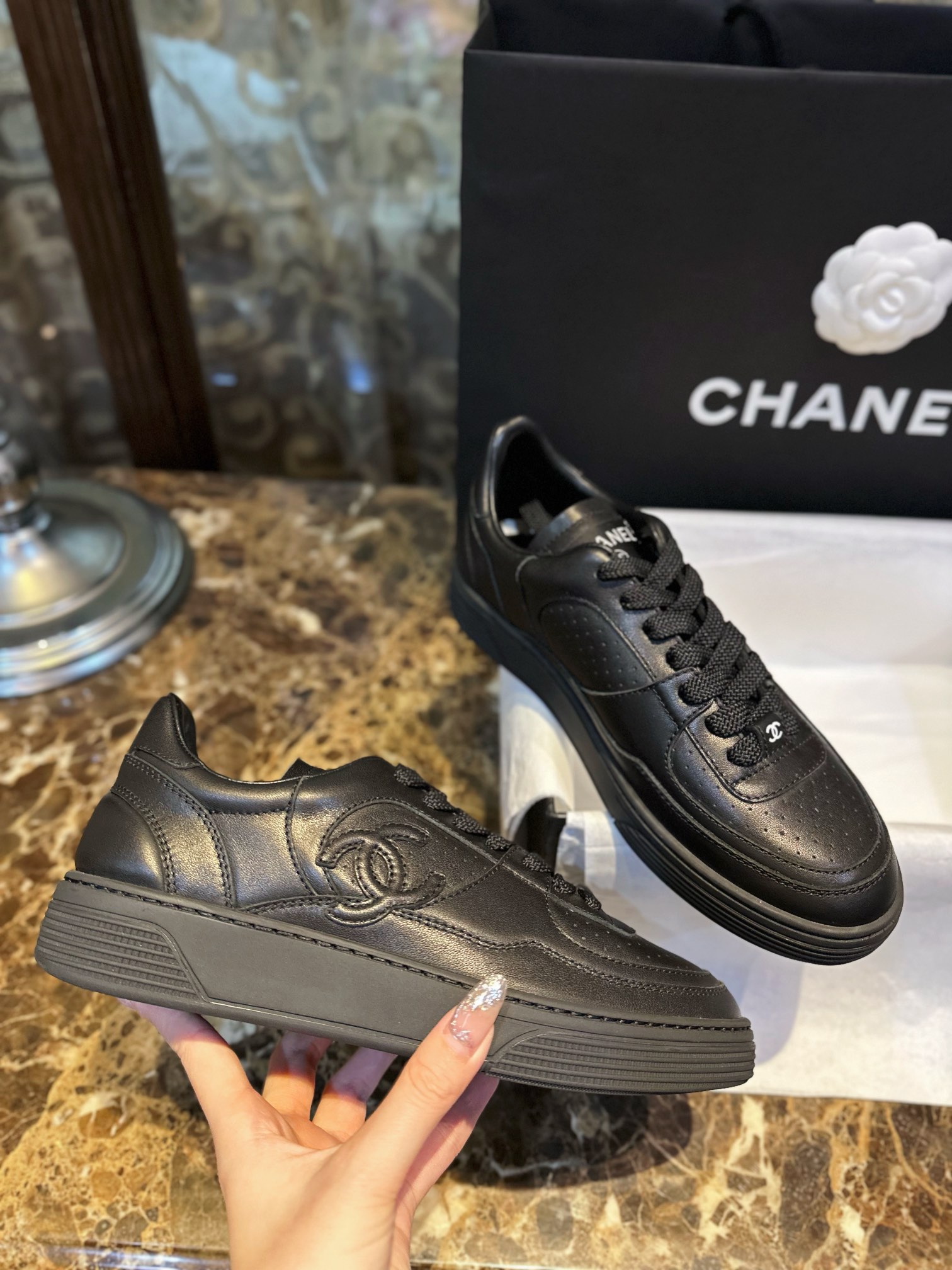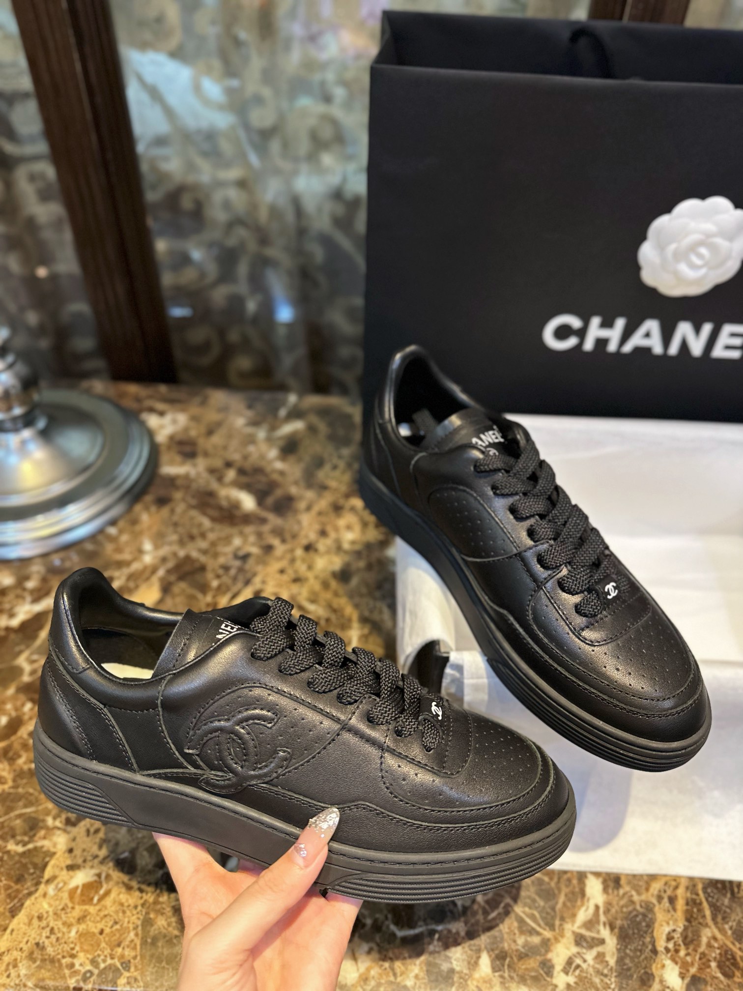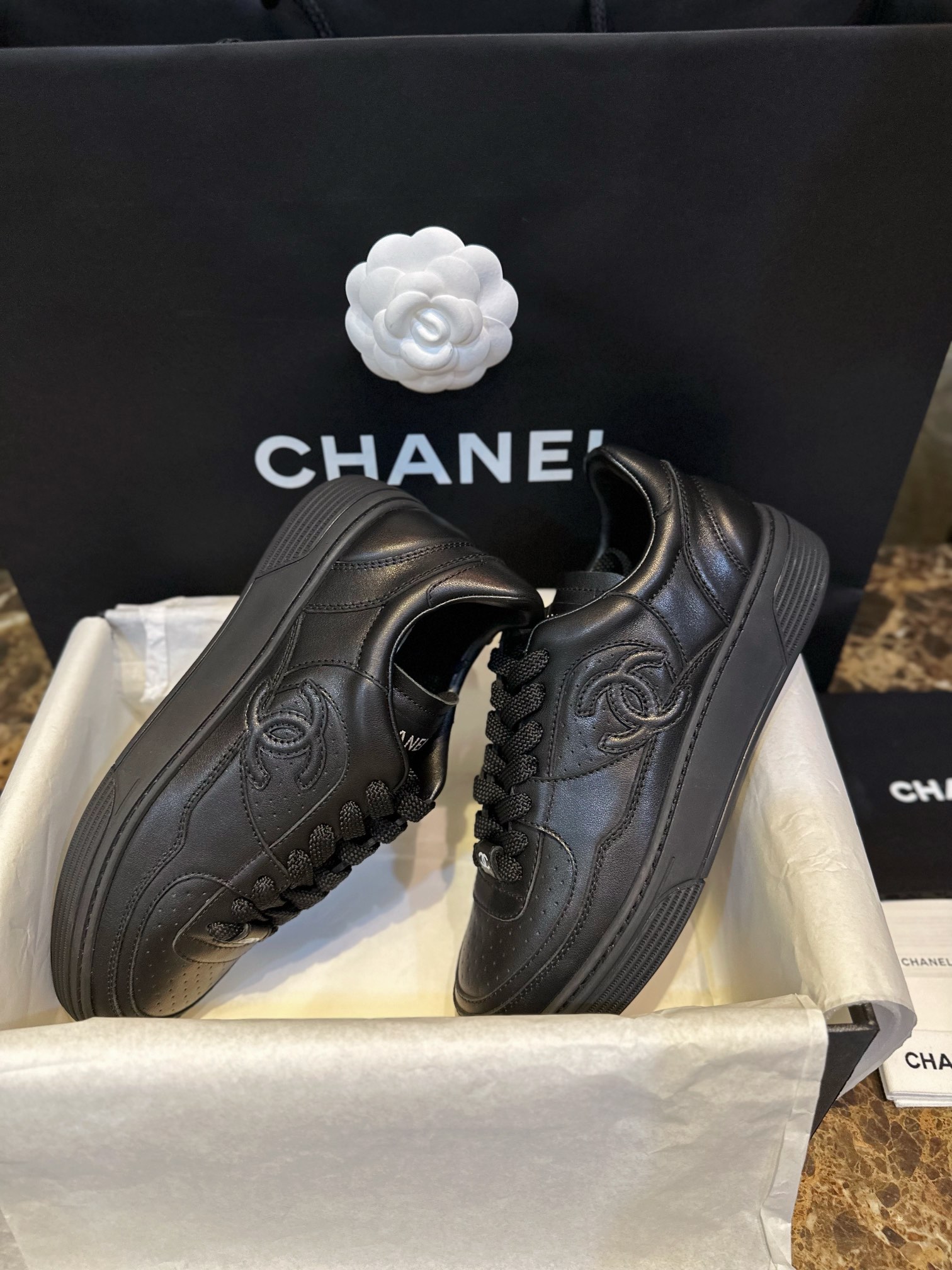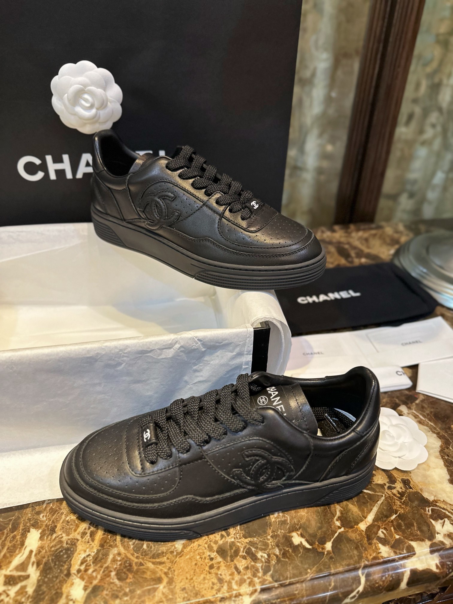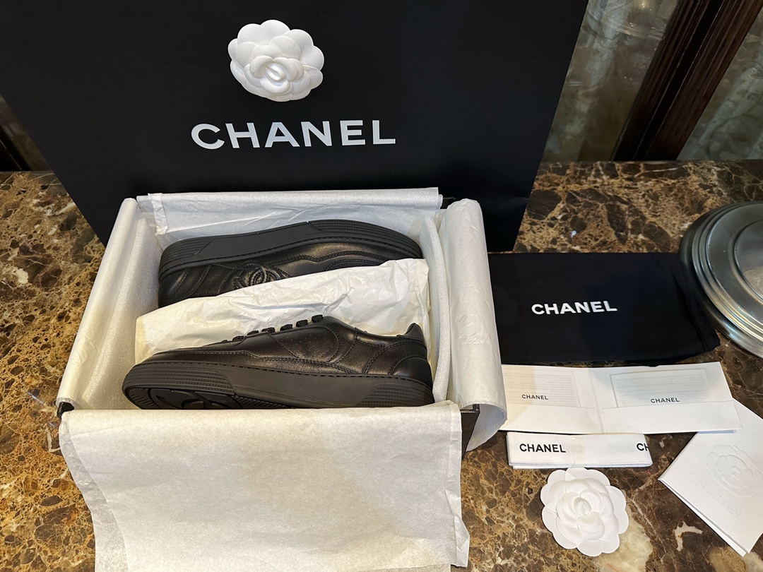 Chanel 23A Black Sneakers. Sleek black leather sneakers from the iconic 23A collection. Signature Chanel branding with premium construction. Sizes 35-40.