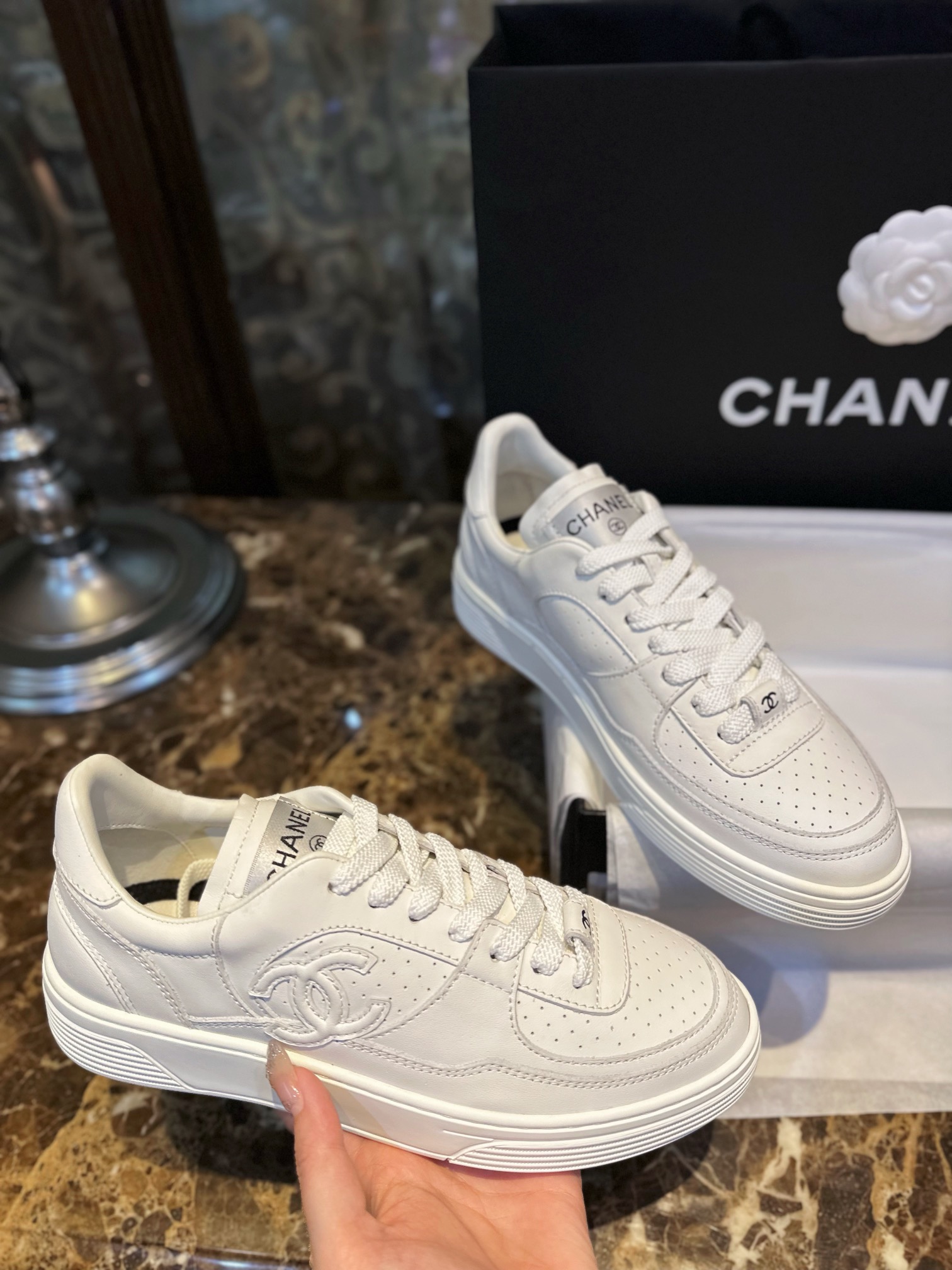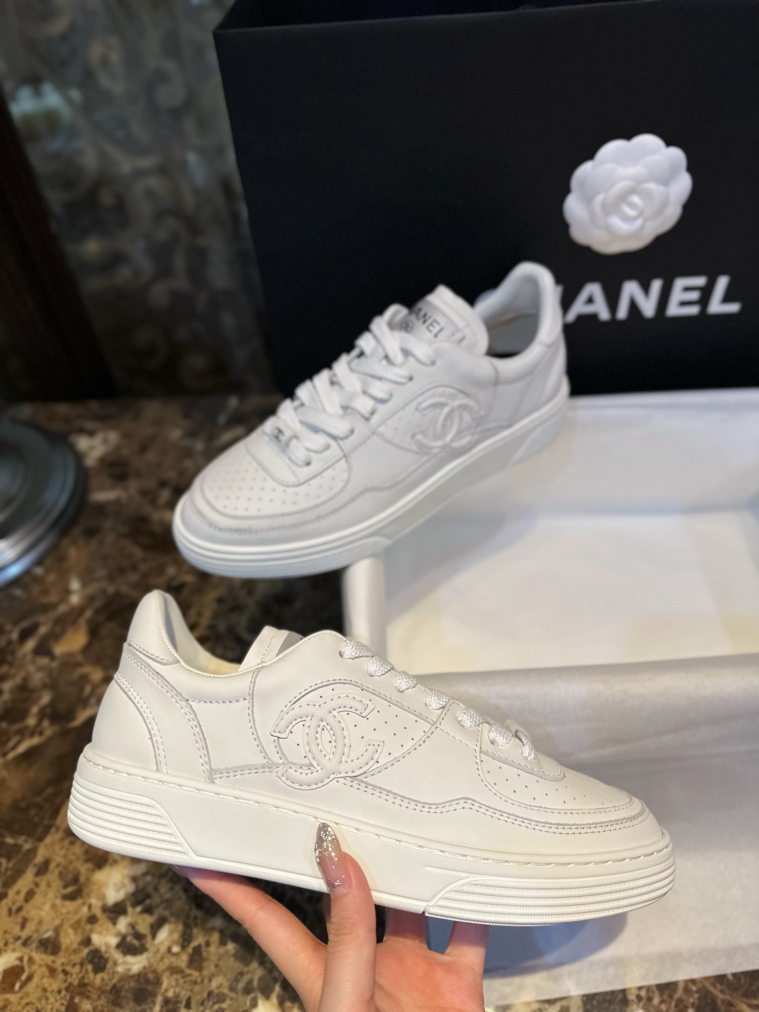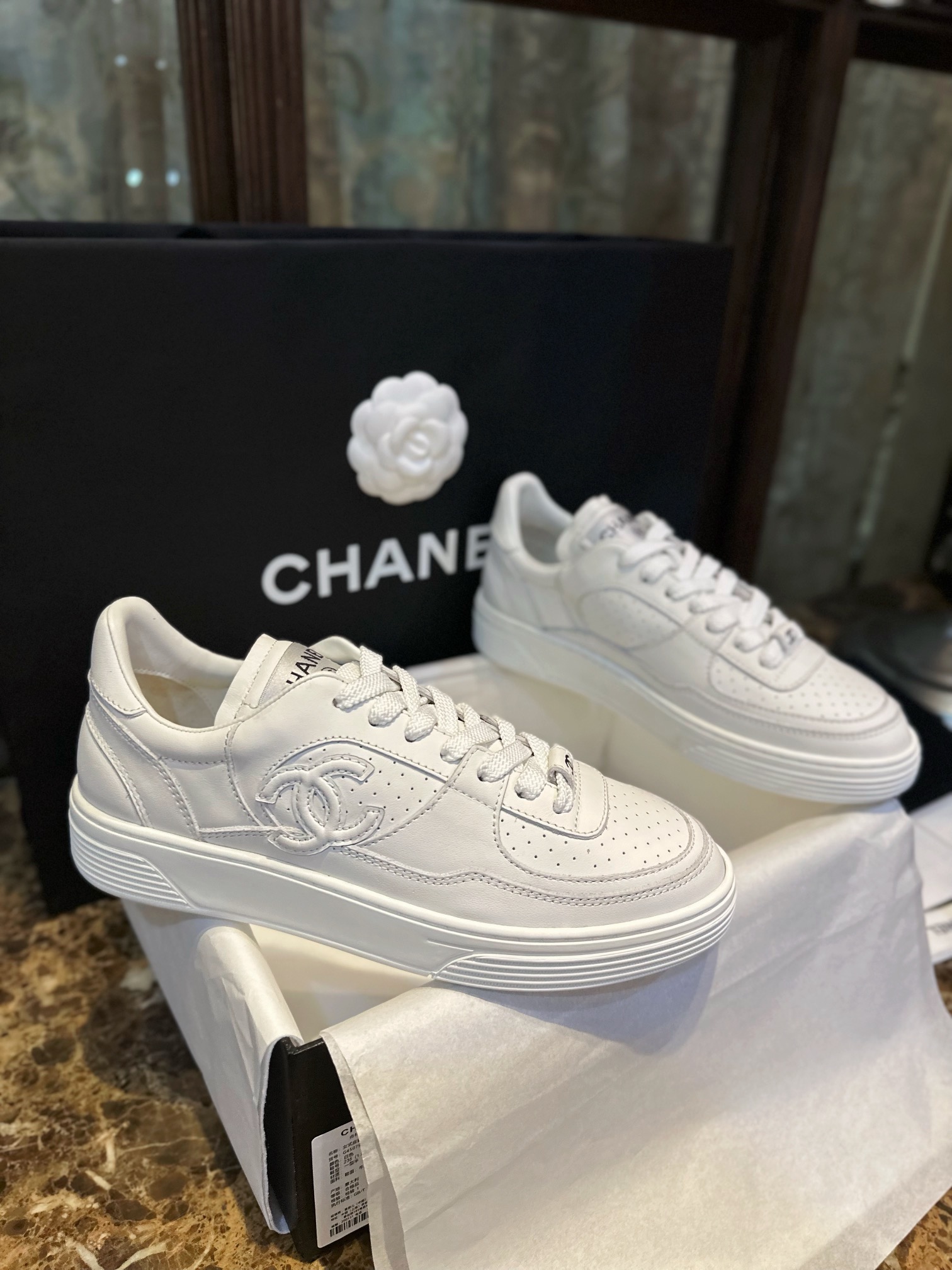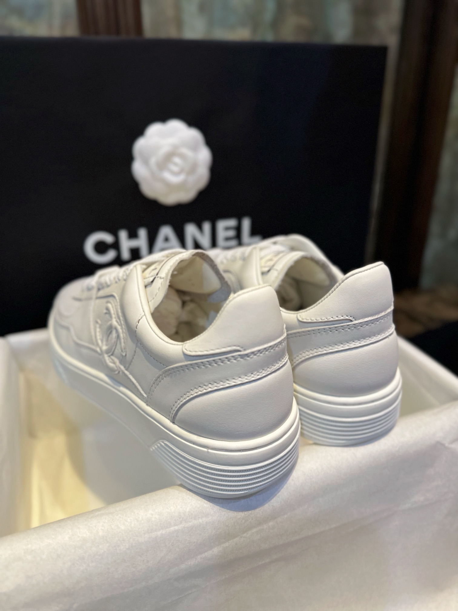 Chanel 23A White Sneakers. Clean white leather sneakers from the iconic 23A collection. Signature Chanel branding with premium construction. Sizes 35-40.