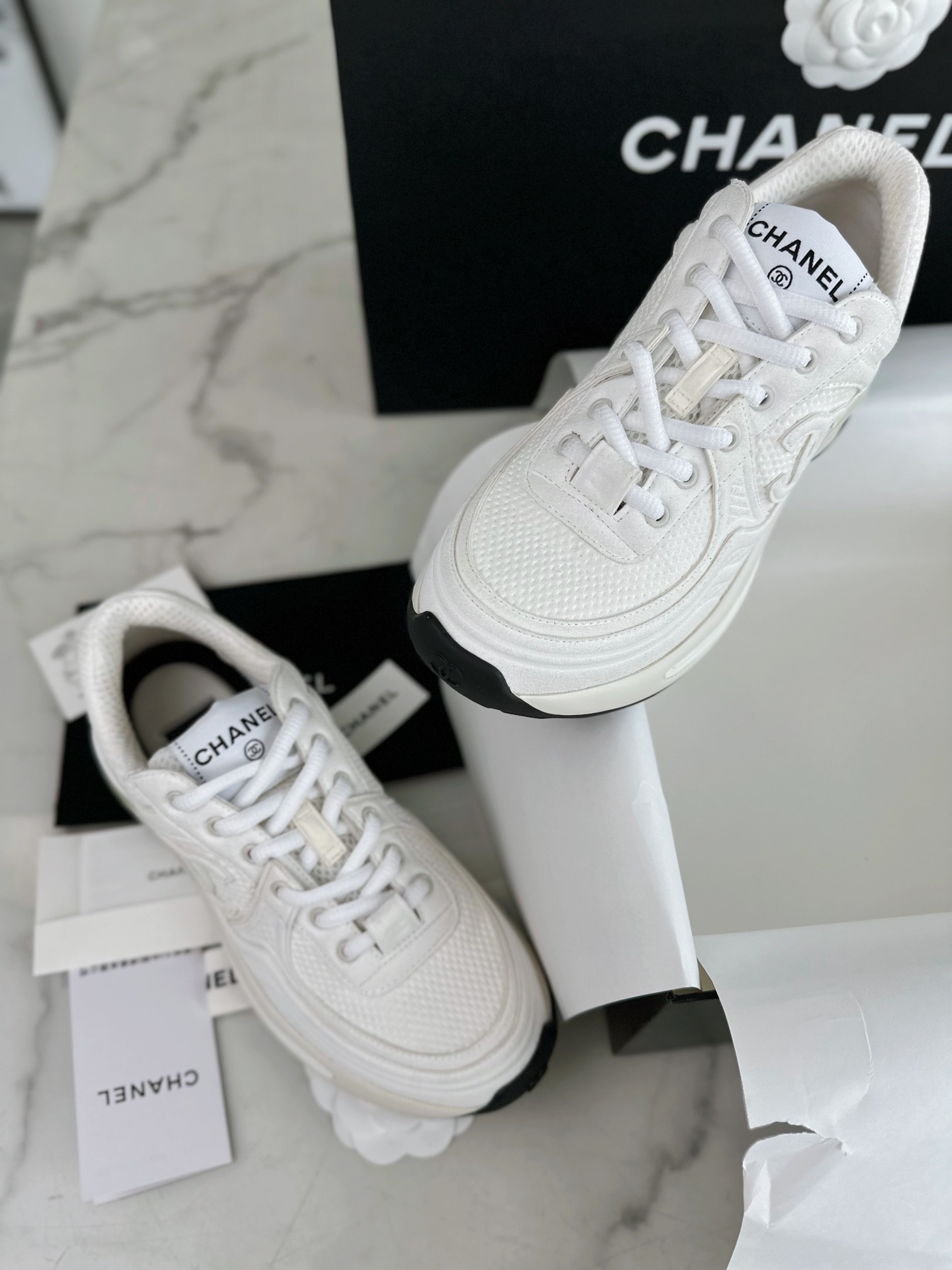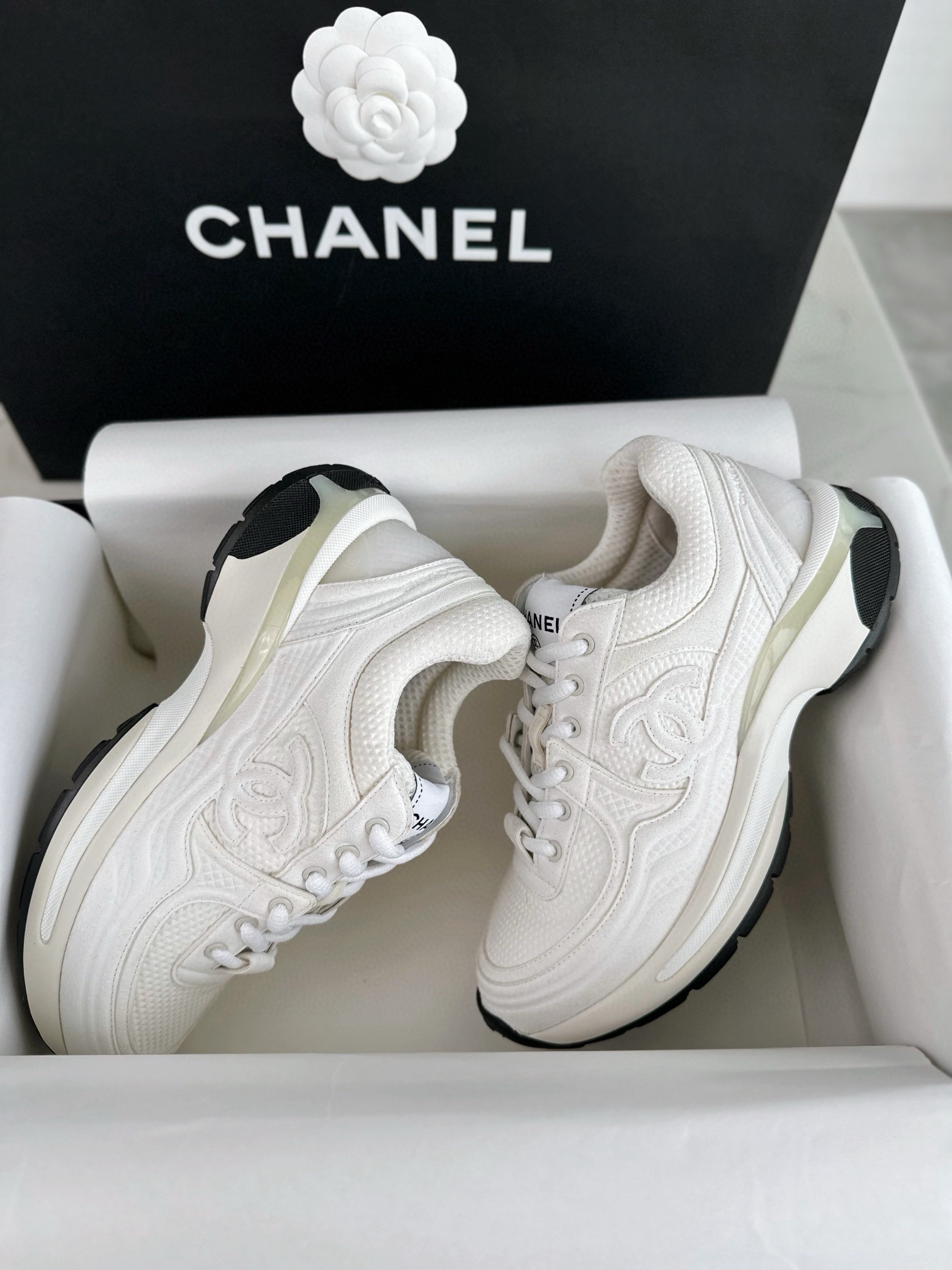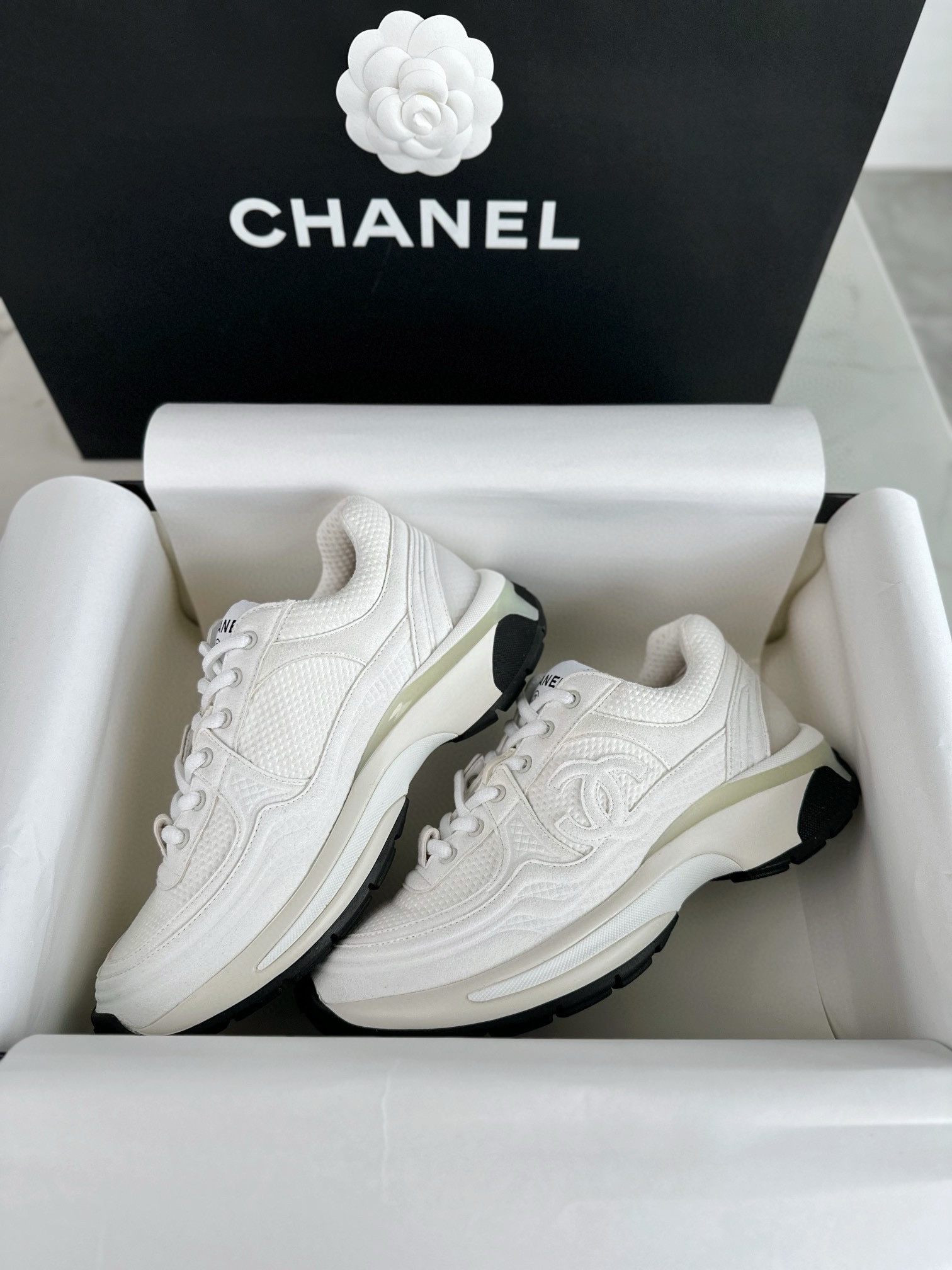 Chanel 24S Pure White Sneakers. Crisp pure white sneakers from the 24S collection. Signature Chanel branding with premium leather construction. Sizes 35-41.