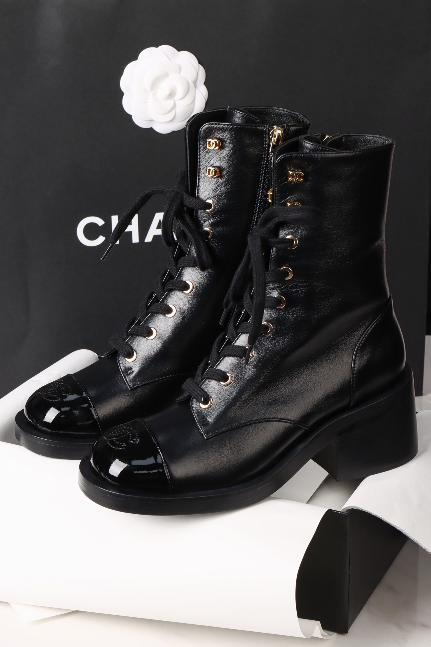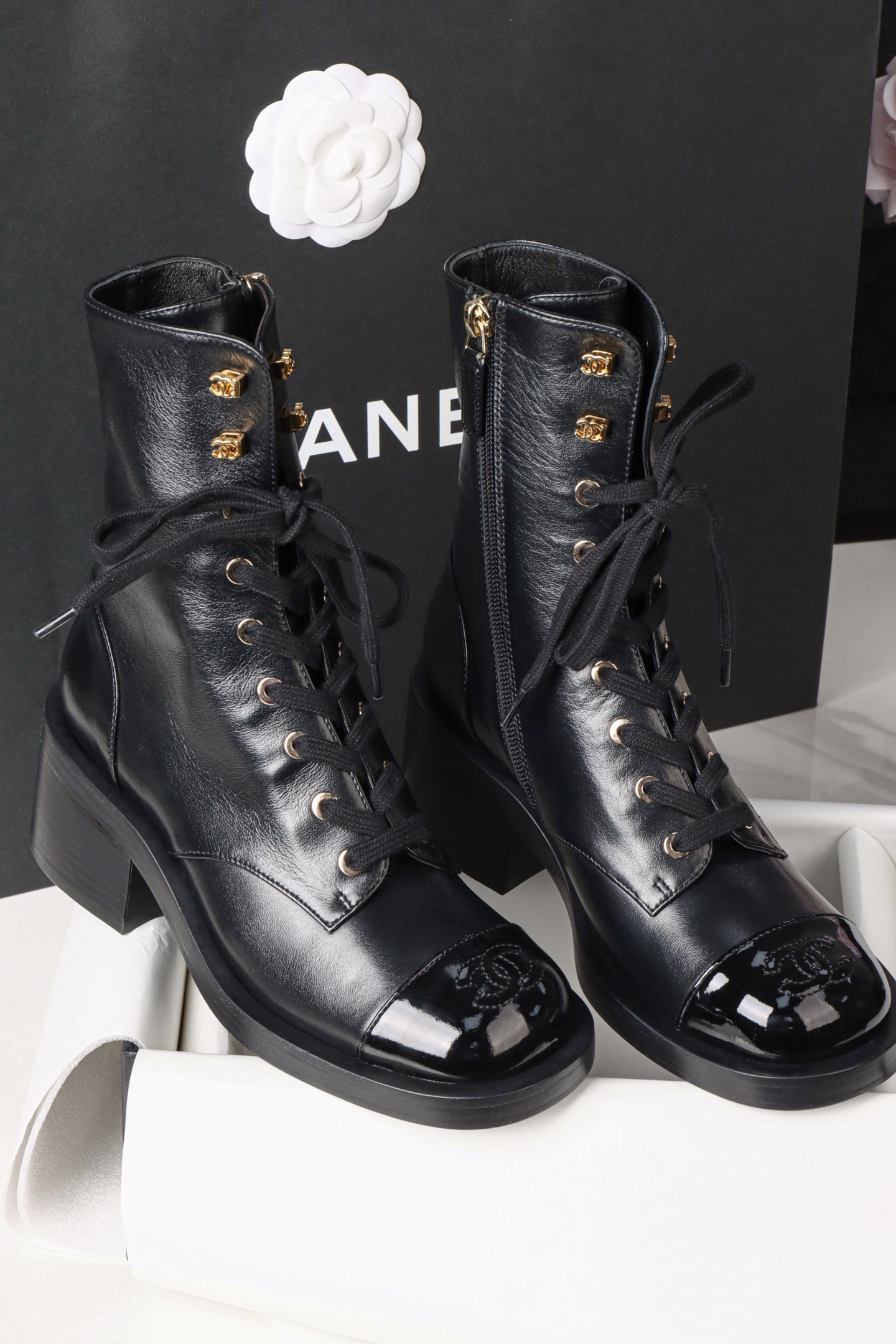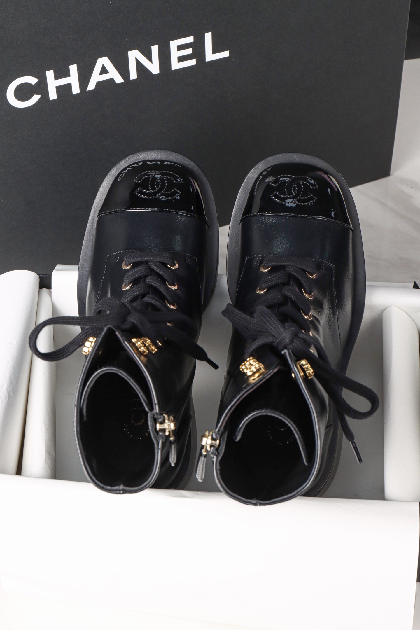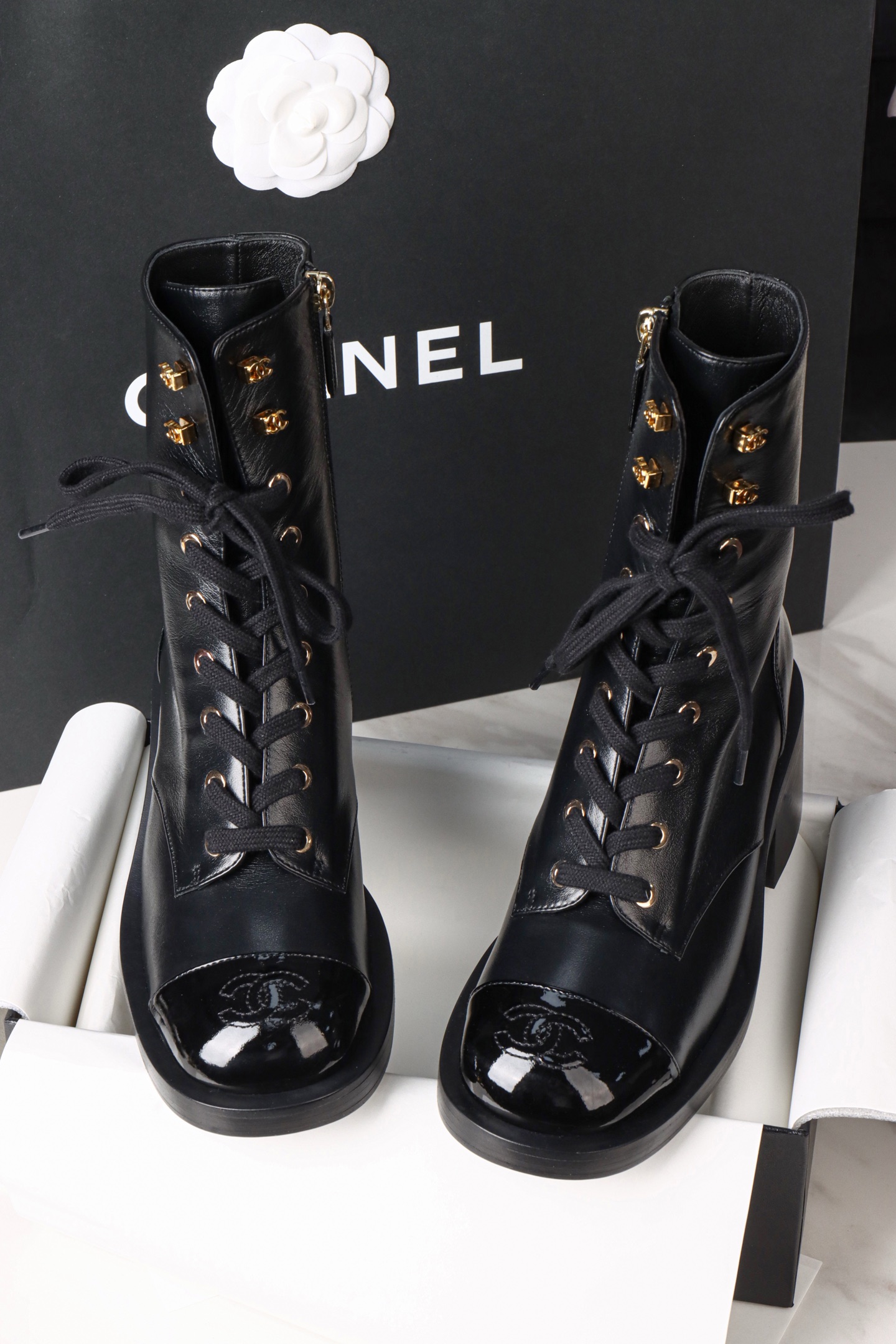 Chanel 25A Black Patent Martin Boots. Bold black patent Martin-style boots from the exclusive 25A collection. Premium patent leather with signature Chanel detailing. Sizes 35-41.