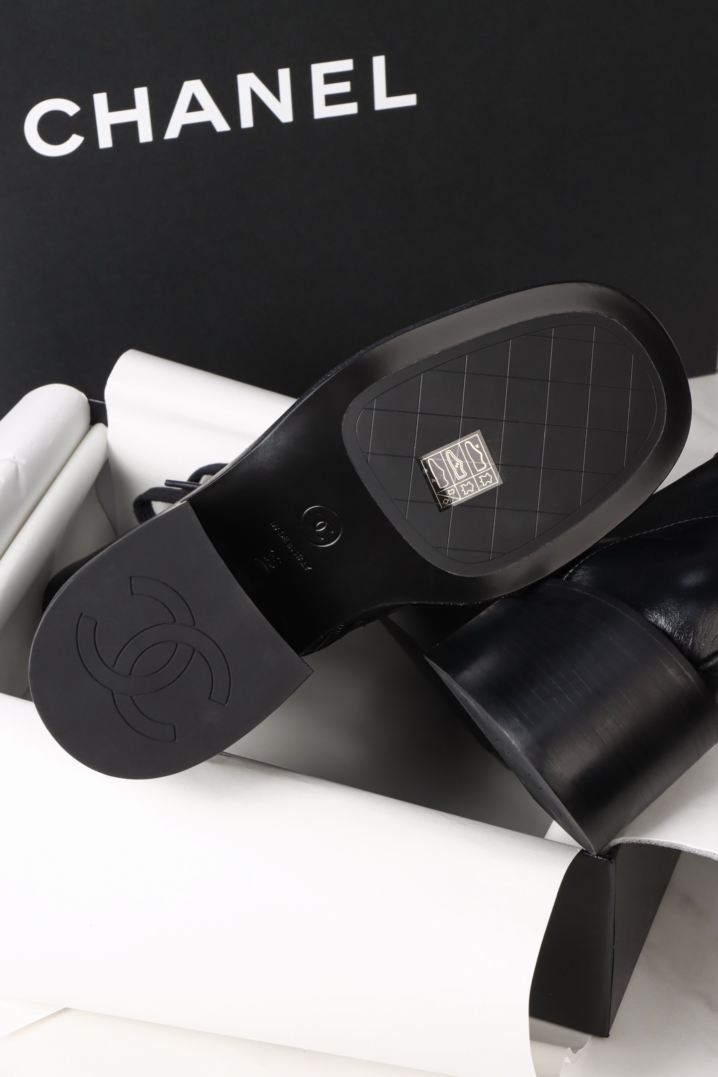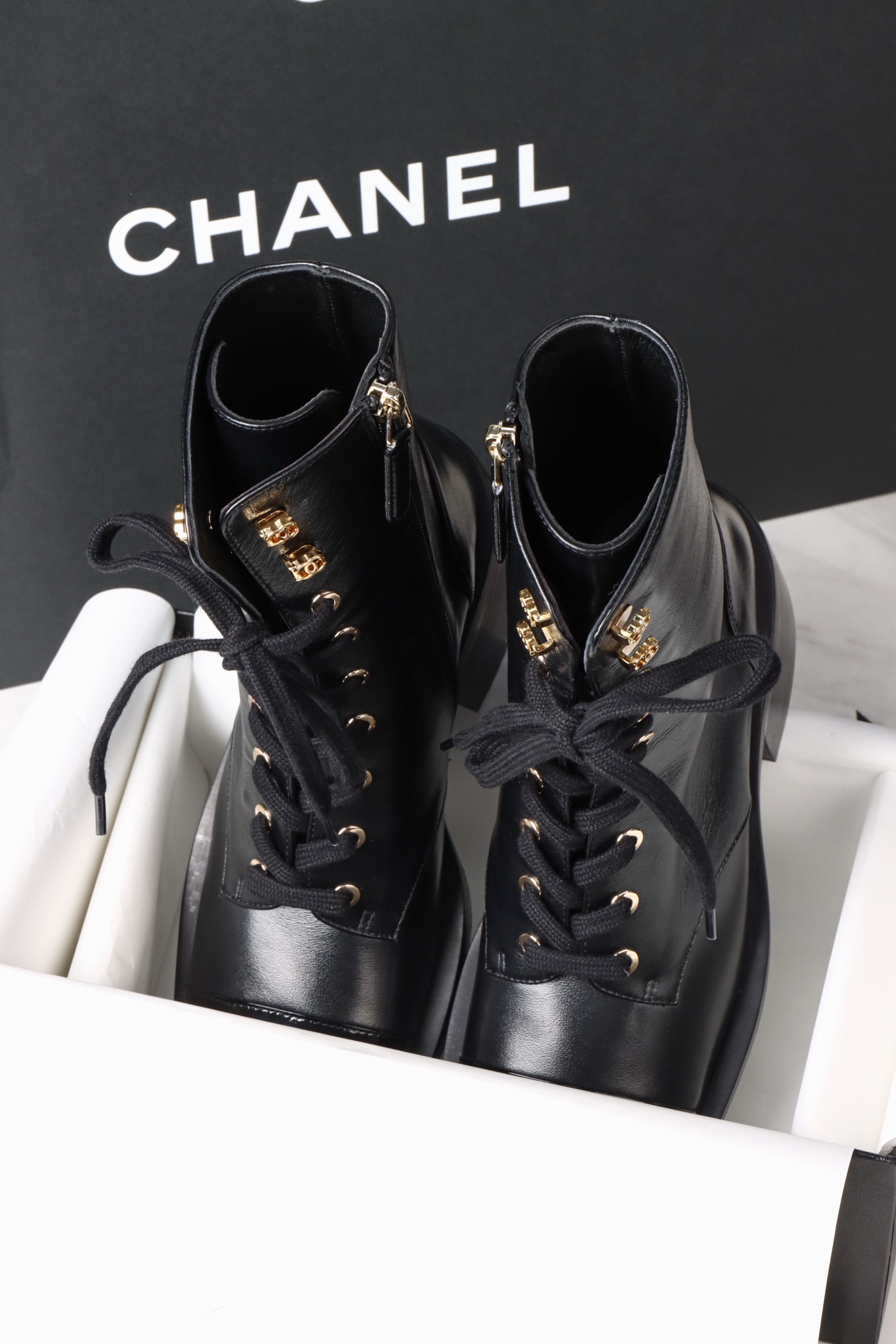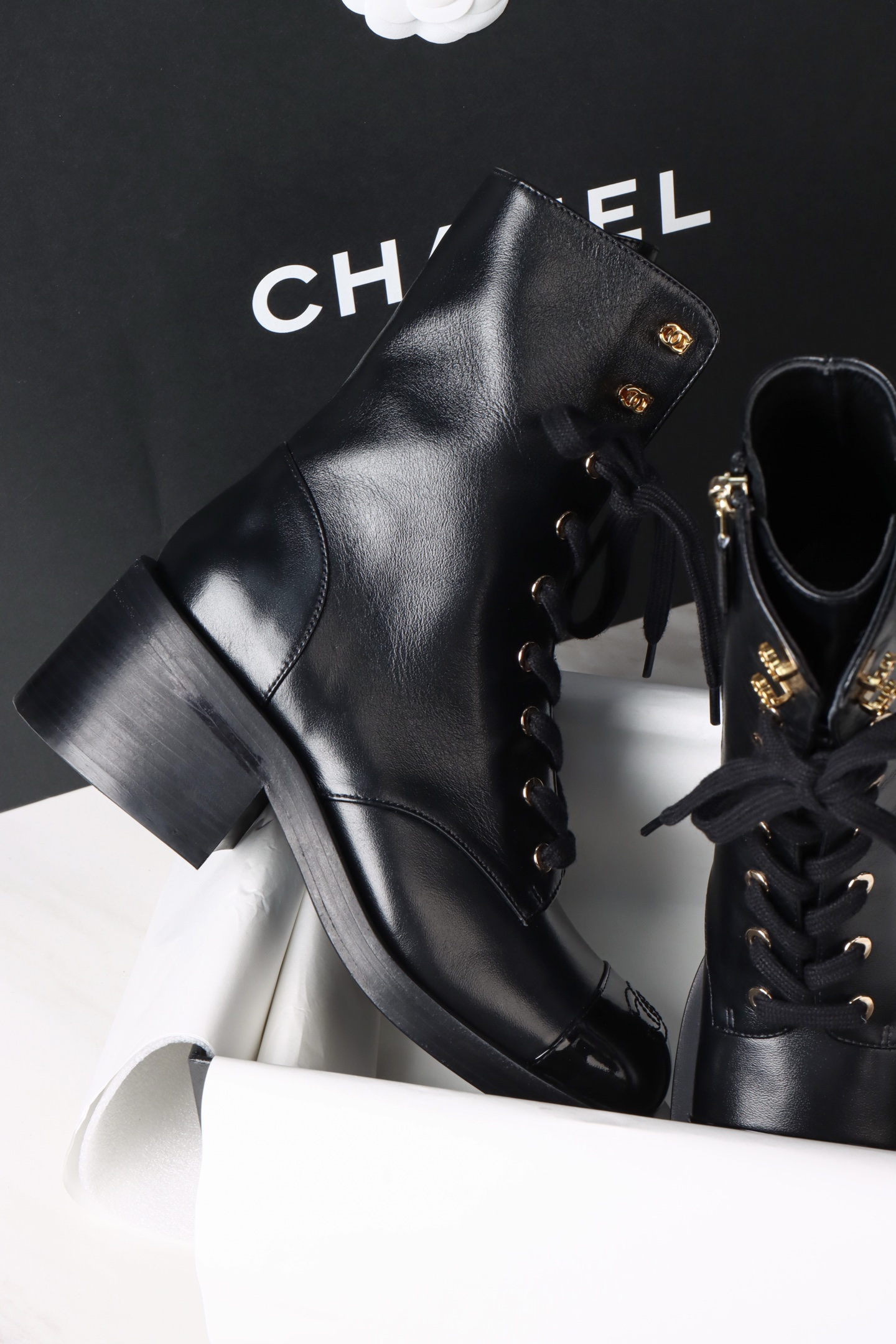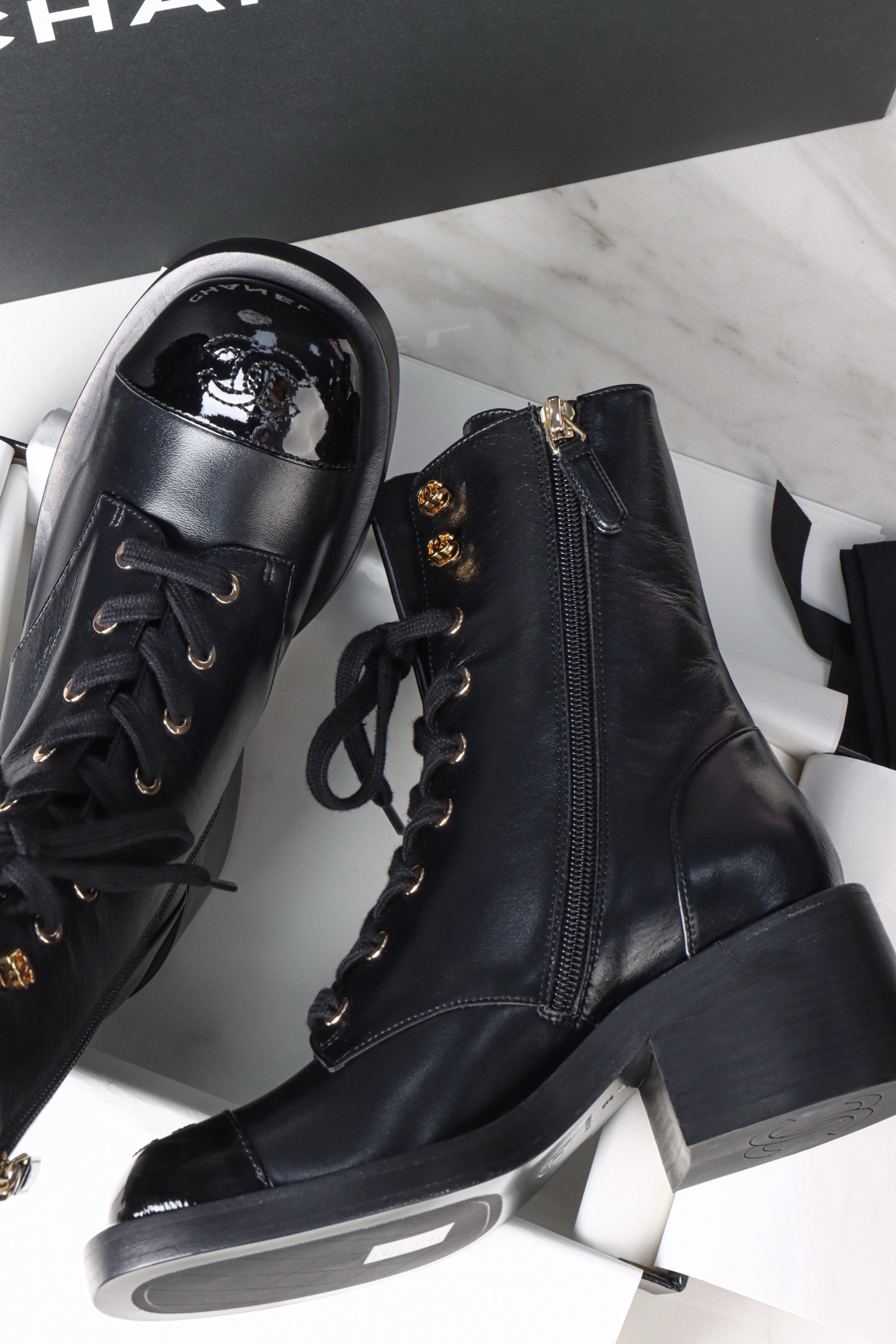 Chanel 25A Black Patent Martin Boots. Bold black patent Martin-style boots from the exclusive 25A collection. Premium patent leather with signature Chanel detailing. Sizes 35-41.
