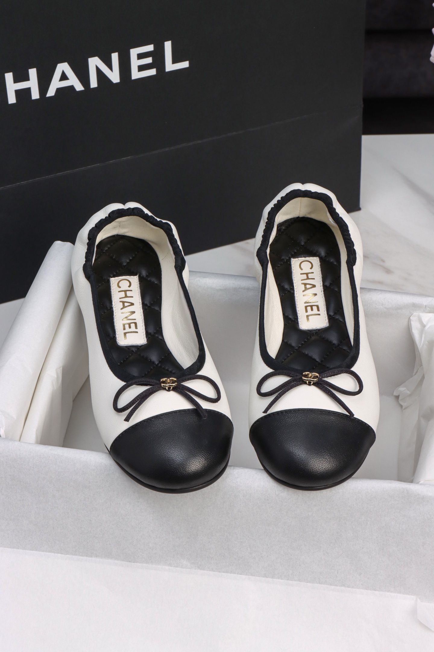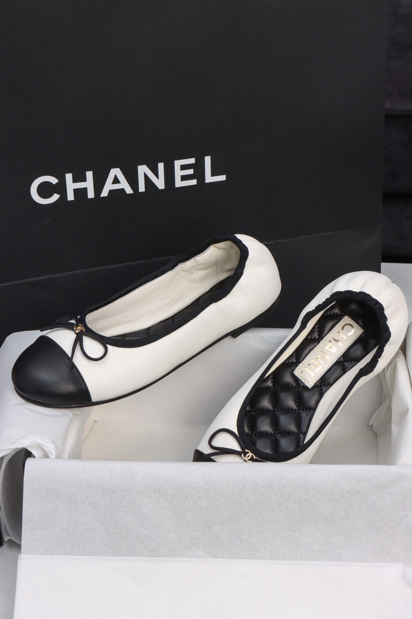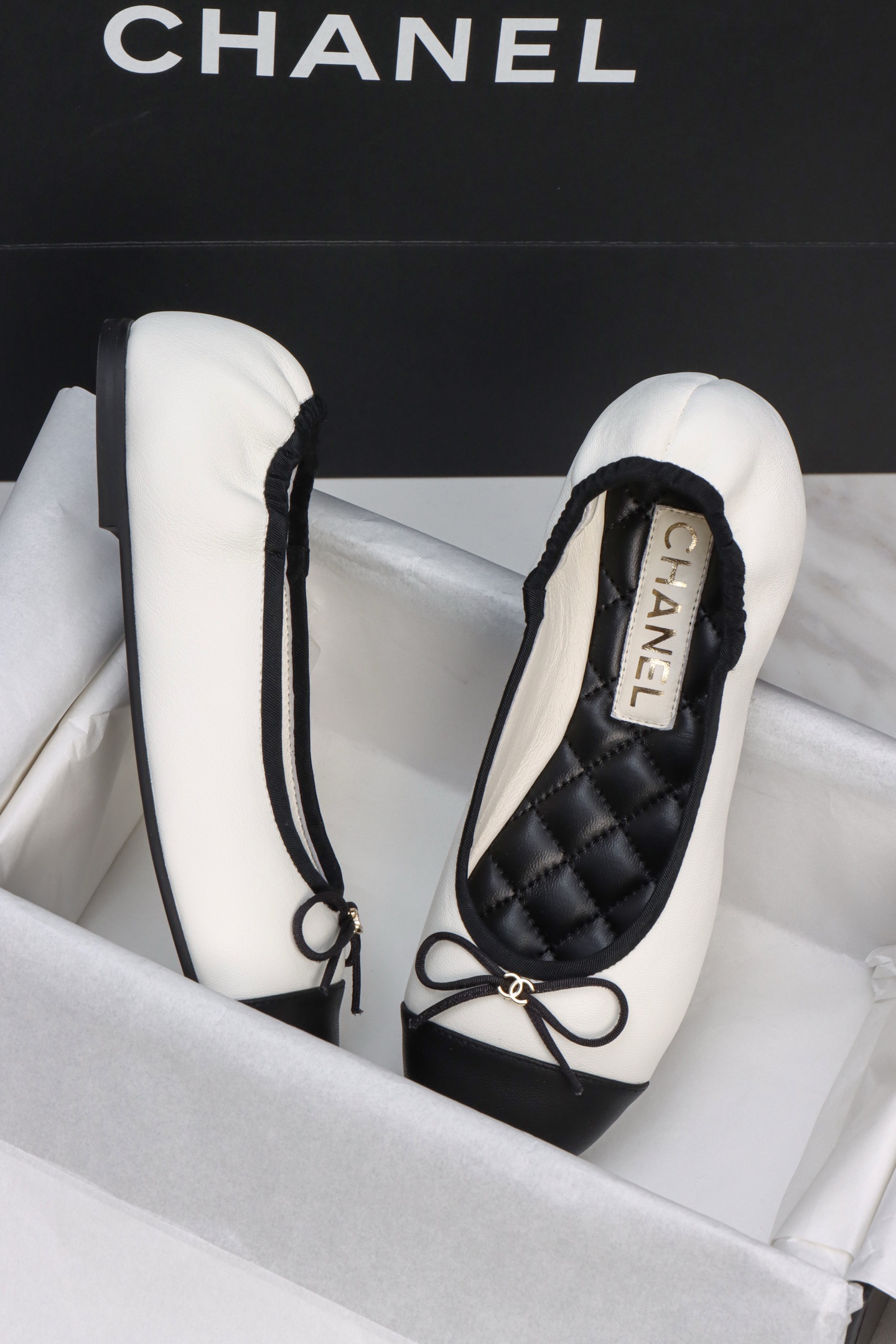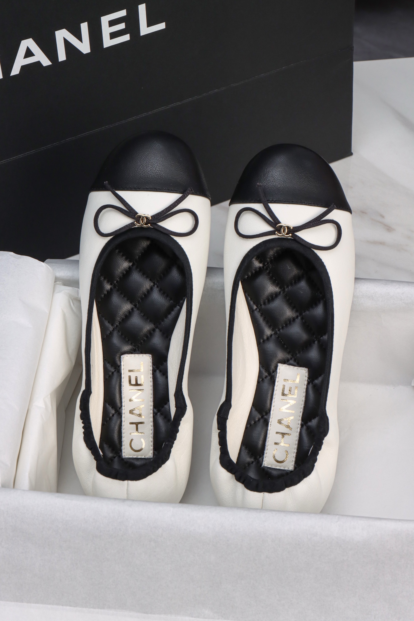 Chanel 25C Black White Bow Ruffle Ballet Flats. Two-tone black and white ballet flats with bow and ruffle detail from the 25C collection. Premium leather. Sizes 35-41.