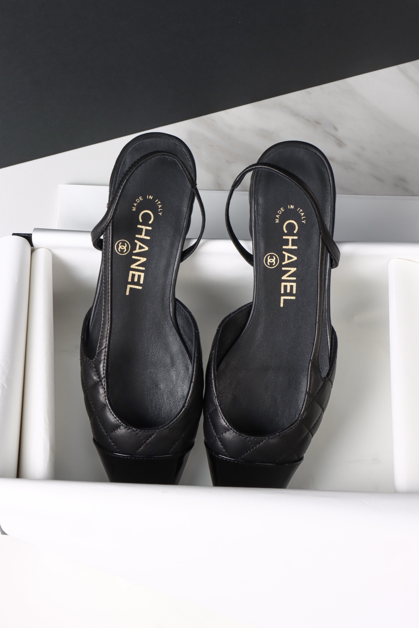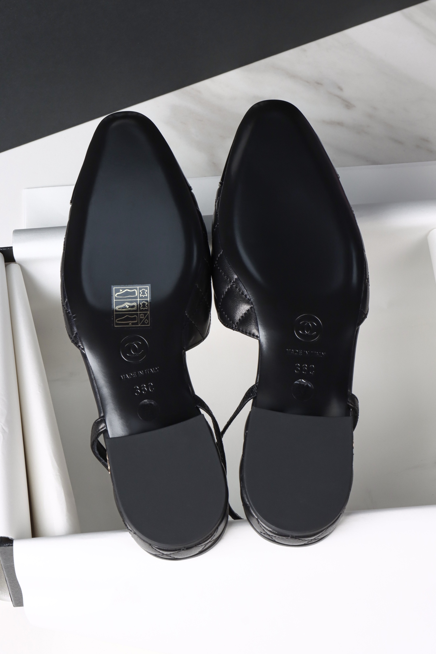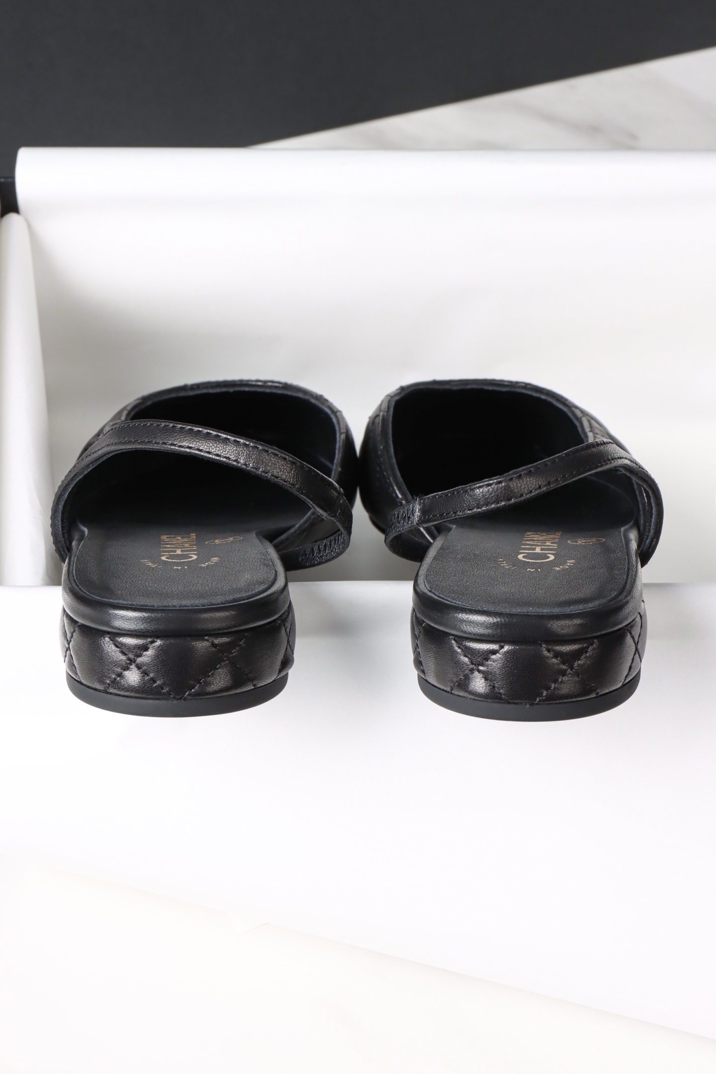Chanel 25K Black Quilted Flat Slingback. Elegant black quilted flat slingback from the 25K collection. Signature Chanel craftsmanship with comfortable flat heel. Sizes 34-38 including half sizes.