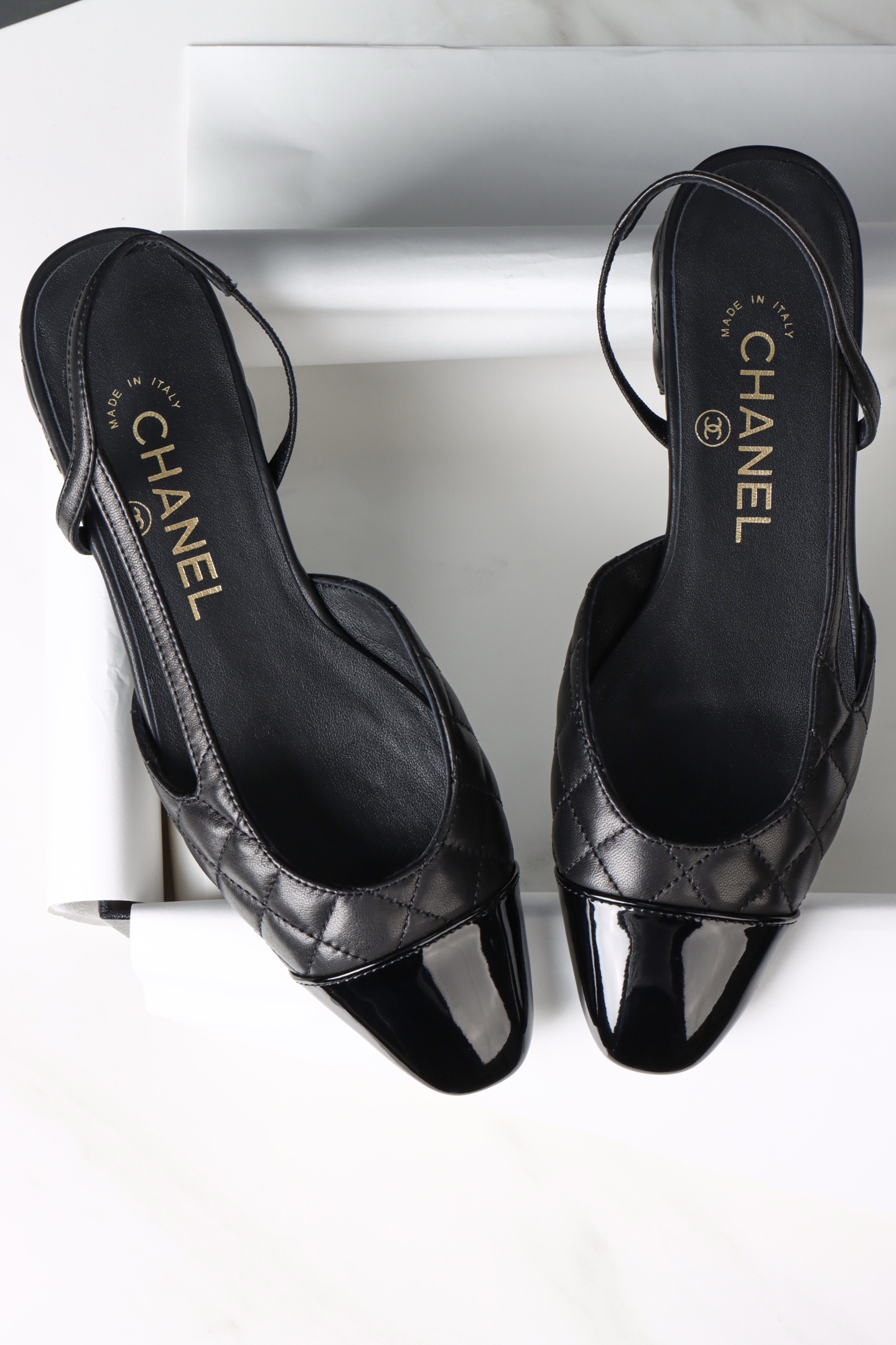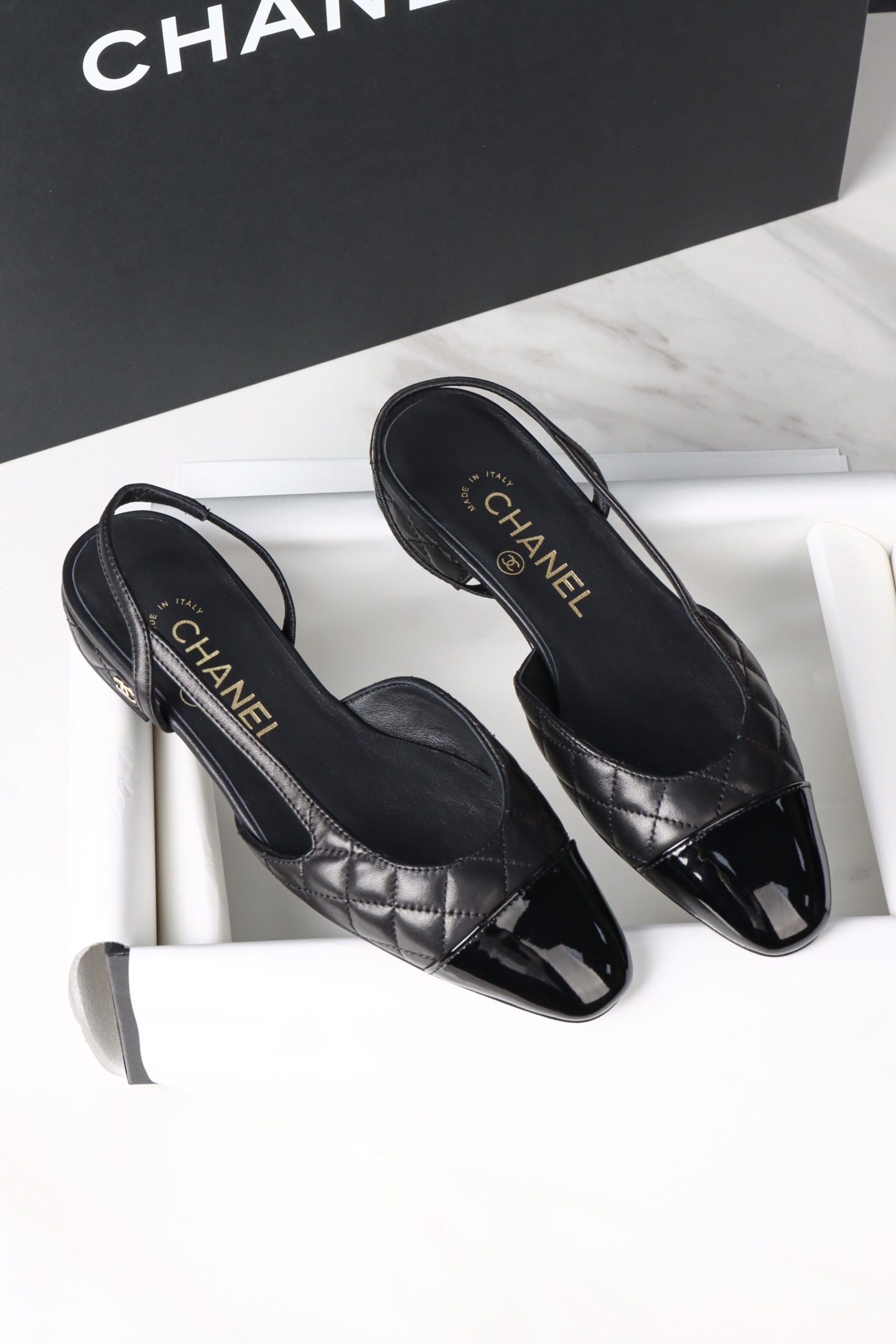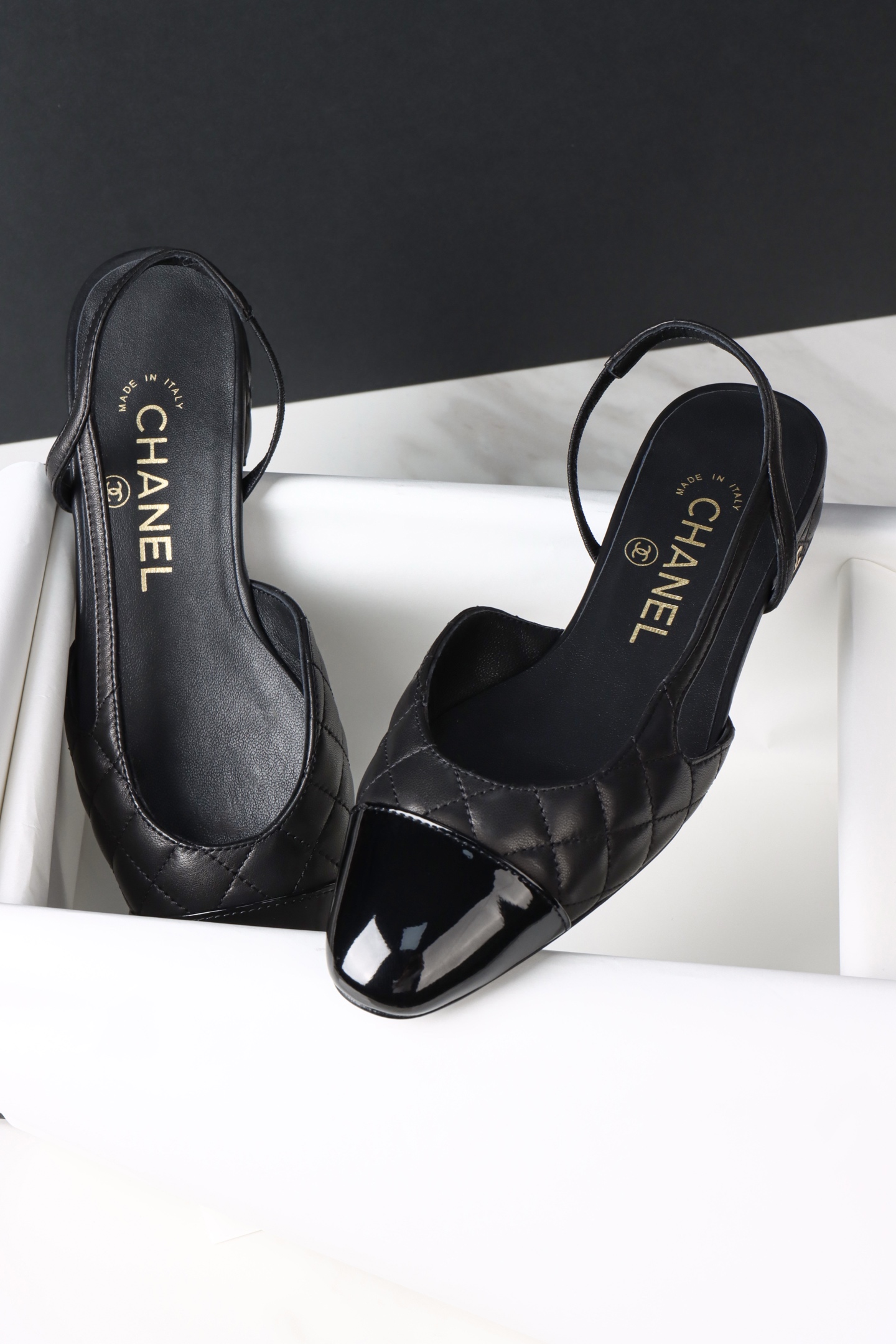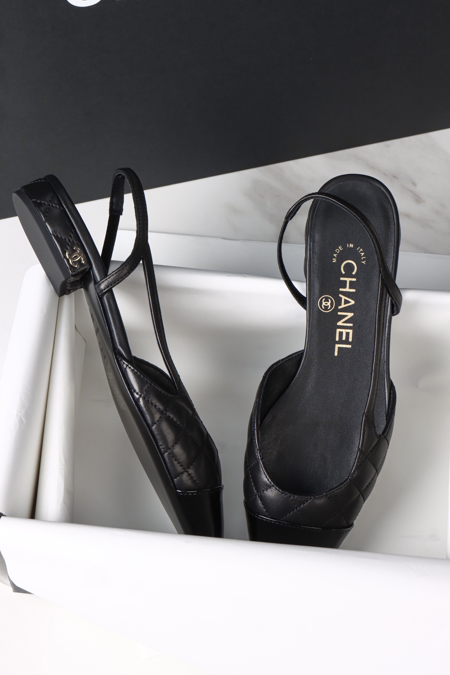 Chanel 25K Black Quilted Flat Slingback. Elegant black quilted flat slingback from the 25K collection. Signature Chanel craftsmanship with comfortable flat heel. Sizes 34-38 including half sizes.