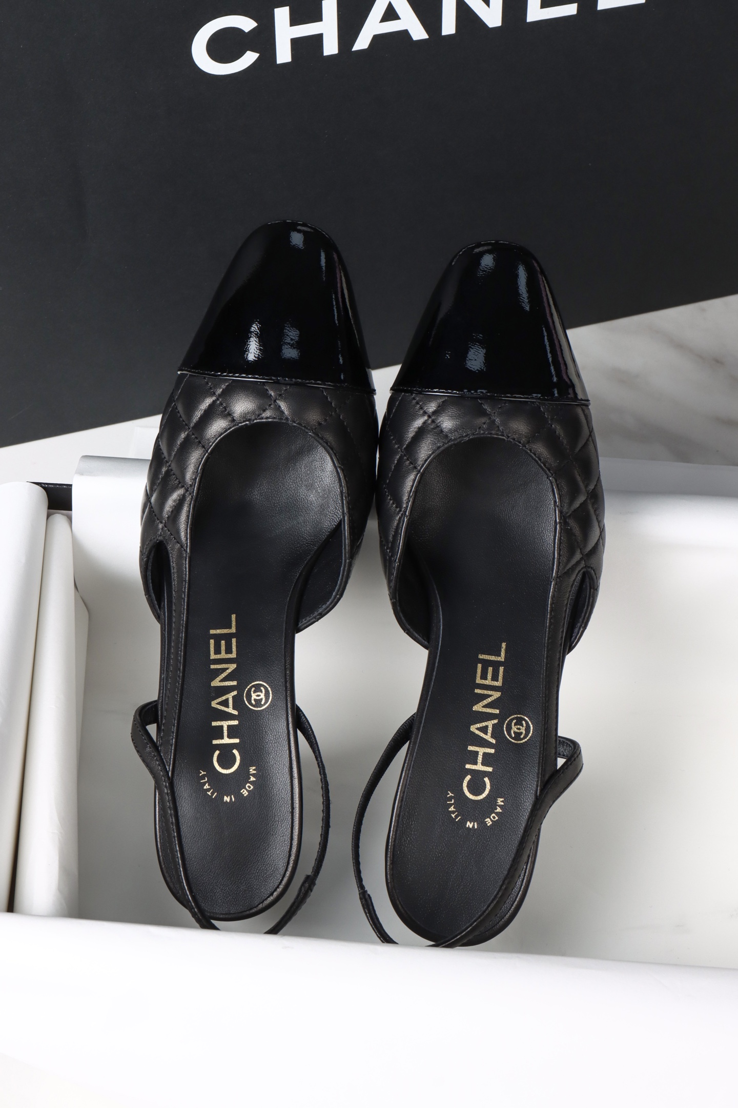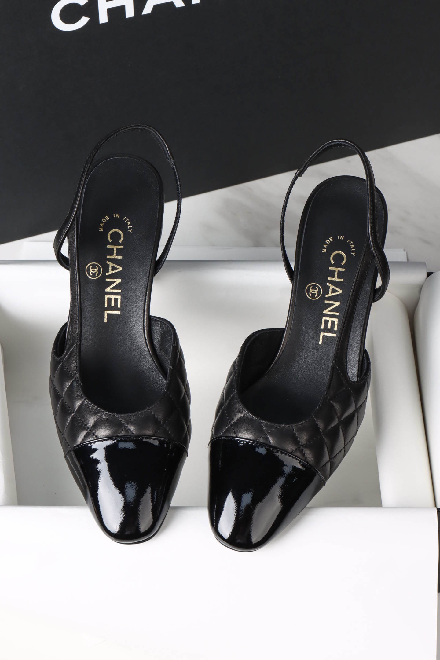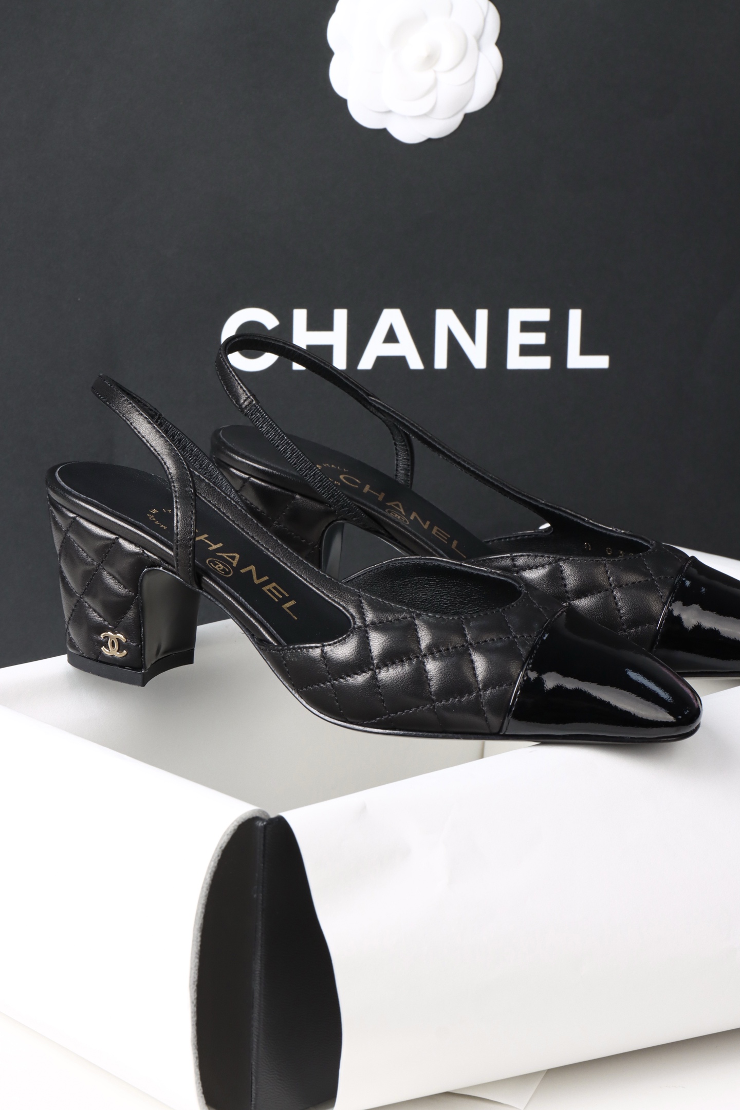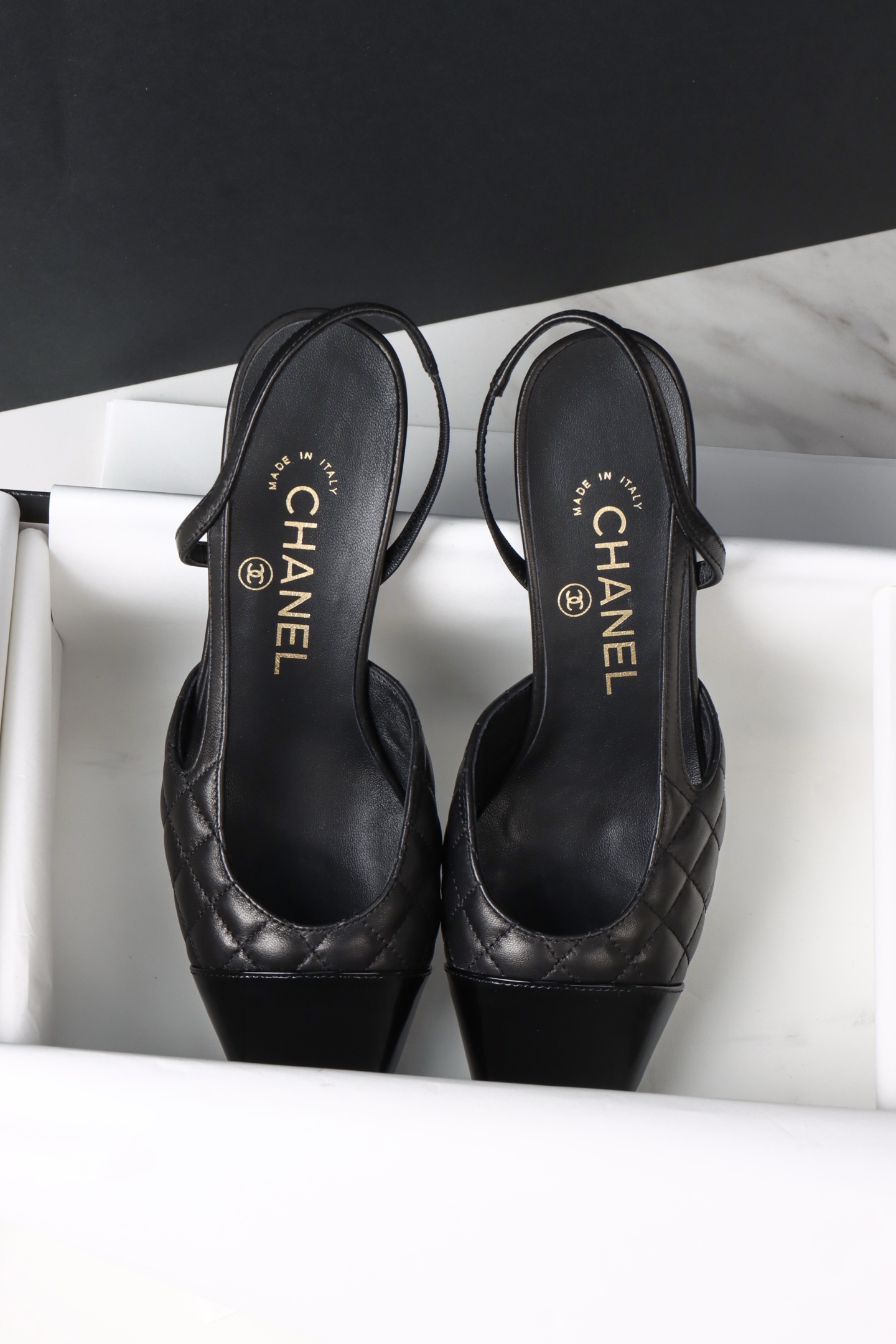 Chanel 25K Black Quilted High Heel Slingback. Luxurious black quilted high heel slingback from the 25K collection. Signature Chanel craftsmanship with elegant silhouette. Sizes 34-38 including half sizes.