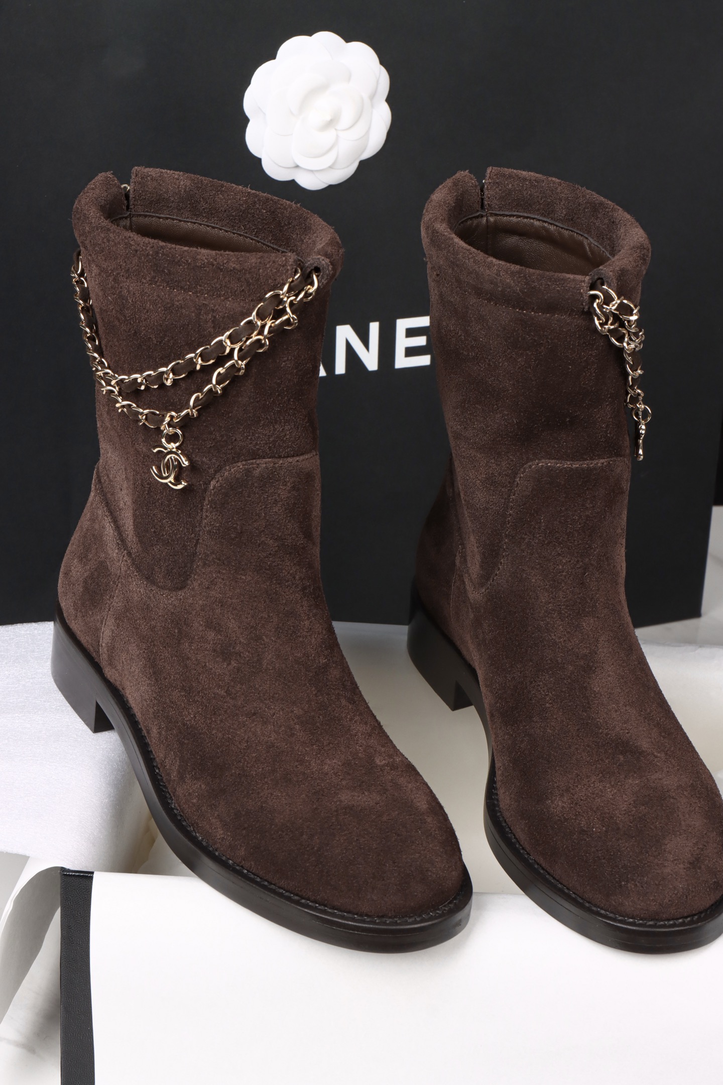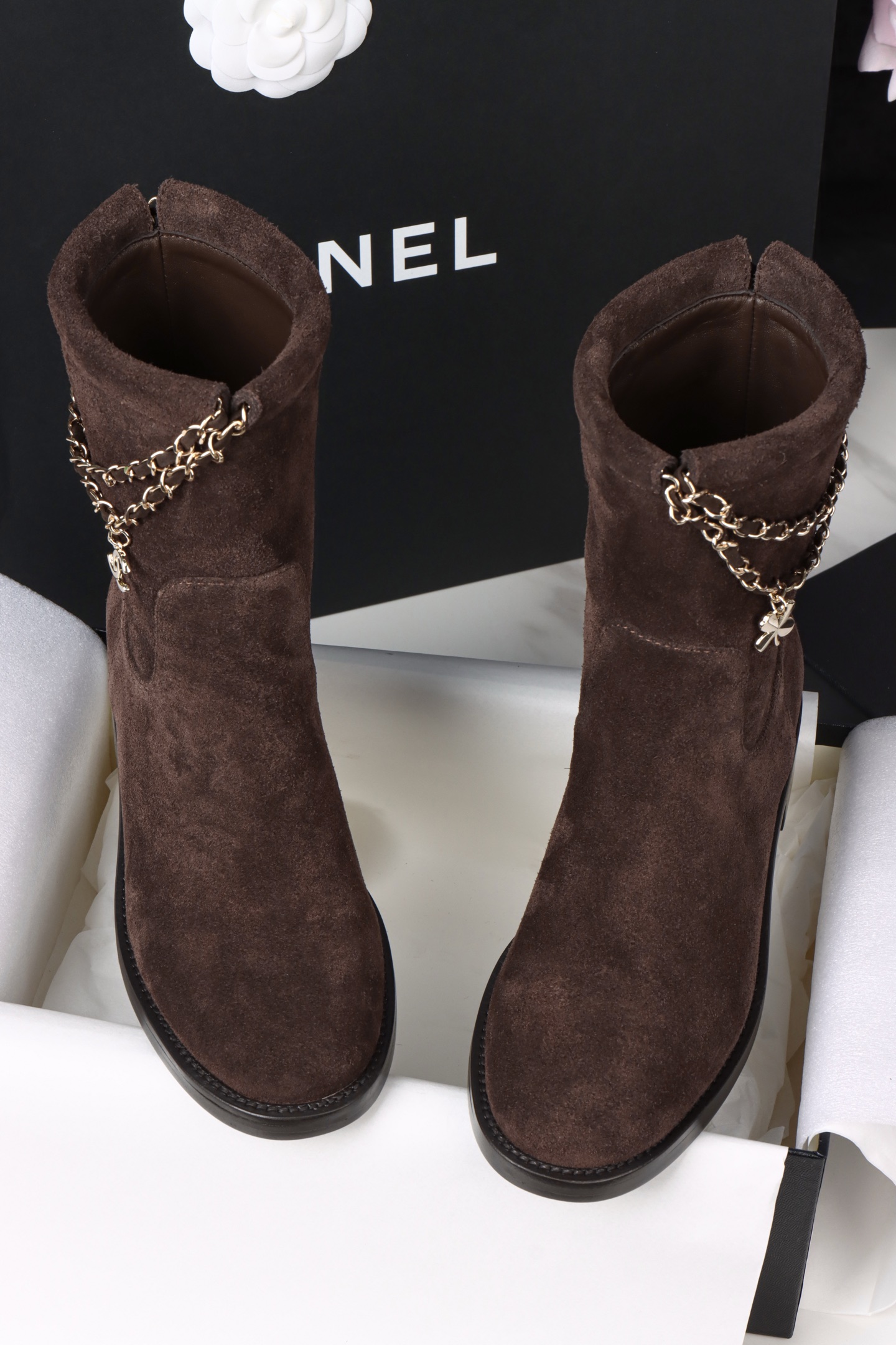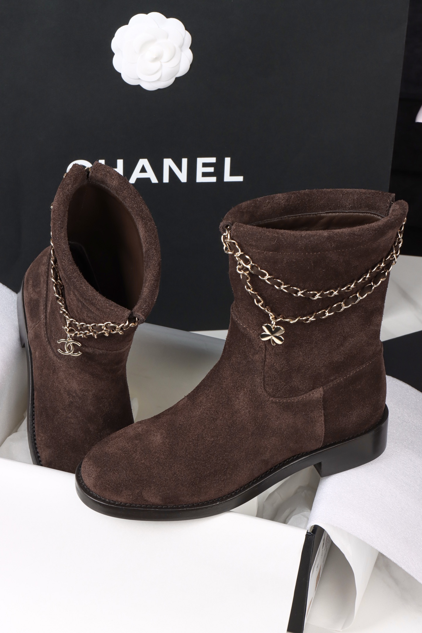 Chanel 25N Clover Chain Suede Short Boots. Elegant clover chain decorated suede short boots from the exclusive 25N collection. Sizes 35-41.