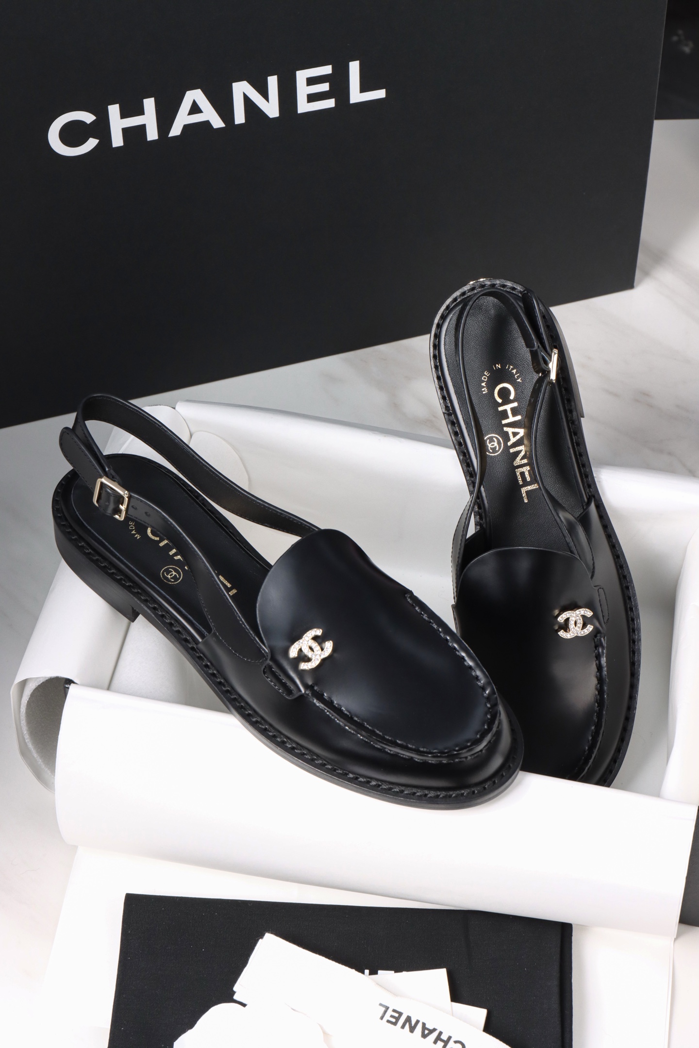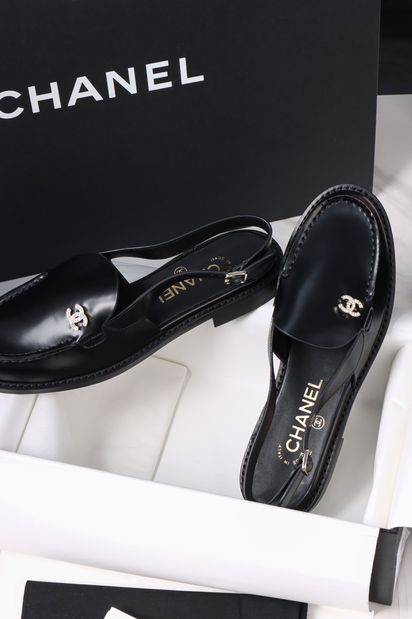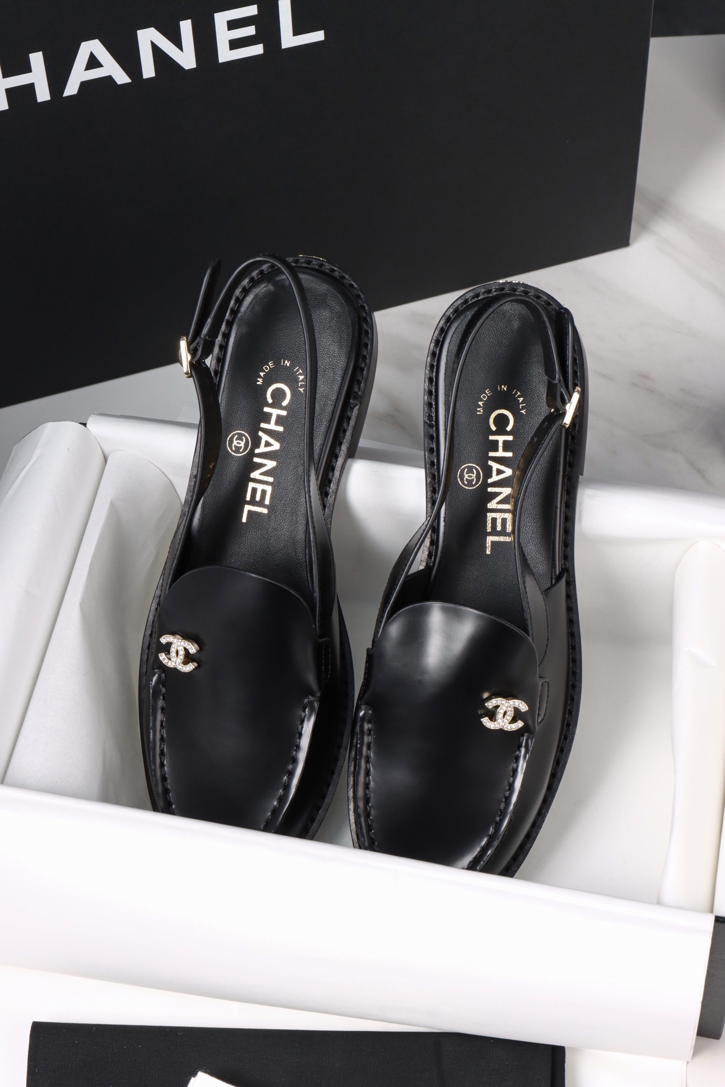 Chanel 25P Black Open-Toe Single Shoes. Chic black open-toe single shoes from the 25P collection. Premium leather with signature Chanel detailing. Sizes 35-41.