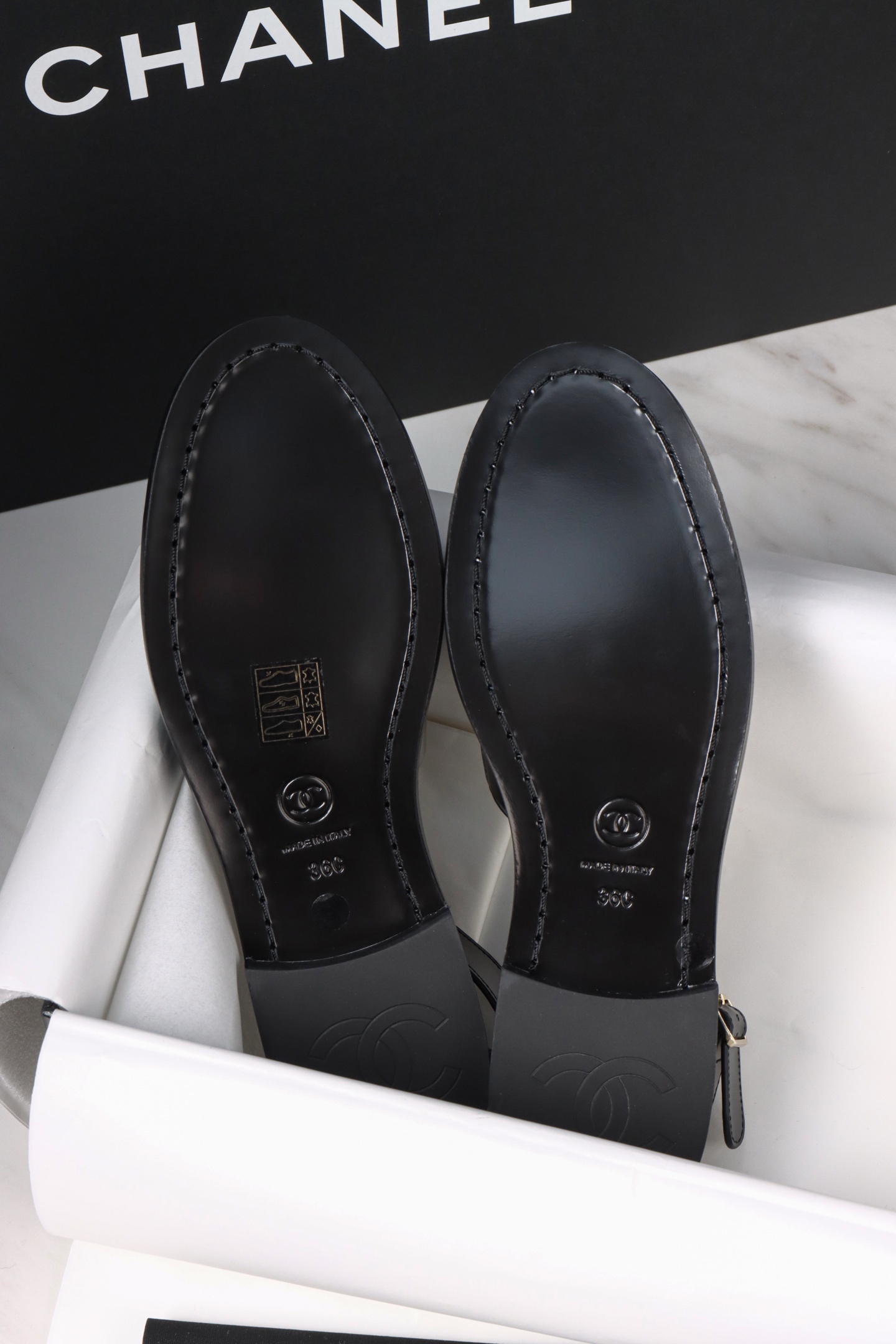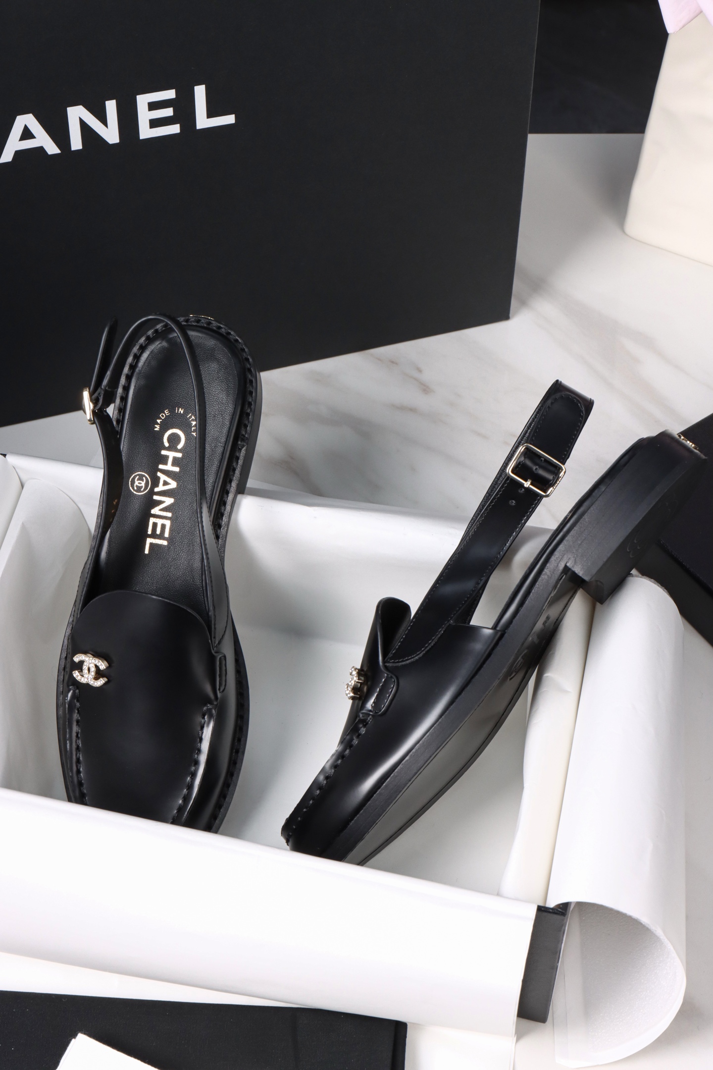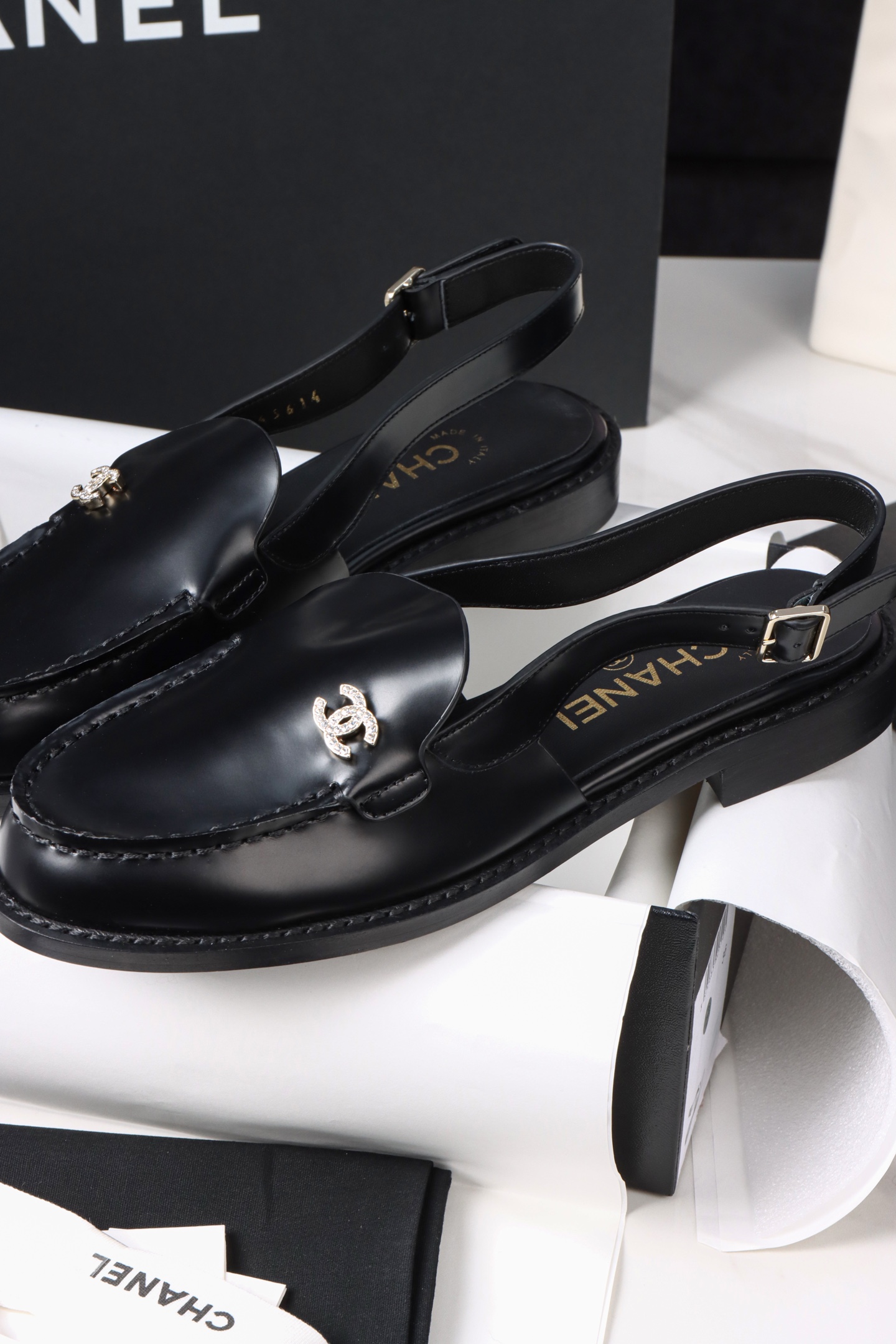 Chanel 25P Black Open-Toe Single Shoes. Chic black open-toe single shoes from the 25P collection. Premium leather with signature Chanel detailing. Sizes 35-41.
