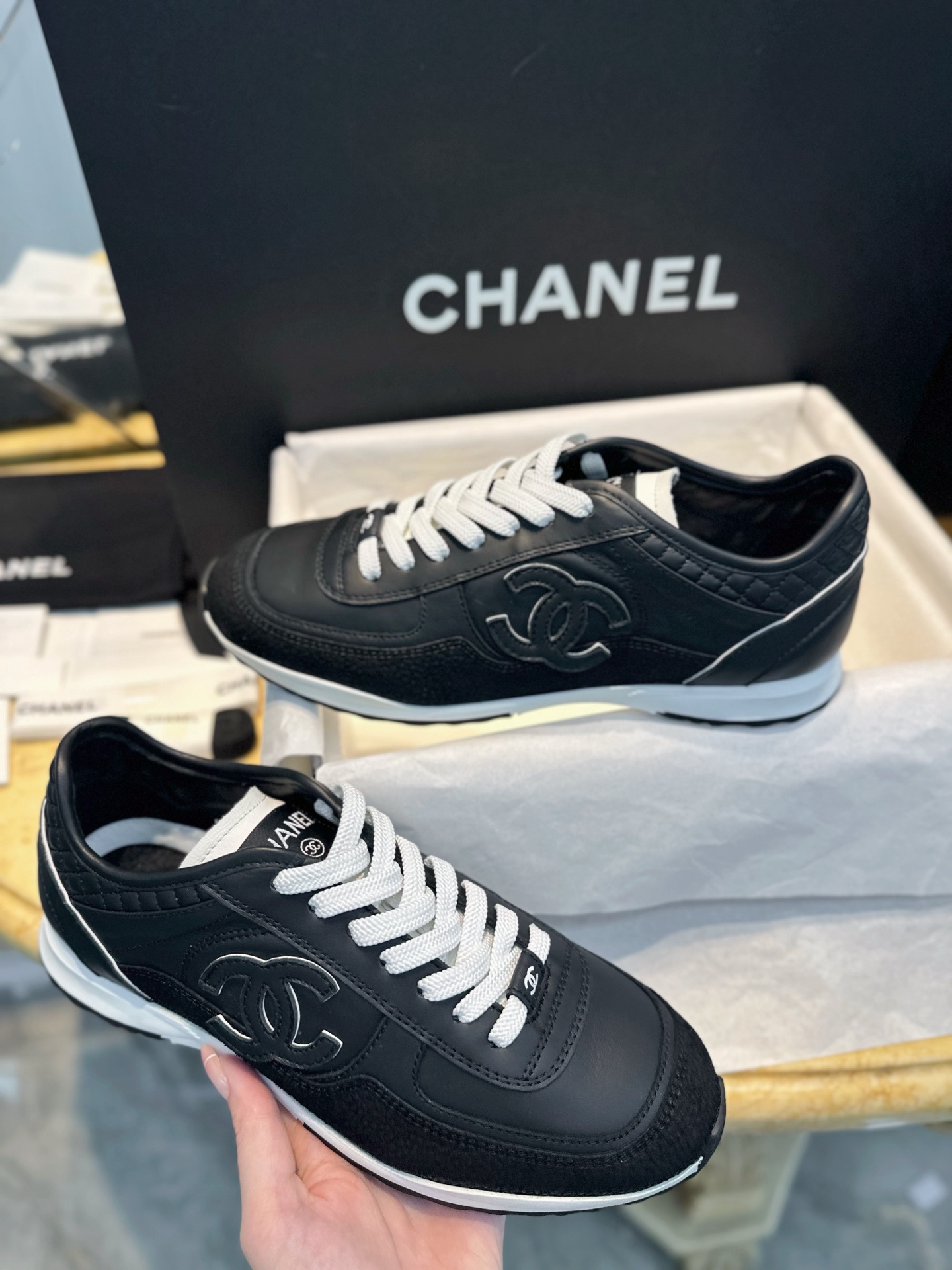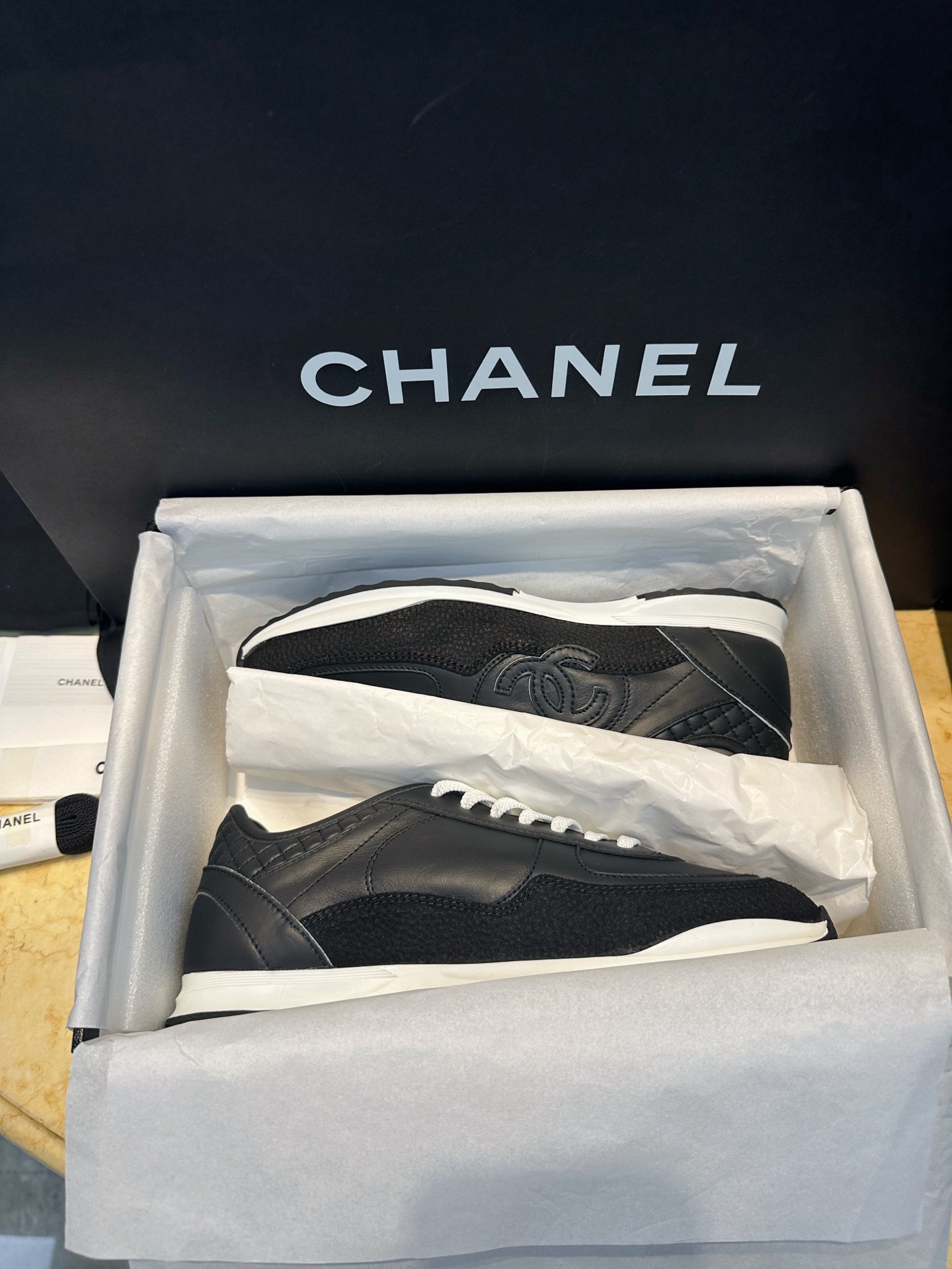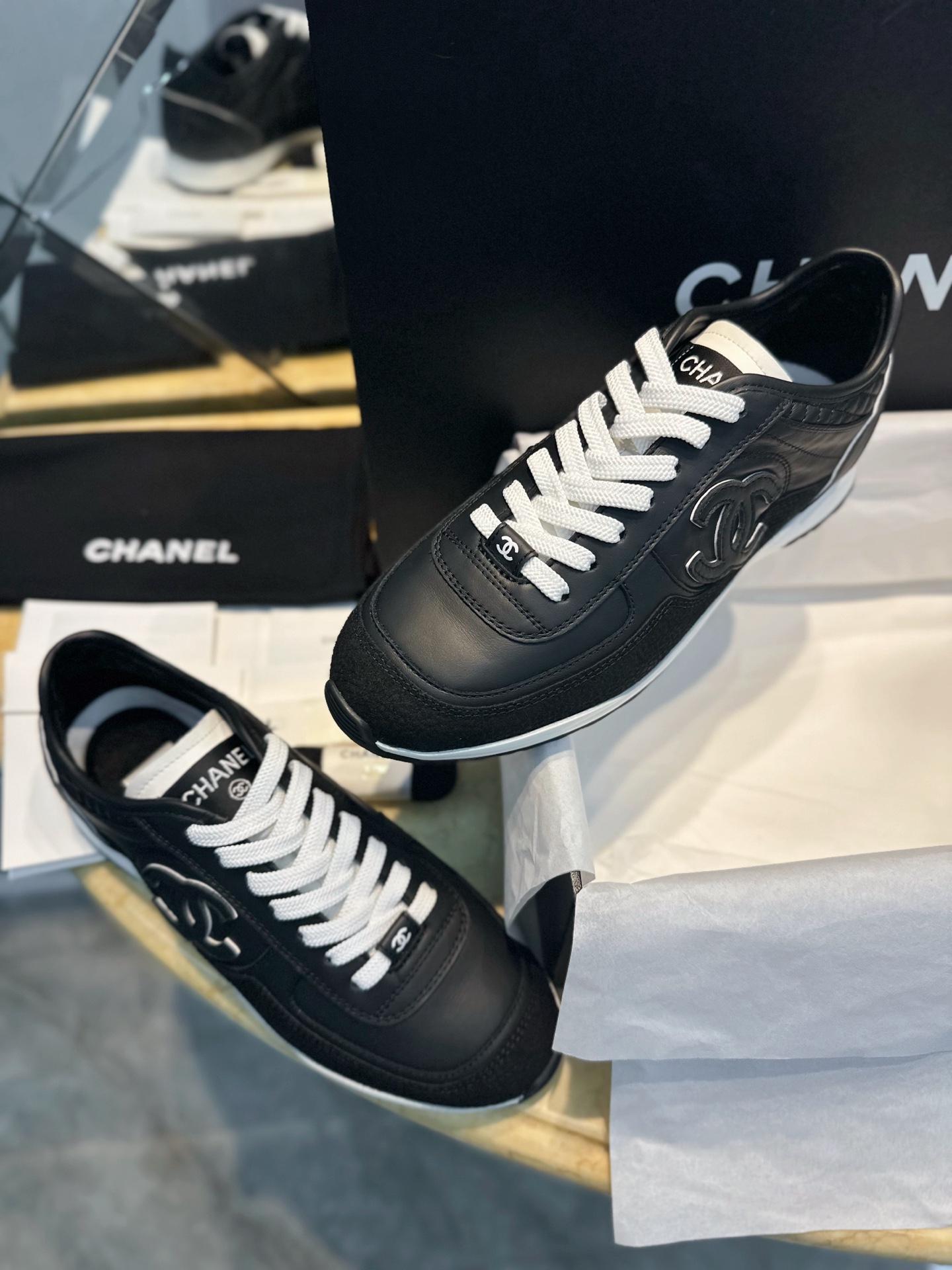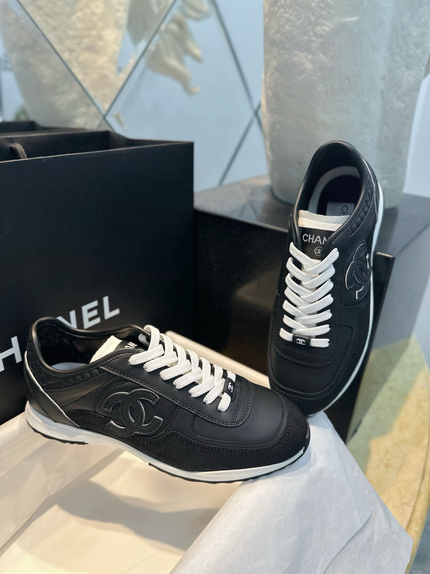Chanel 25P Black Thin-Sole Panda Sneakers. Stylish black and white panda colorway with thin sole design from the 25P collection. Premium leather construction. Sizes 35-39, 41.