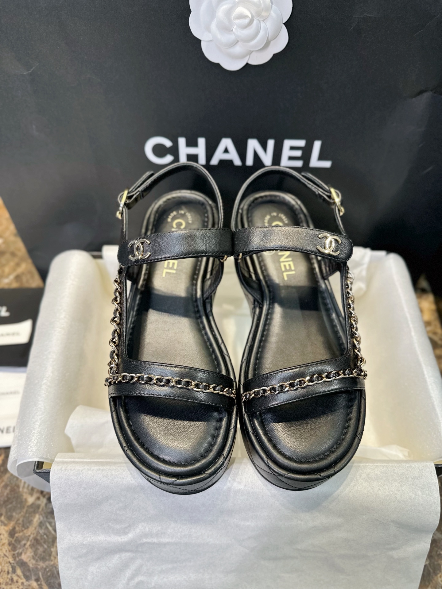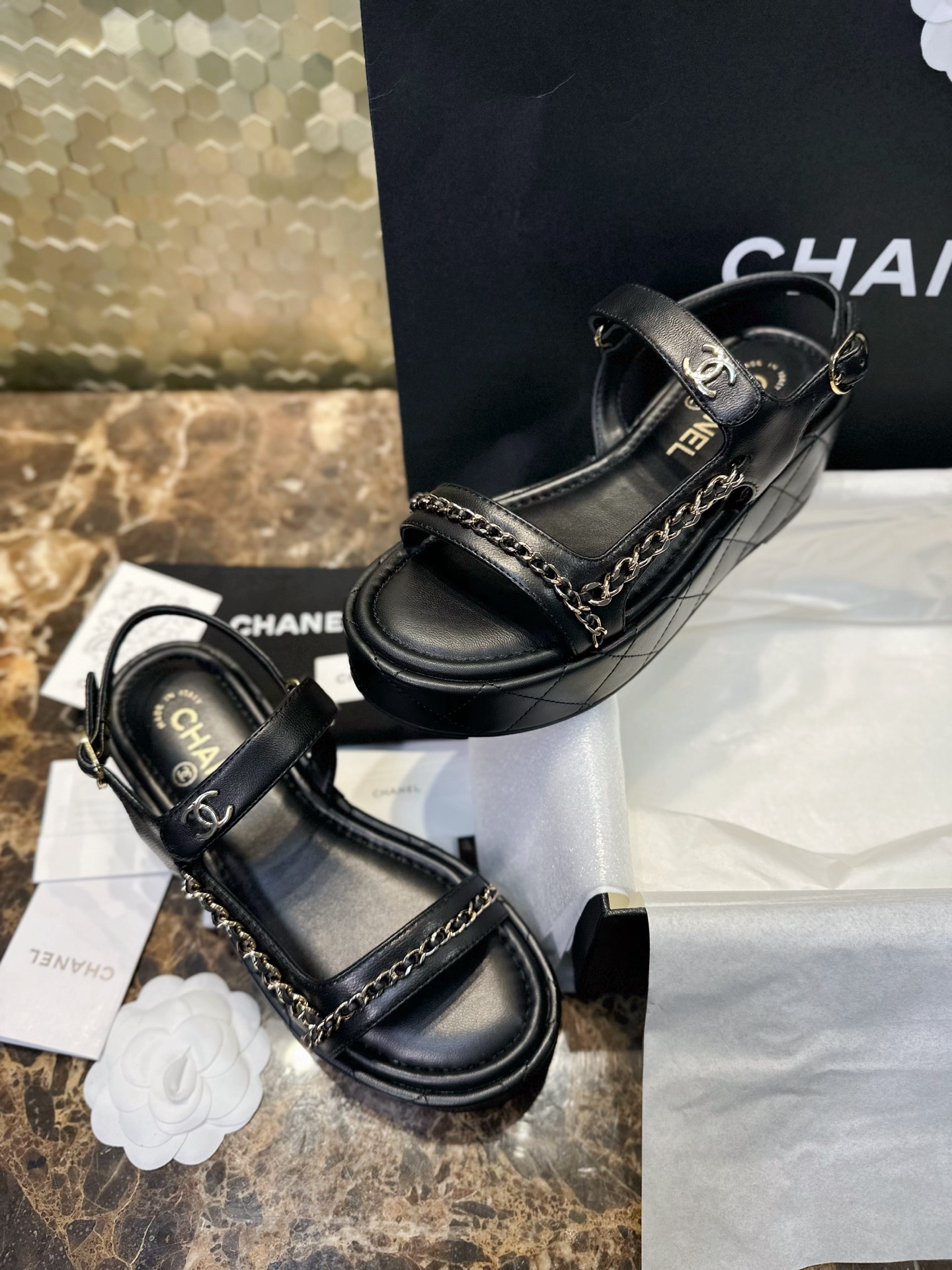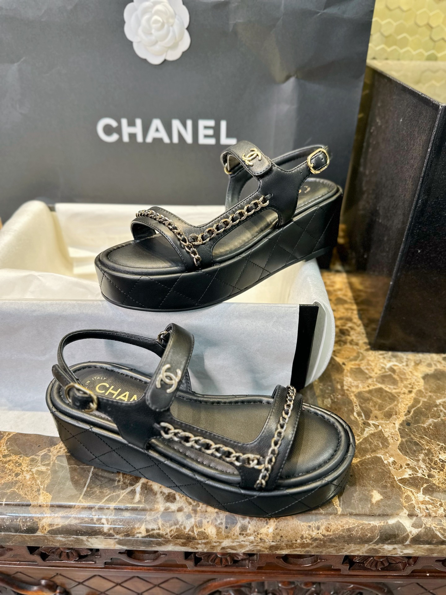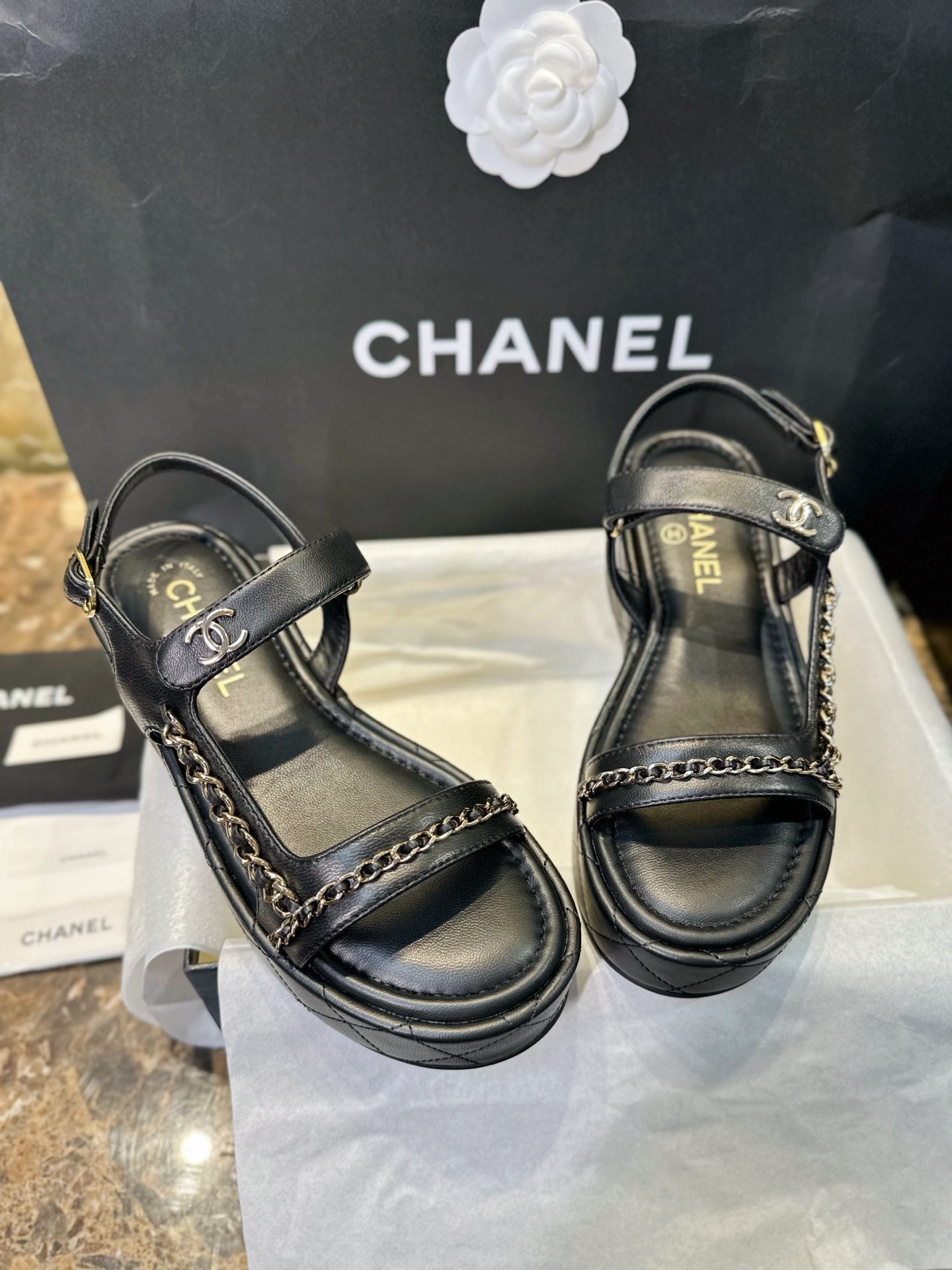 Chanel 25P Chunk Sole Chain Sandals. Trendy chunk sole sandals with signature chain detail from the 25P collection. Premium leather with modern design. Sizes 35-41.