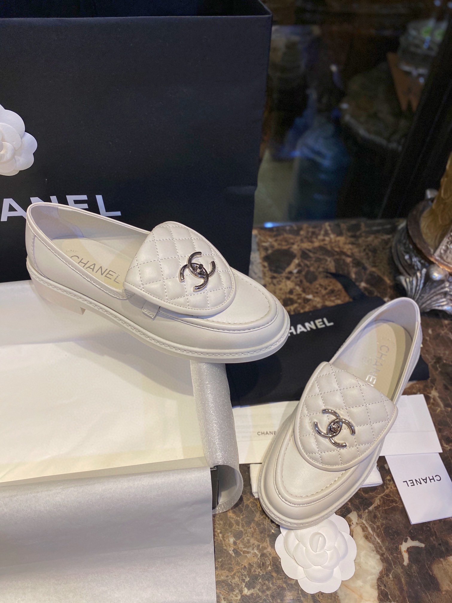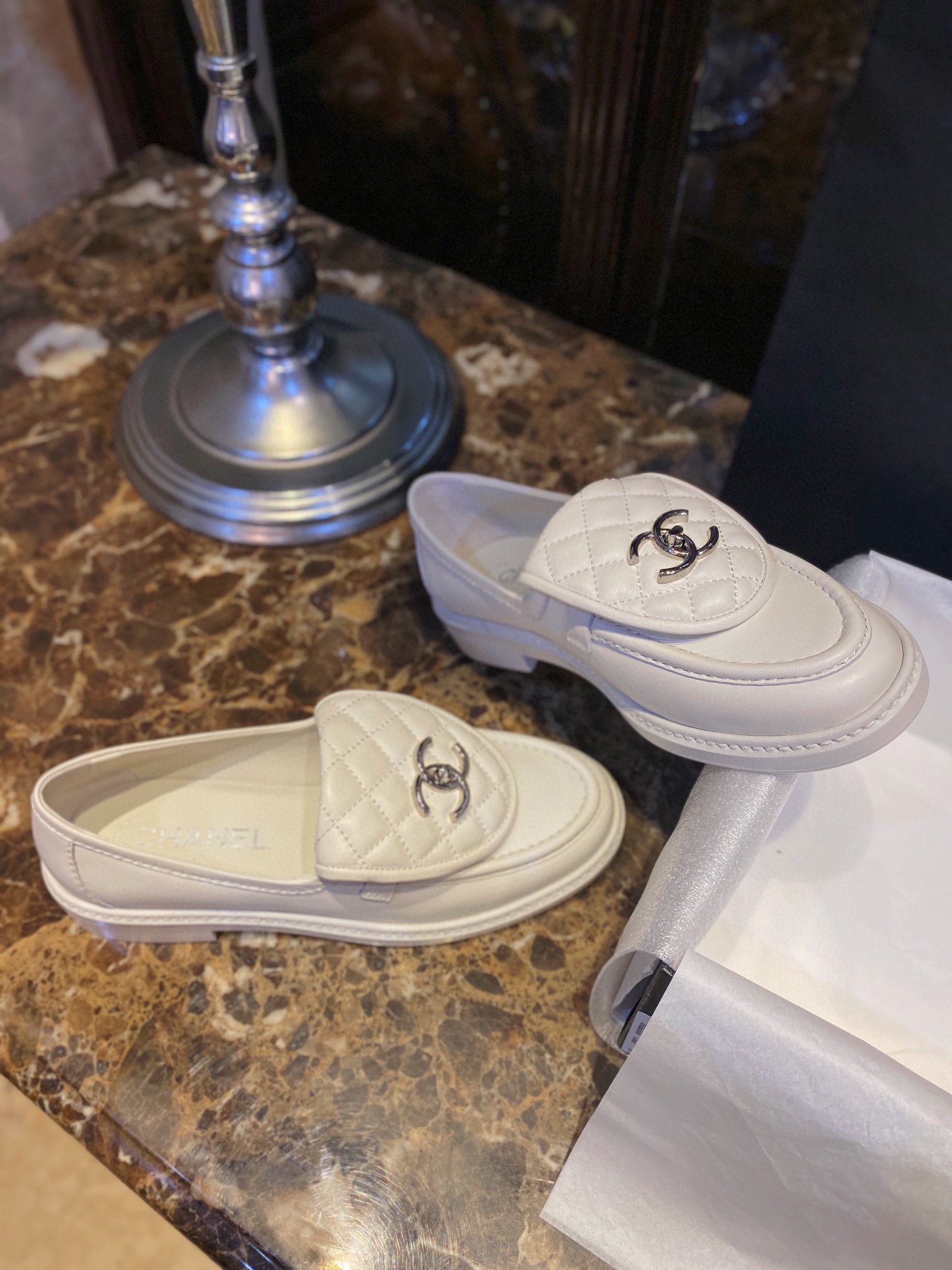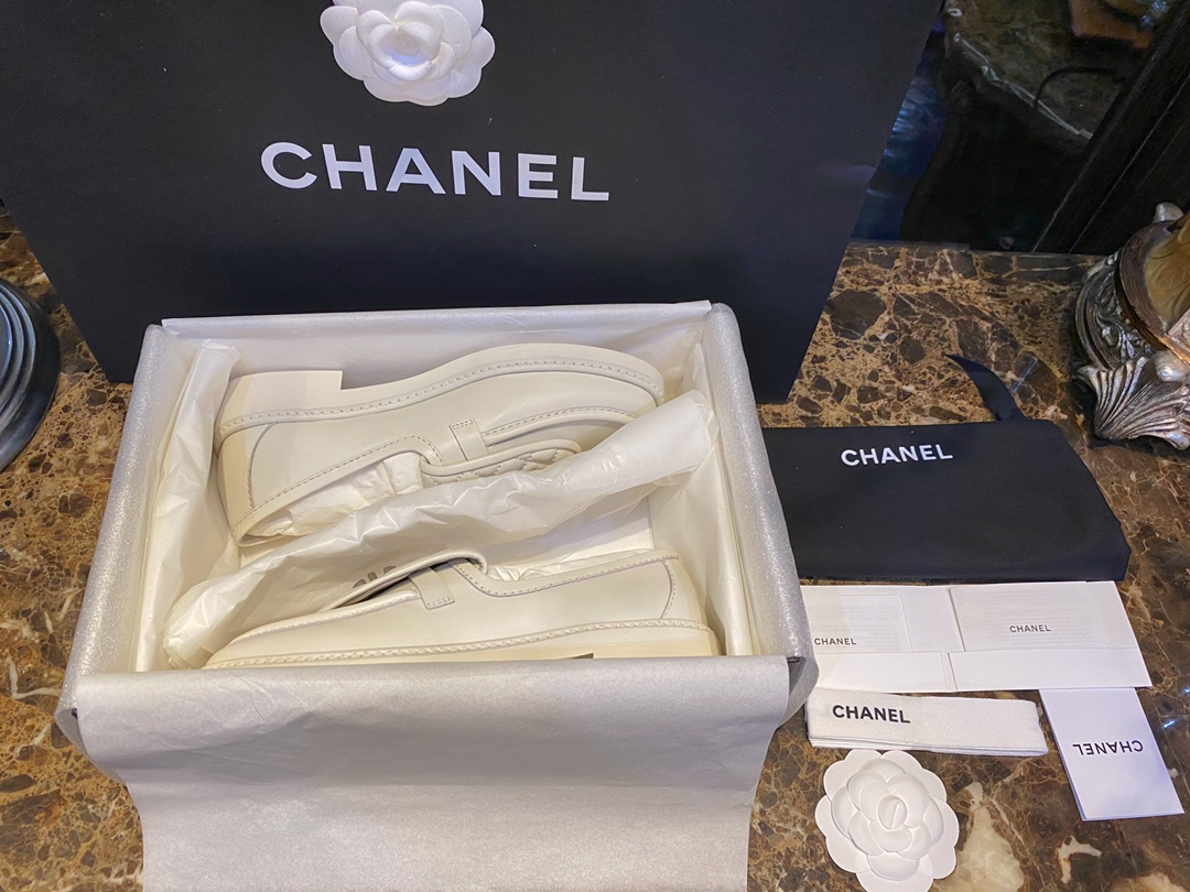 Chanel Backpack Buckle Loafers Milk White. Elegant milk white loafers with signature backpack buckle closure. Premium leather with refined craftsmanship. Sizes 35-41.