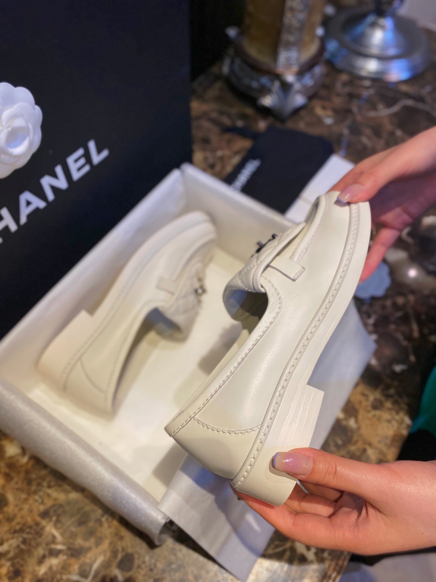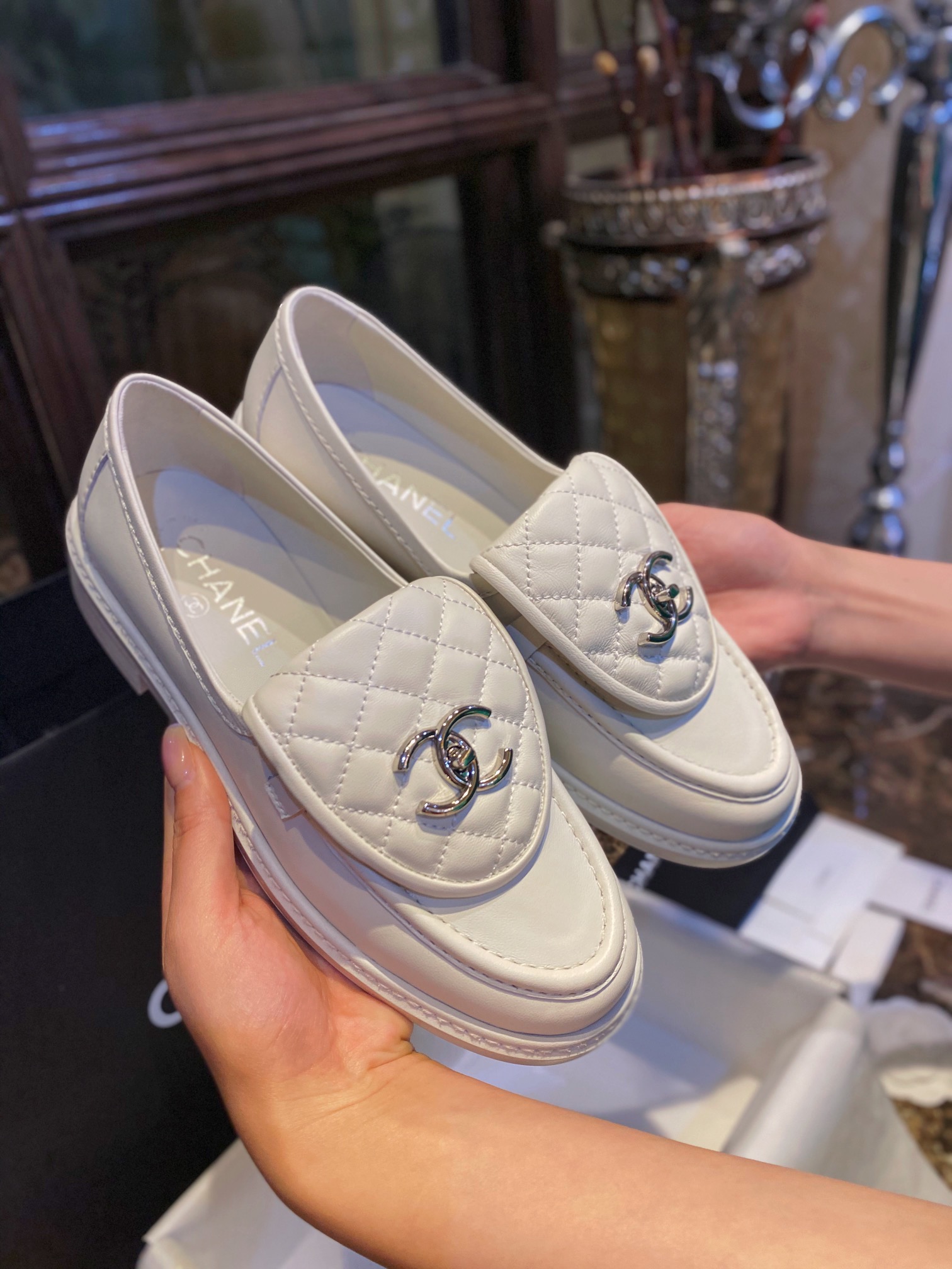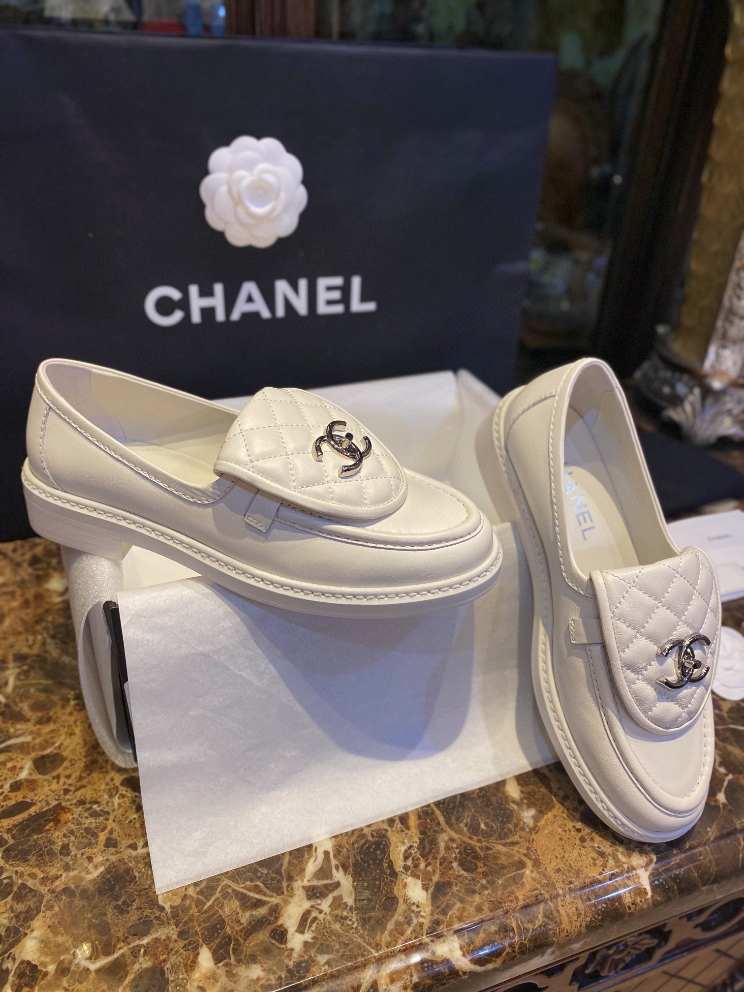 Chanel Backpack Buckle Loafers Milk White. Elegant milk white loafers with signature backpack buckle closure. Premium leather with refined craftsmanship. Sizes 35-41.
