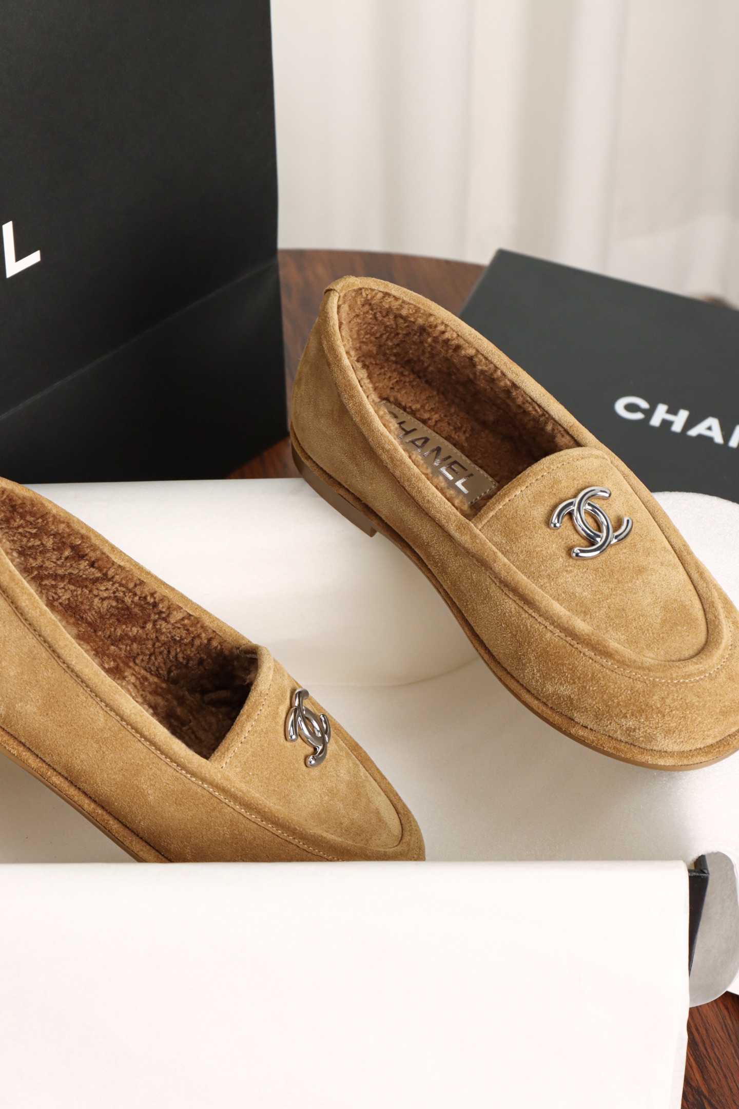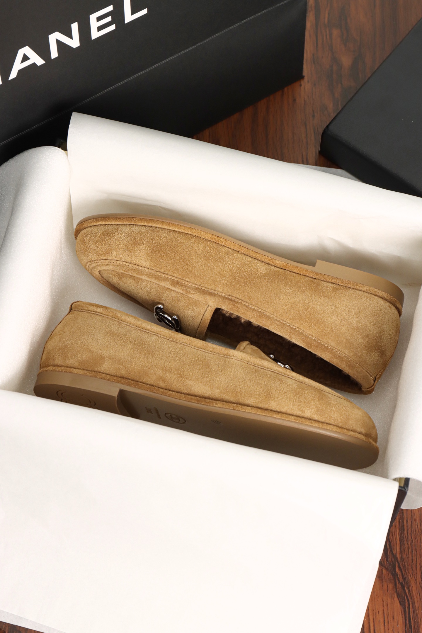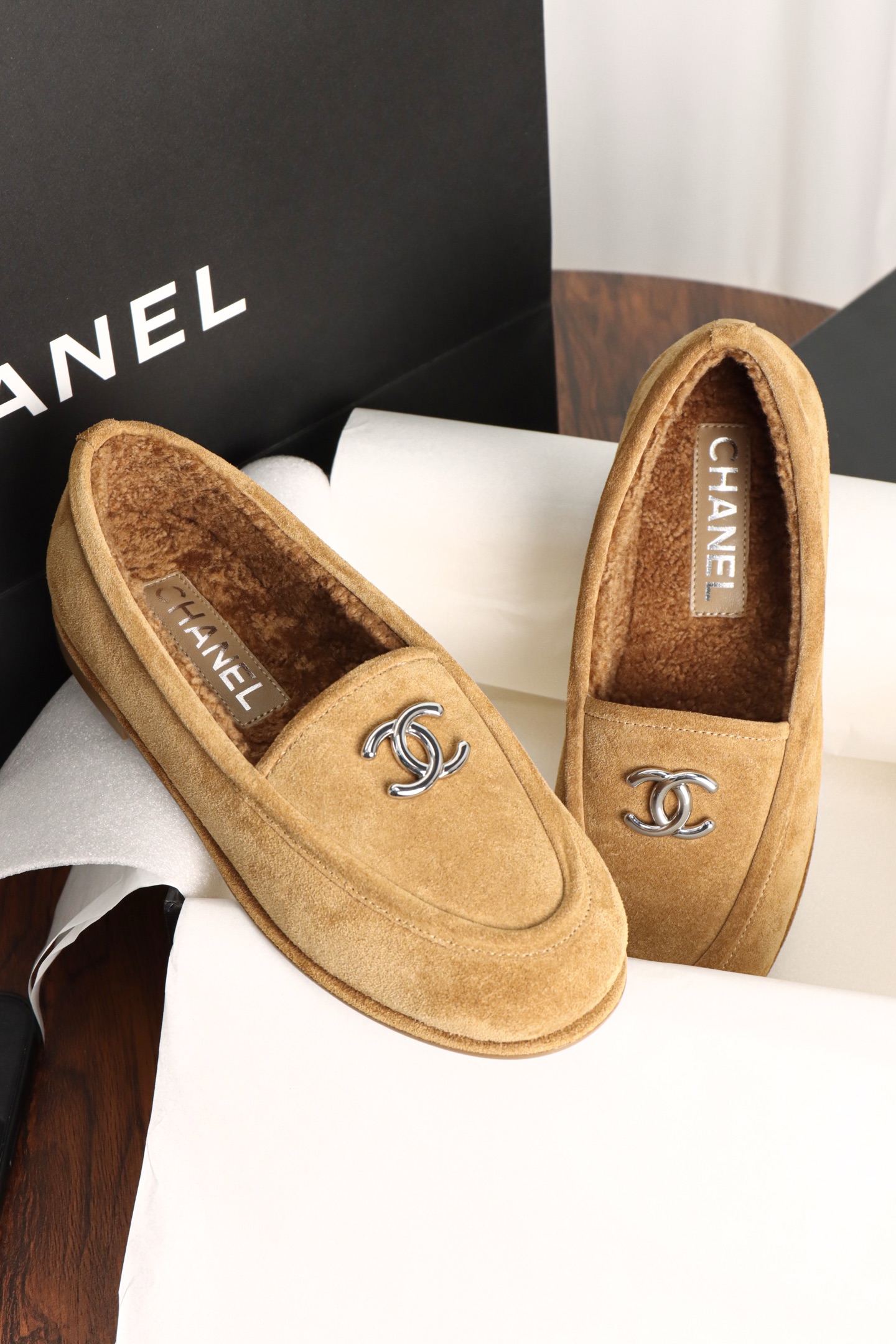 Chanel Maillard Fluffy Loafers. Warm Maillard brown fluffy loafers with signature Chanel craftsmanship. Premium materials. Sizes 35-41.