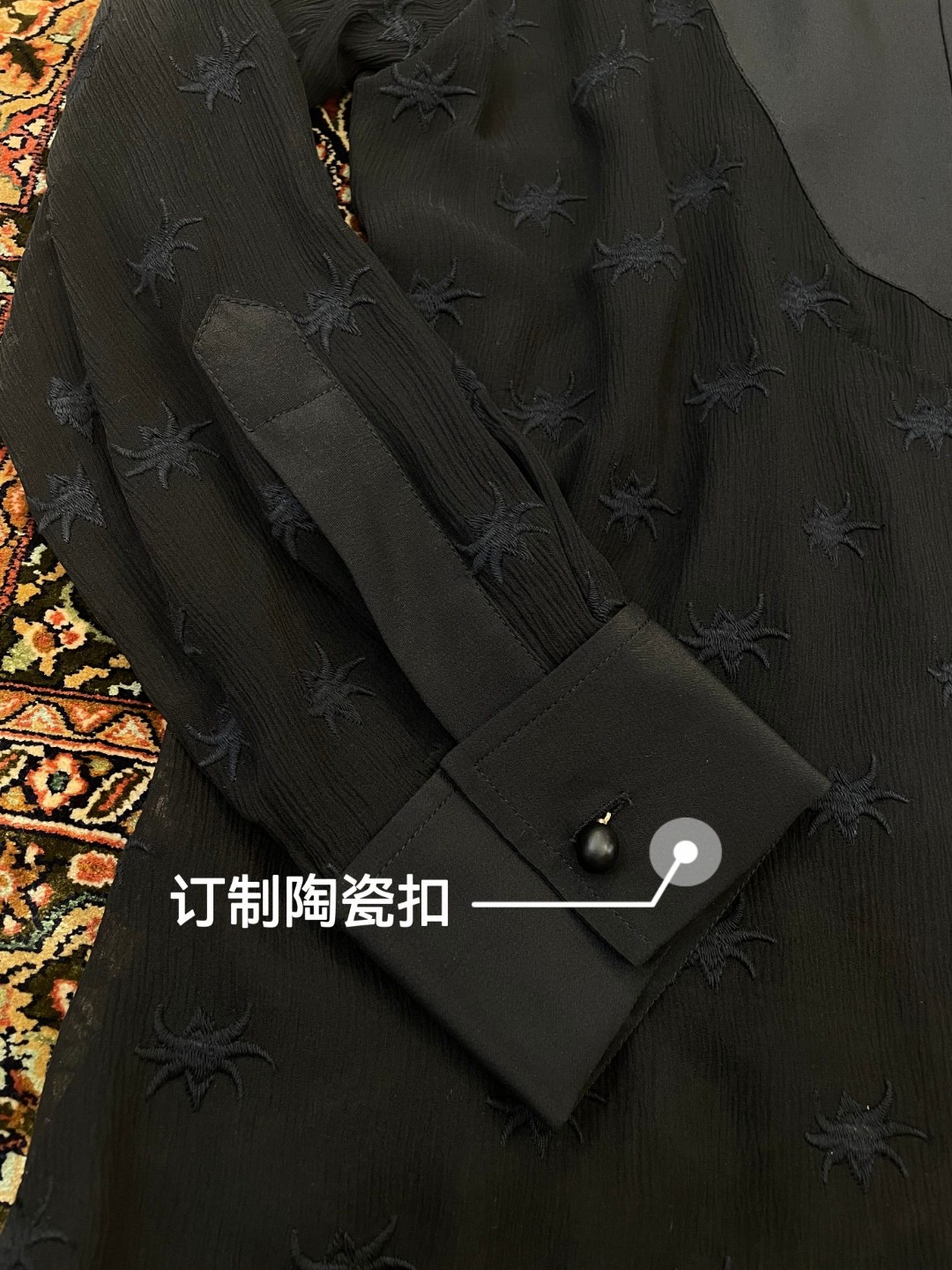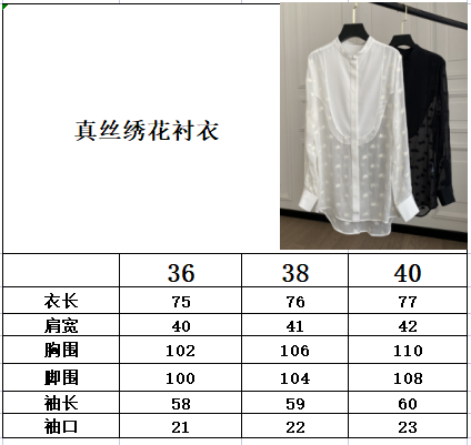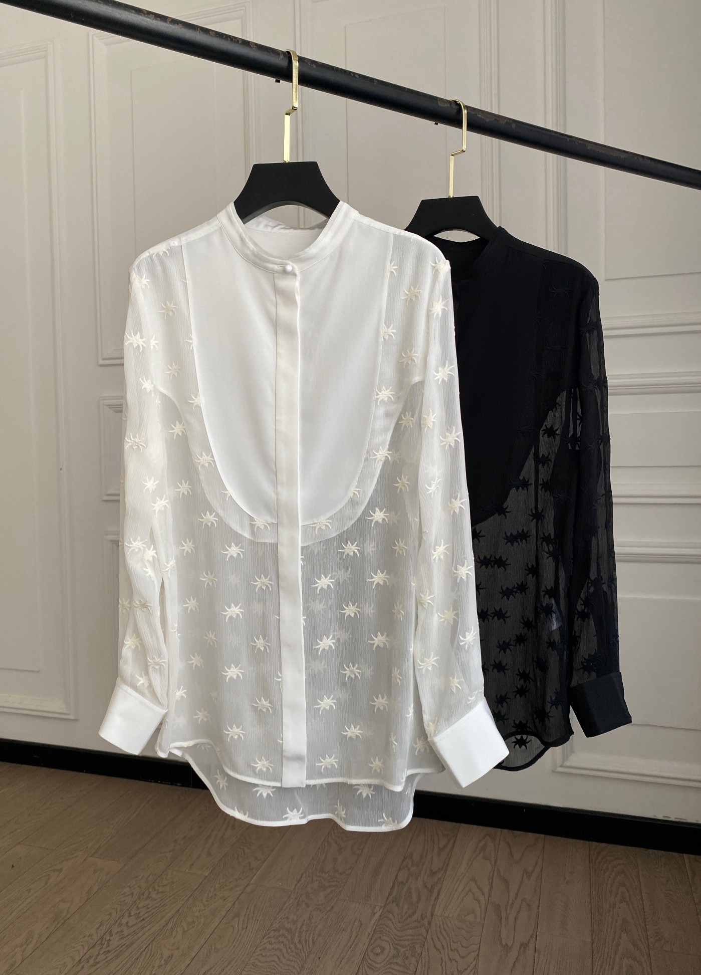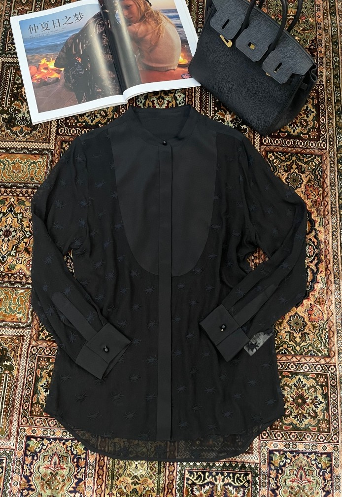 Chloe heavy embroidery star pattern silk blouse. Lightweight and flowing silk fabric, elegant and sophisticated. Two colors available: Black, White. Sizes: 36, 38, 40 (XS, S, M).