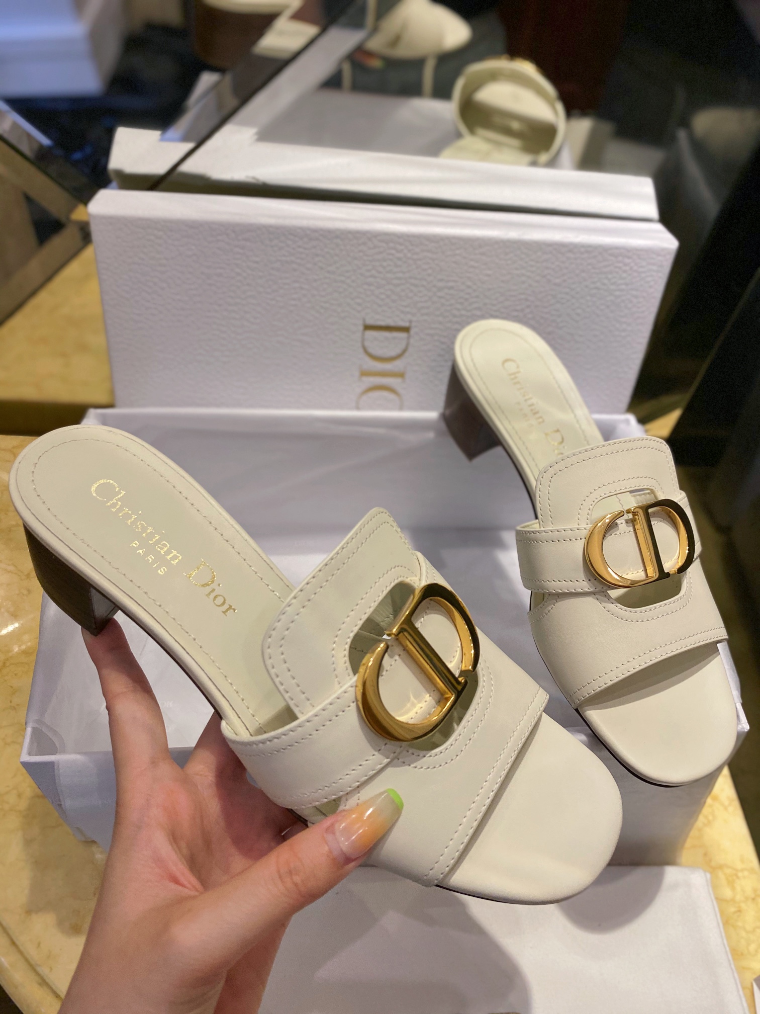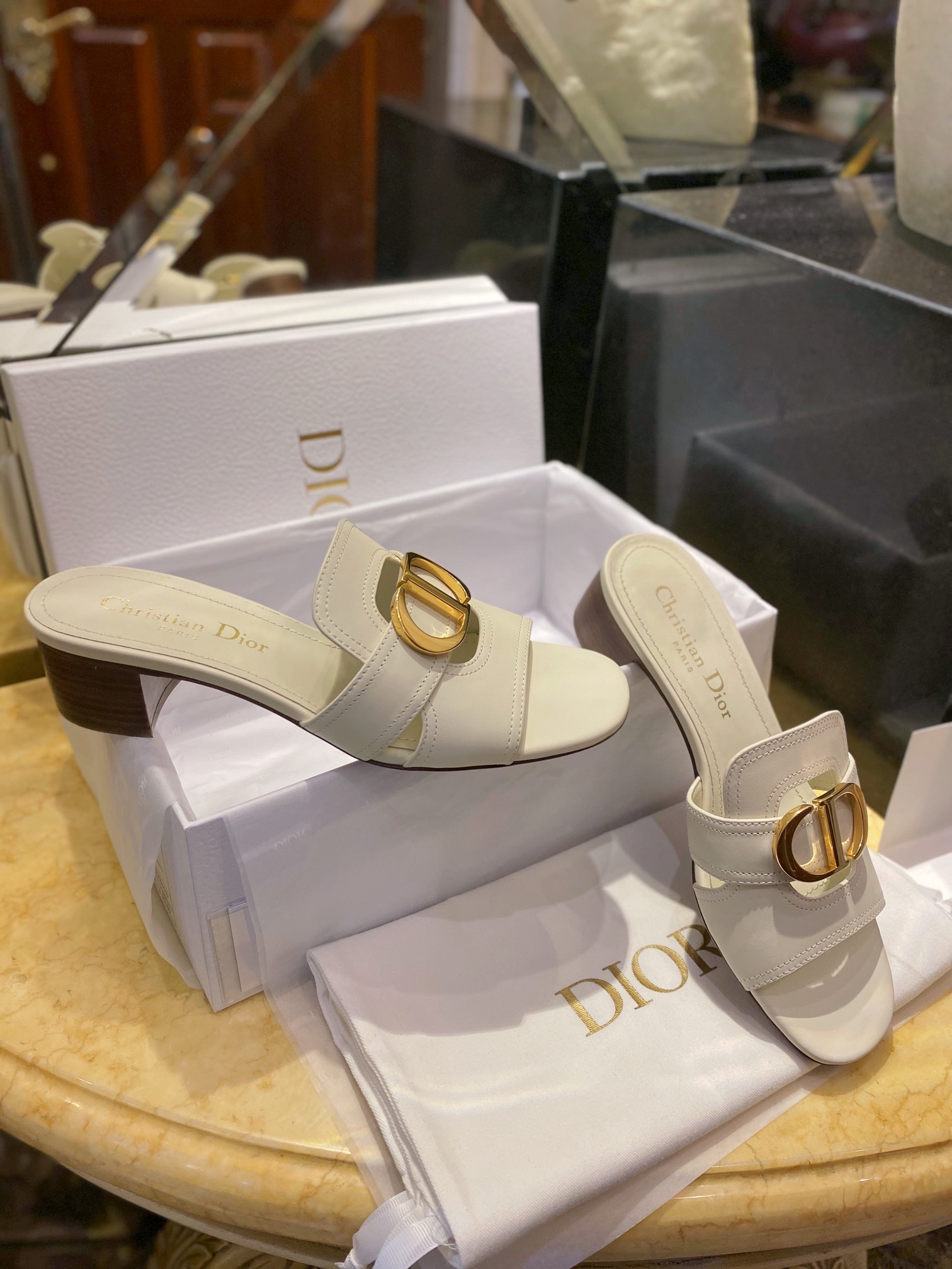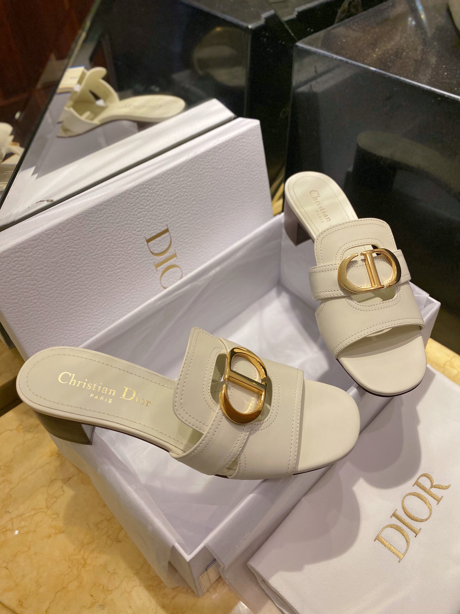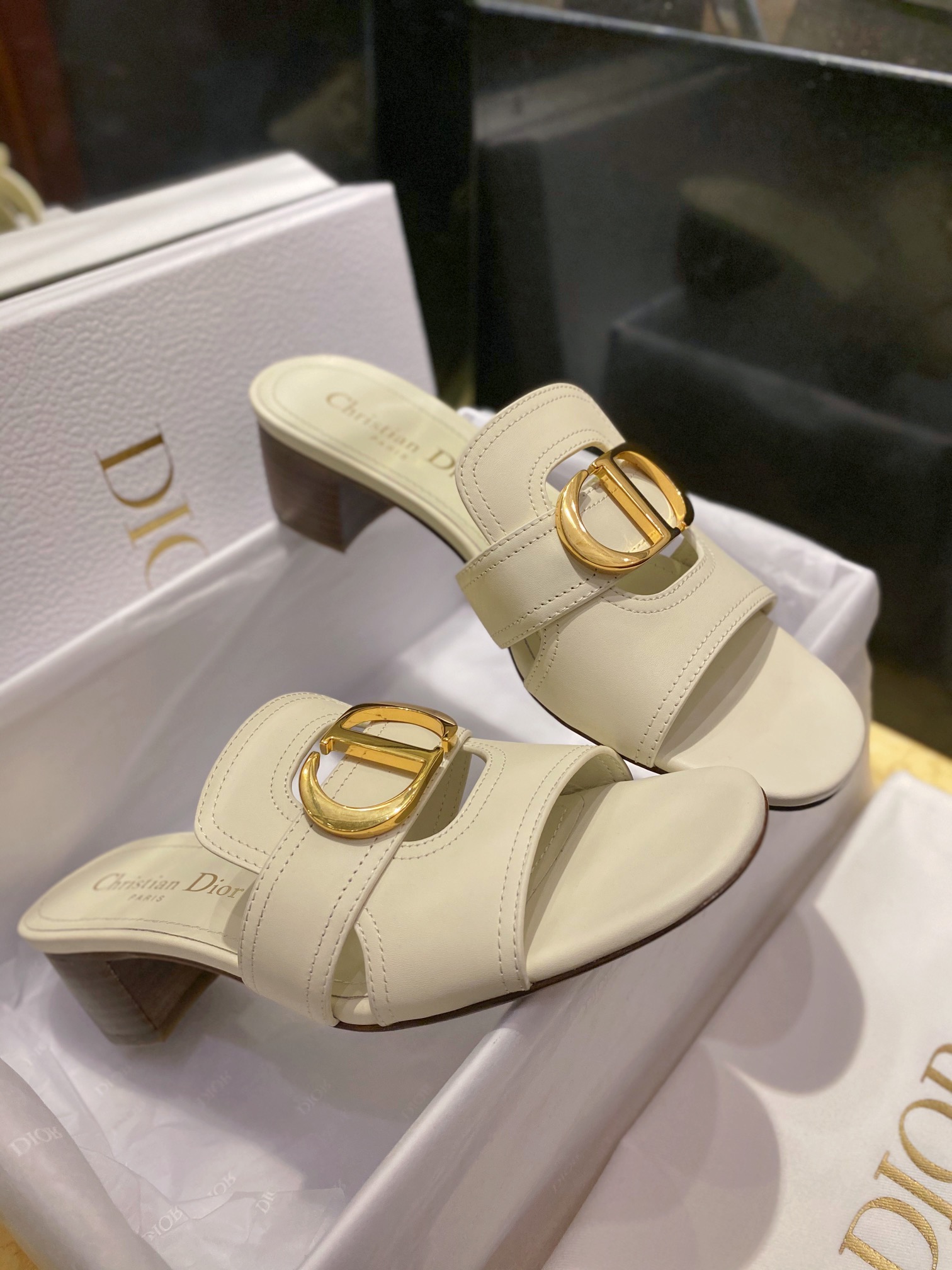 Dior CD High Heel Slippers. Iconic CD logo hardware with elegant high heel silhouette. Premium leather construction with signature Dior detailing. Sizes 35-41.