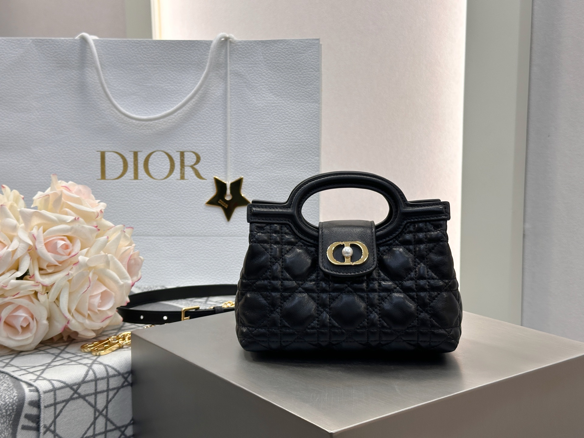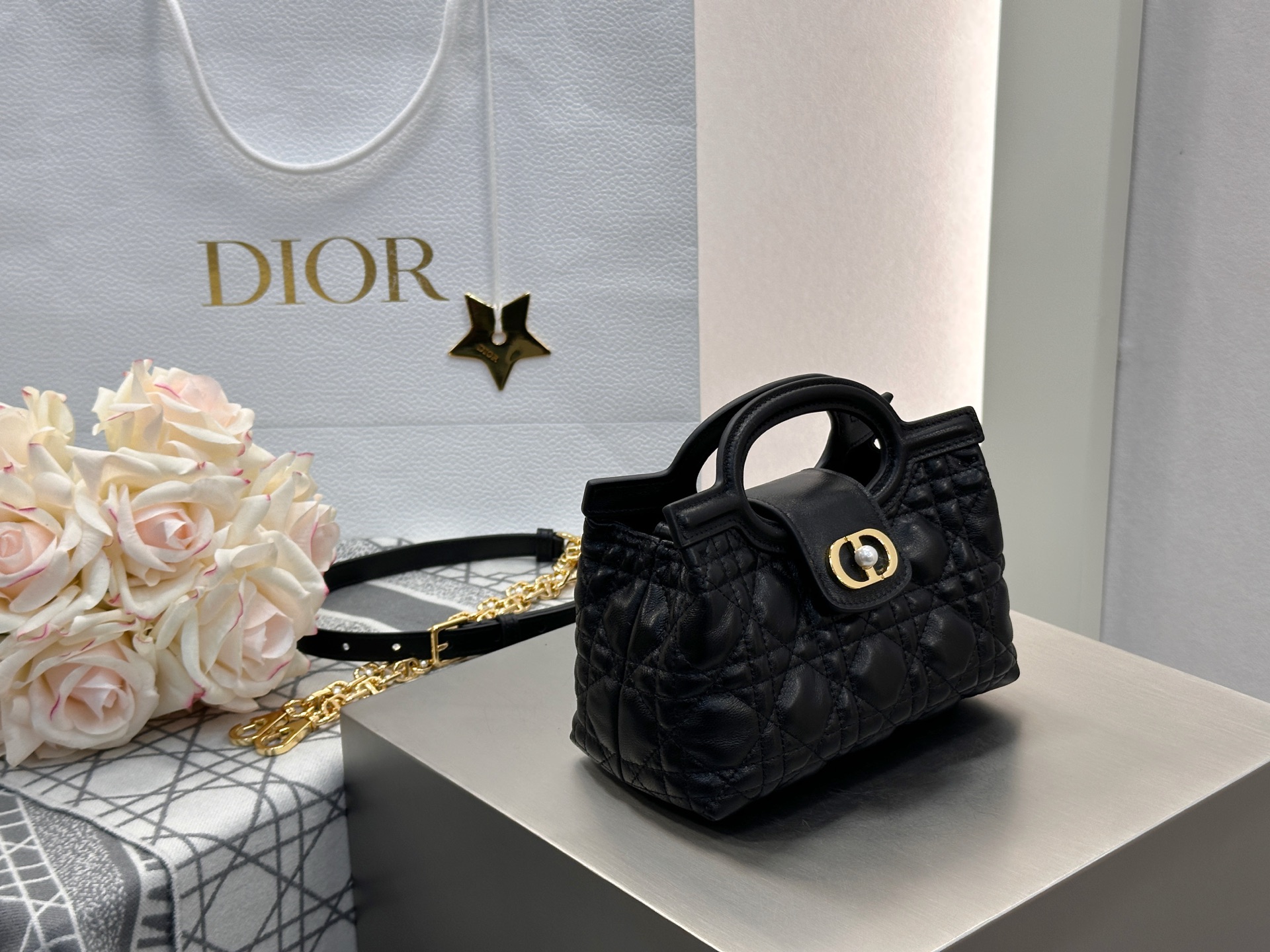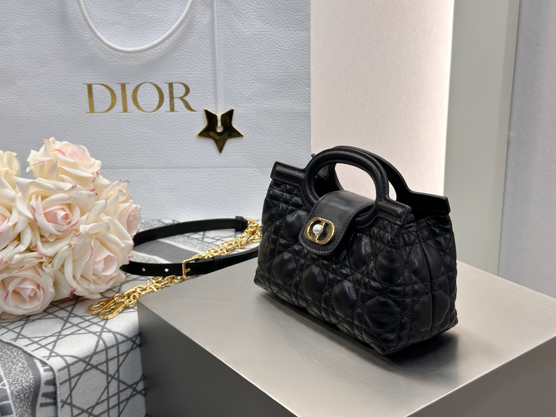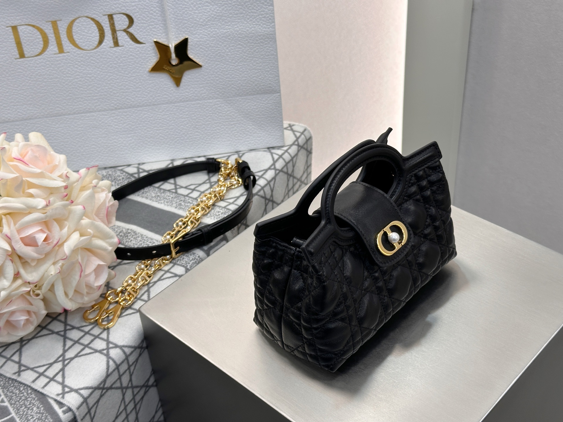 Dior Jolie Top Handle mini chain bag in black lambskin cannage. Imported original black lambskin. Adjustable, detachable CD chain strap with white resin beads and CD links. Lightweight and elegant. Size: 18.5*13*8.5cm.