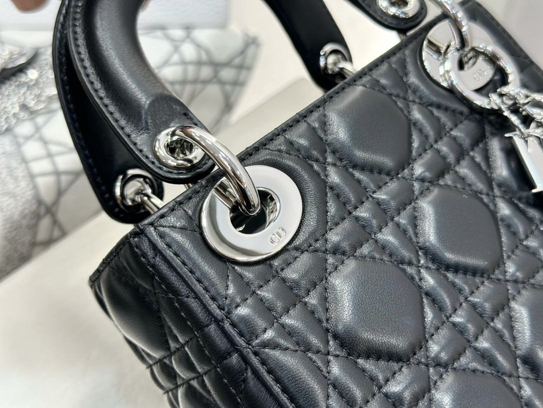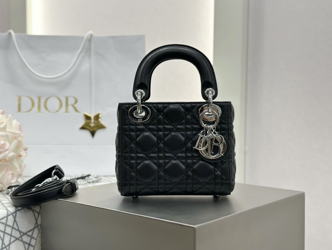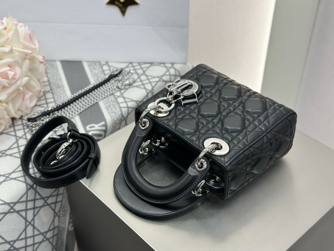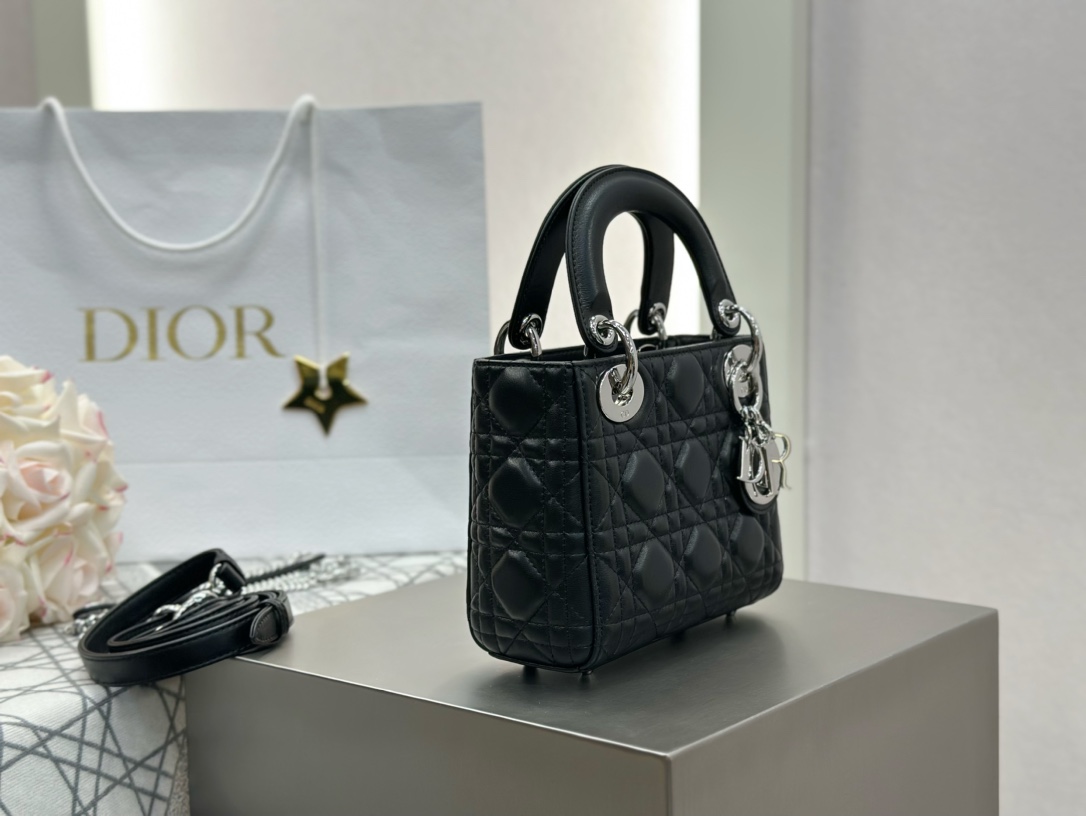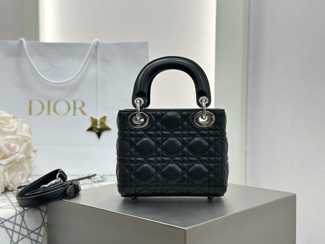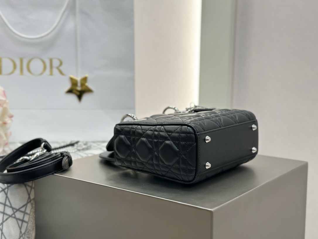 Lady Dior small bag in black lambskin with silver hardware. Imported original black lambskin. Classic three-compartment design, the most iconic Lady Dior style. Size: 17*15*7cm.