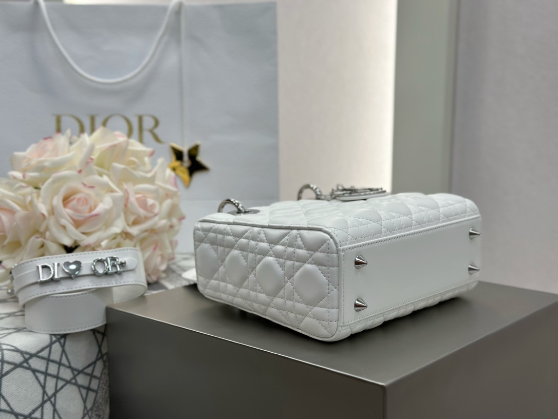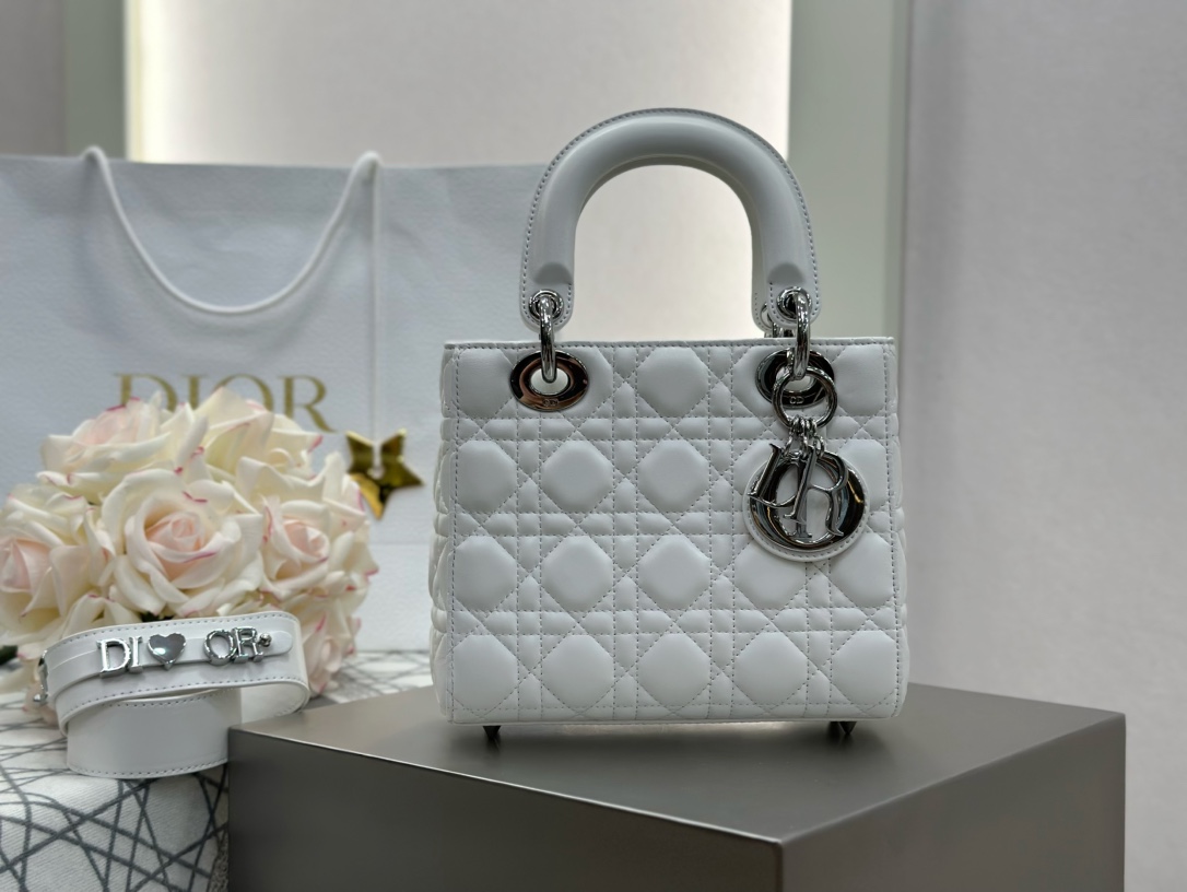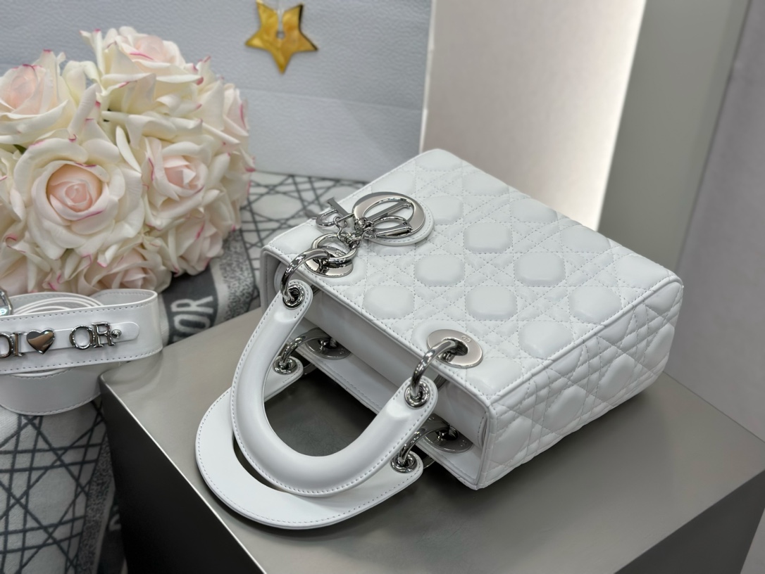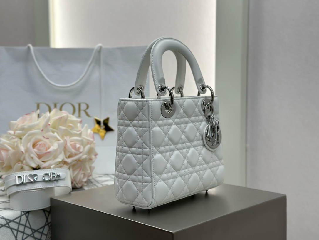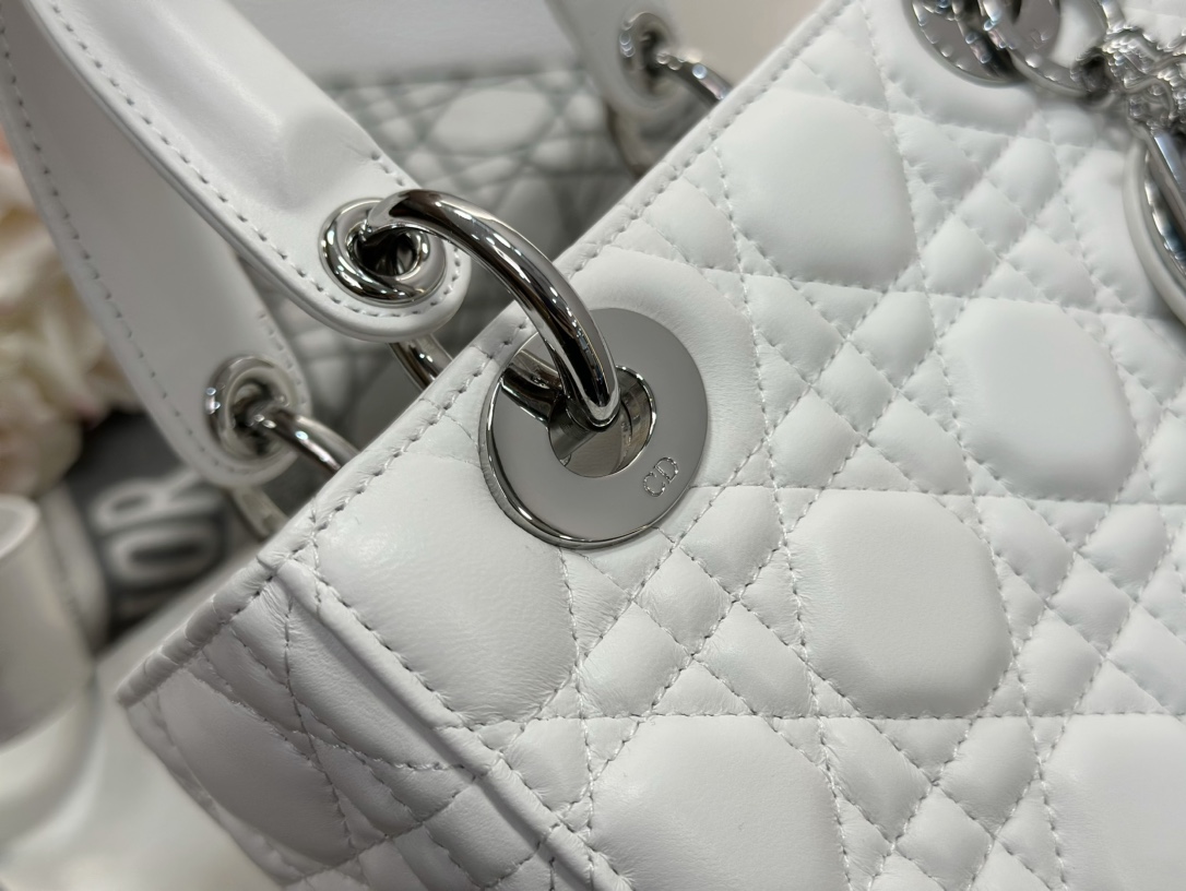 Dior Lady Dior medium bag. Classic 4-grid design in white with silver hardware. Premium imported lambskin, lamb velvet lining. Iconic cannage quilting pattern. Size: 20*17*8cm.