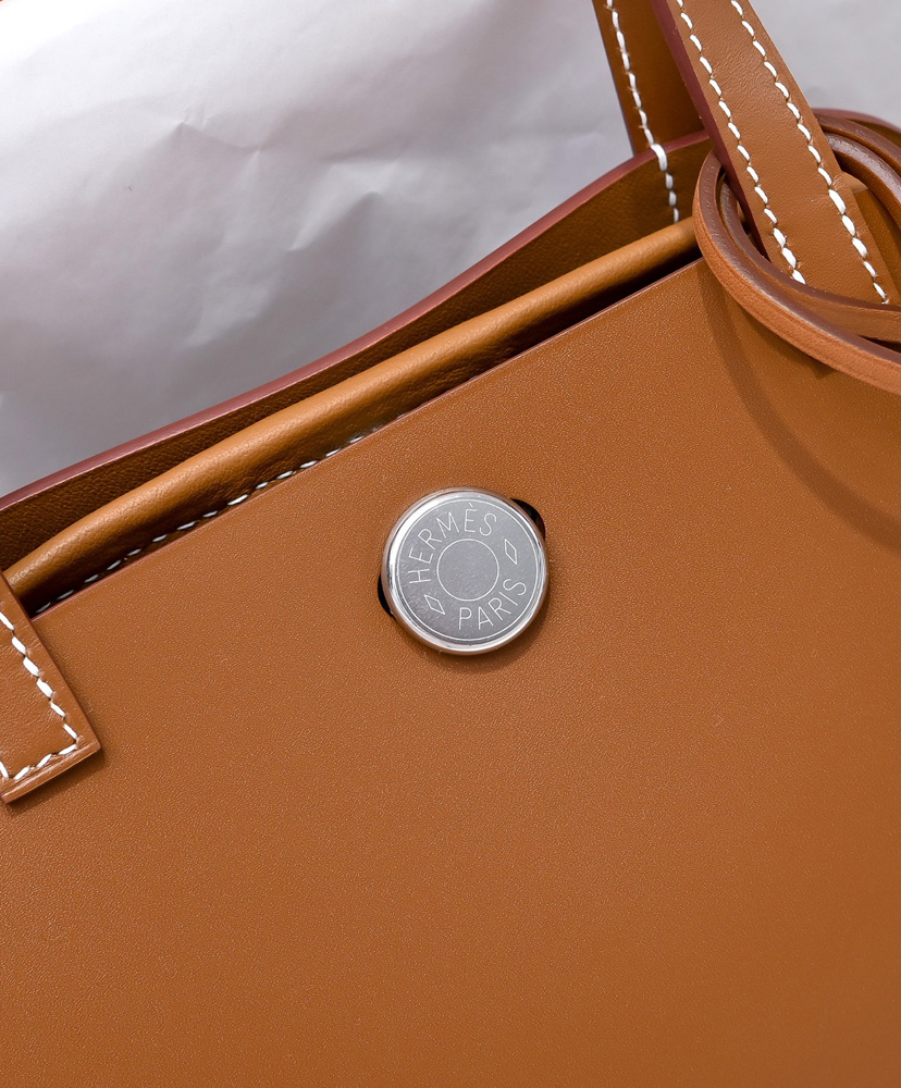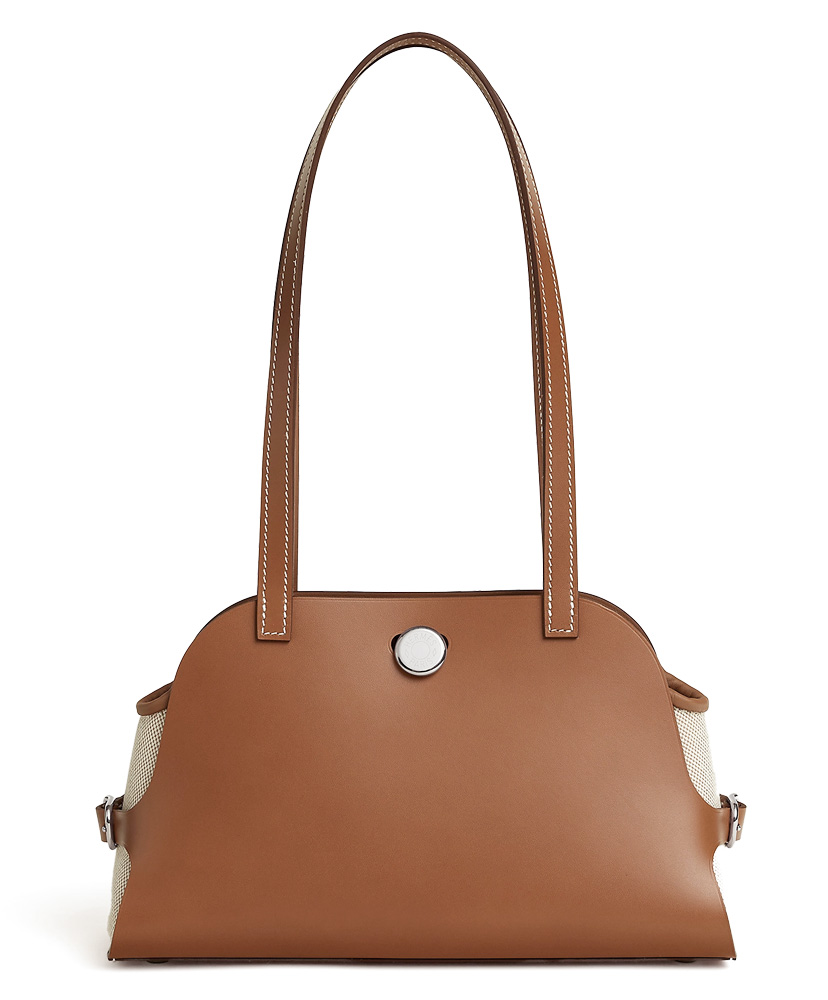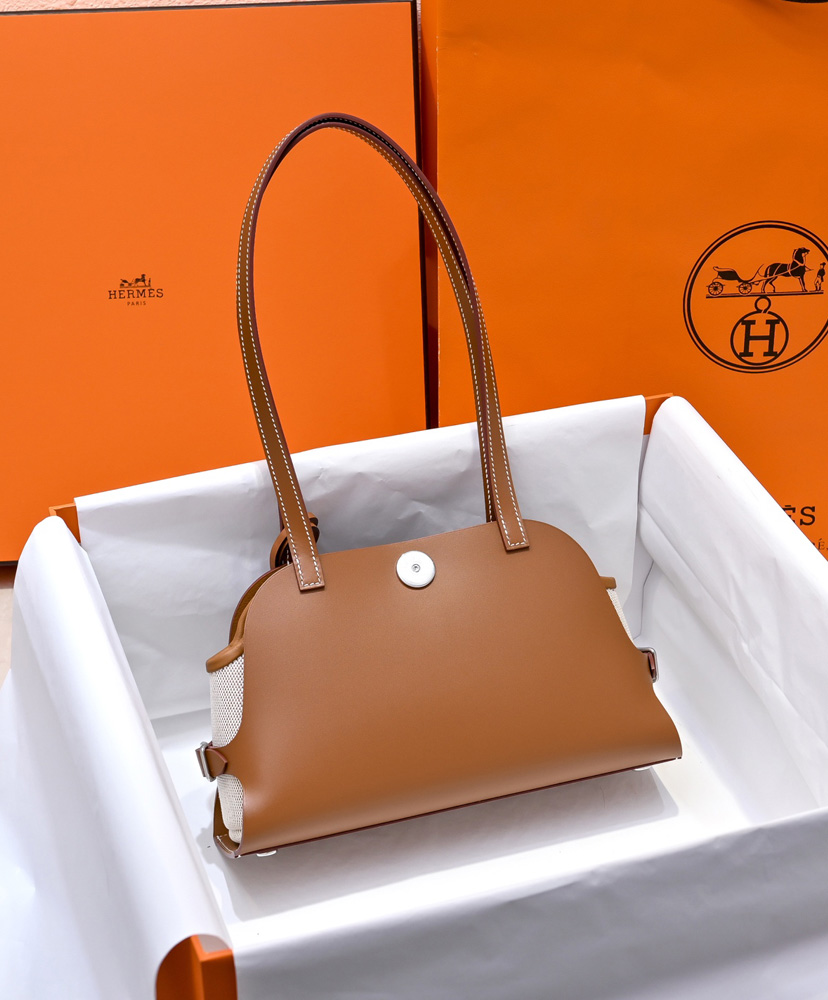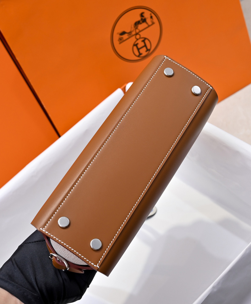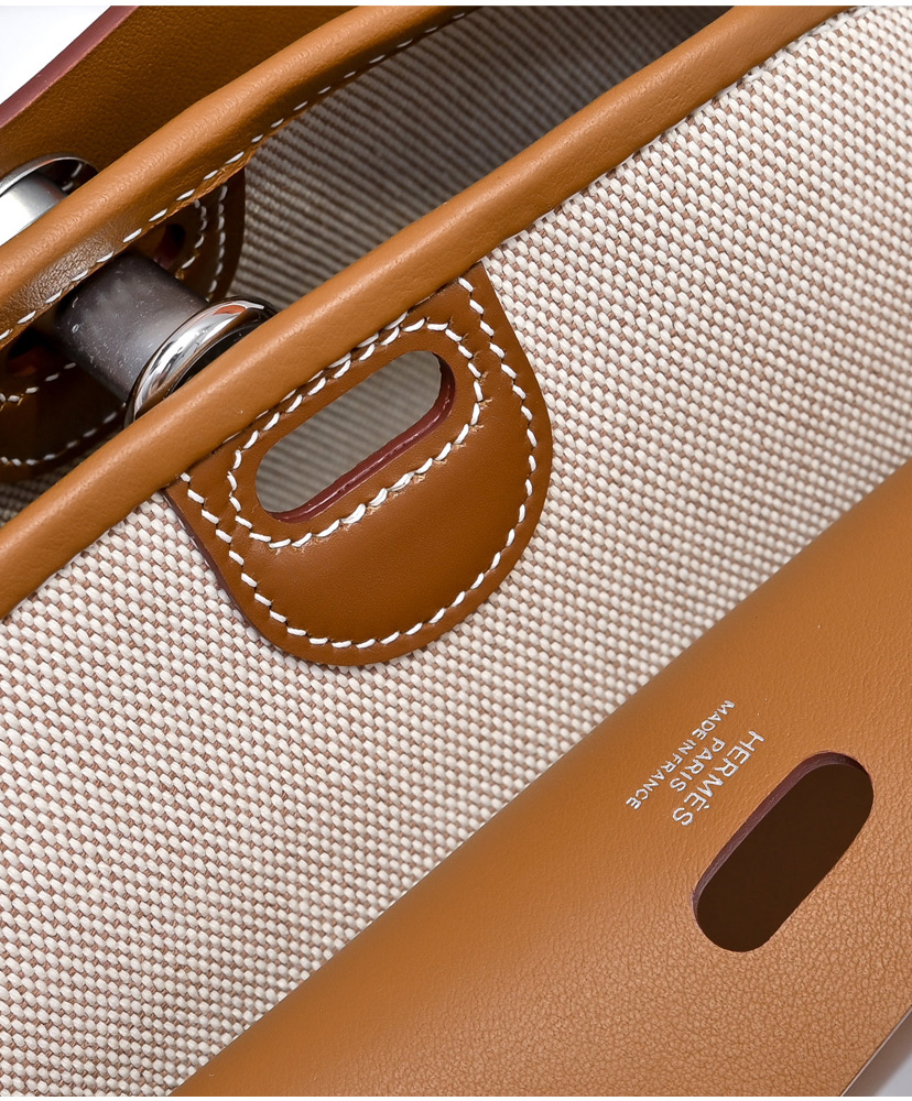 Bag in Hunter cowhide, Swift calfskin and H canvas. Clou de Selle closure, removable interior pouch, Etriviere buckle. Can be carried by hand or worn over the shoulder. Size: W26XH16XD9(cm). Material: Canvas with leather.