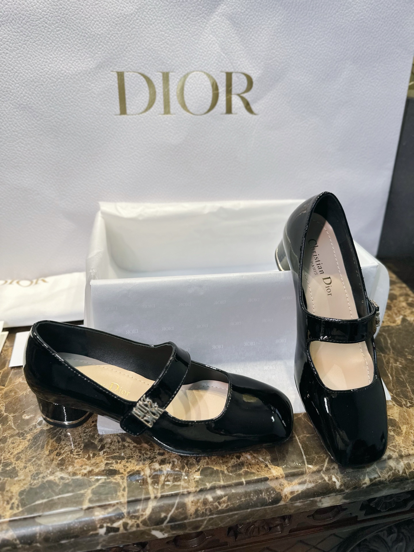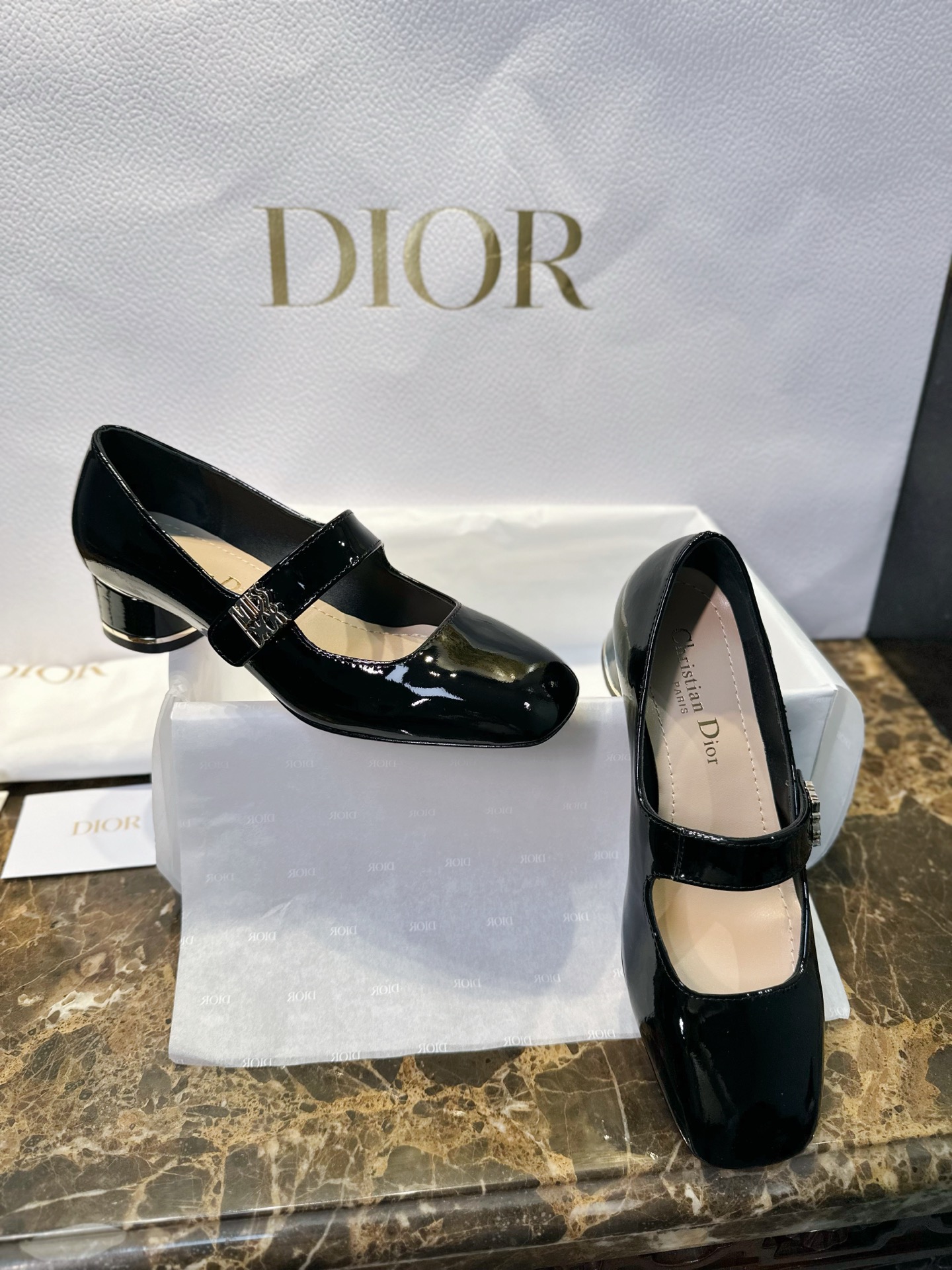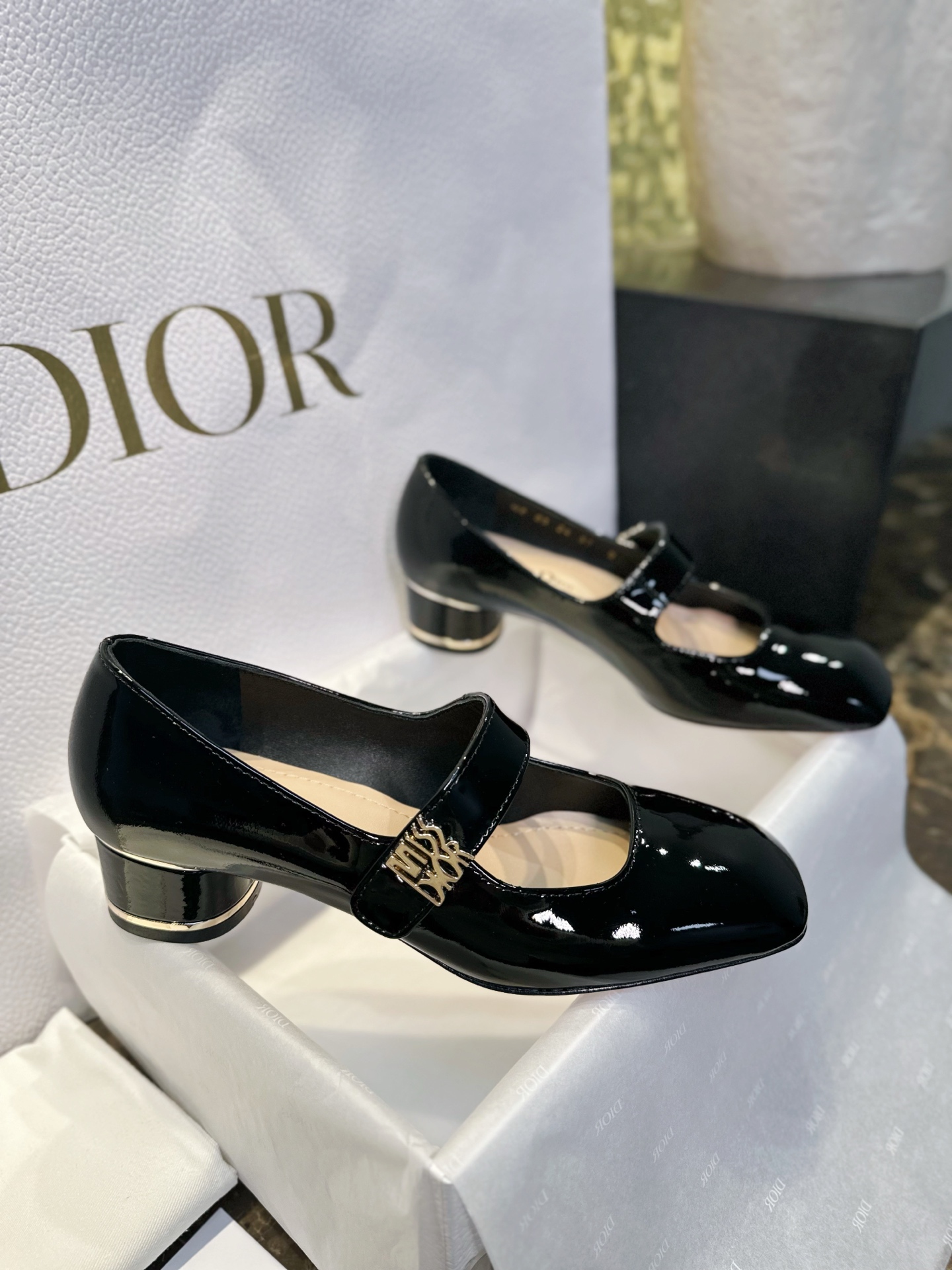 Miss Dior Mary Jane Shoes. Elegant Mary Jane silhouette with signature Dior detailing. Premium leather construction with comfortable block heel. Sizes 35-40.