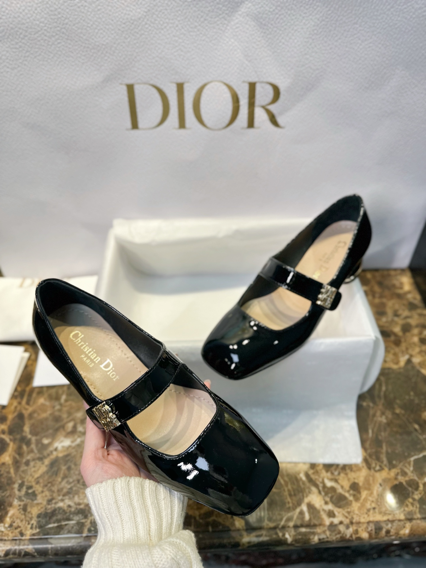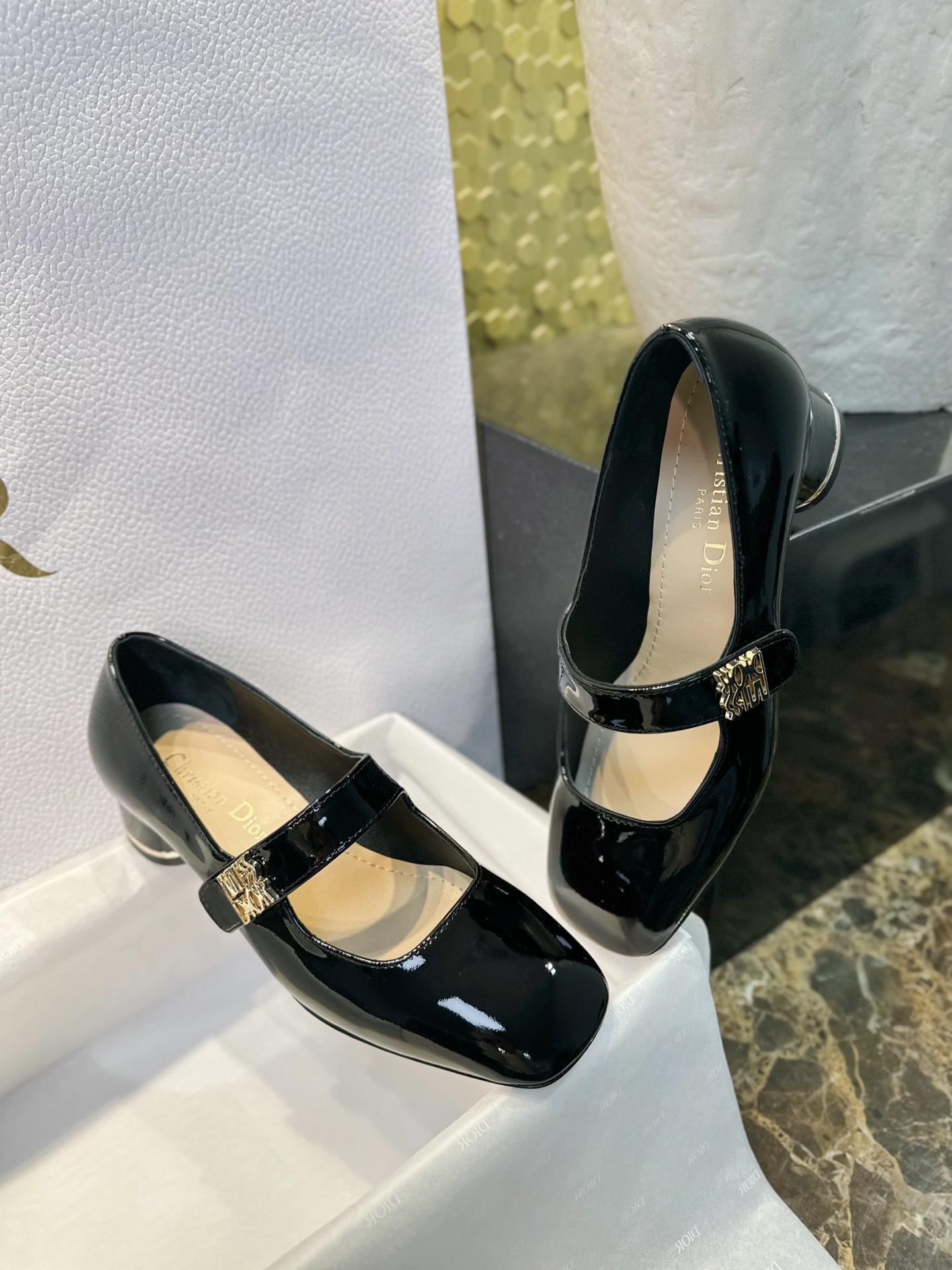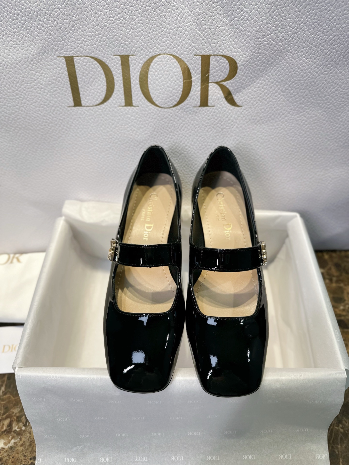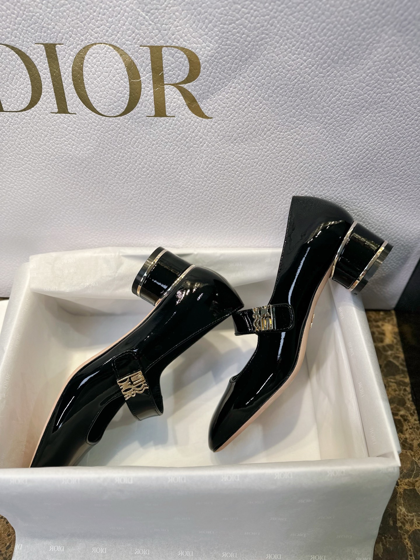 Miss Dior Mary Jane Shoes. Elegant Mary Jane silhouette with signature Dior detailing. Premium leather construction with comfortable block heel. Sizes 35-40.