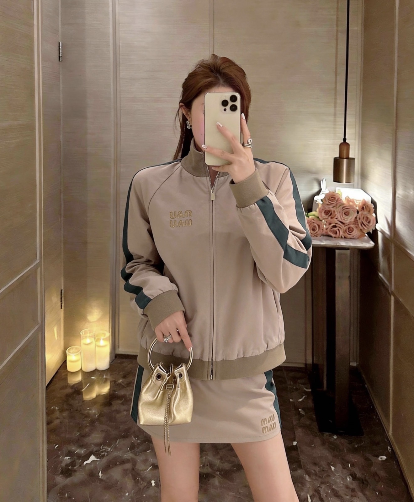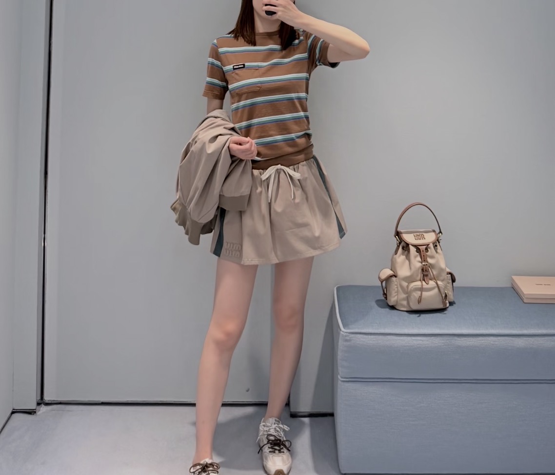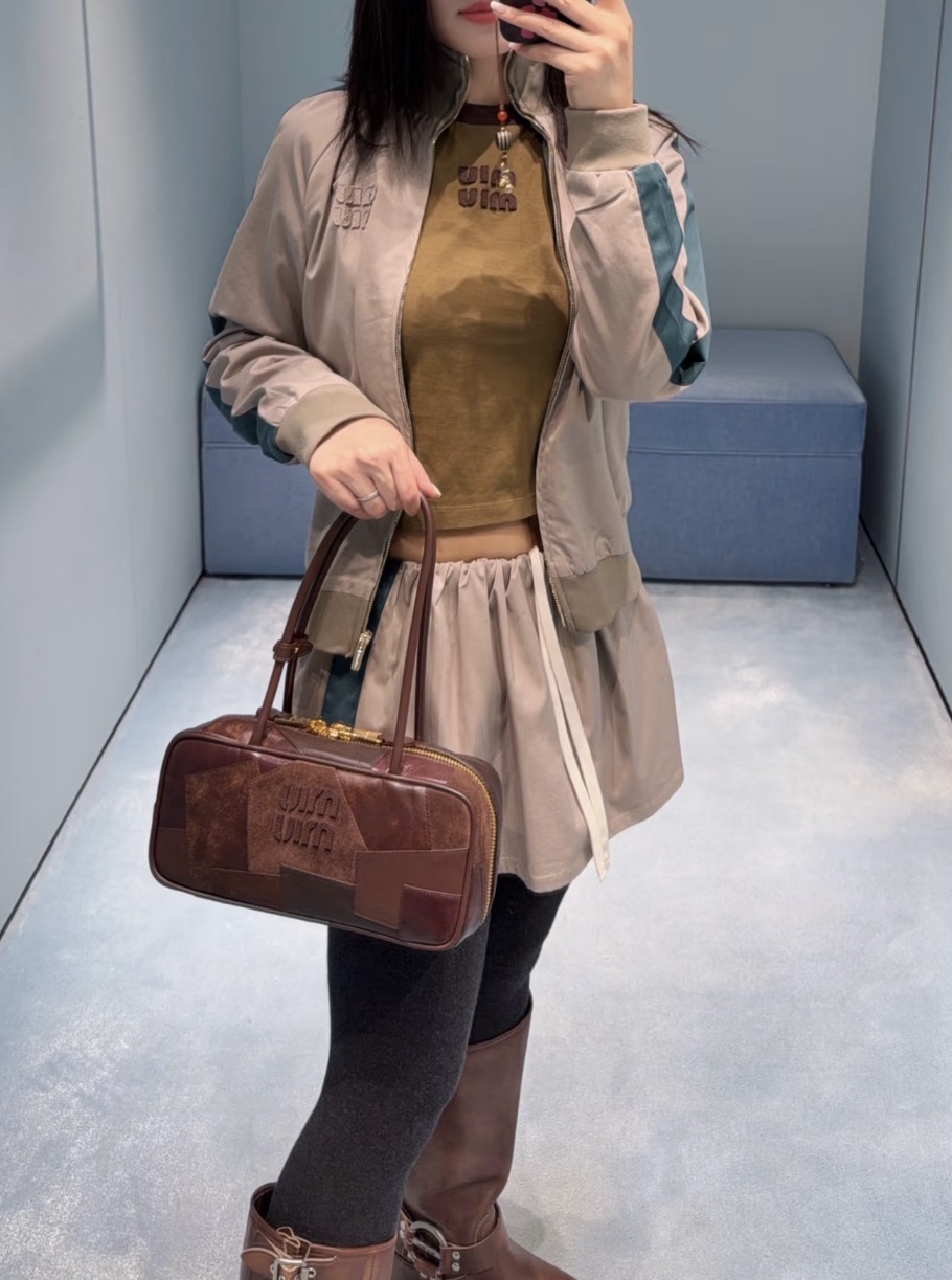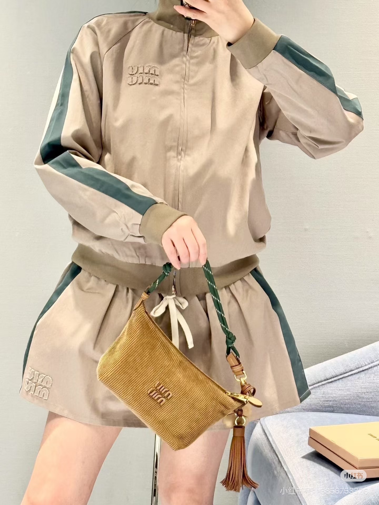 Miumi * 缪缪 2026春夏新品 立领长袖拉链 百搭夹克 显瘦外套+通勤百搭短裙1️⃣色3️⃣码SML. Features: Stand collar, long sleeve, zipper closure, slim fit, versatile for commuting. Quality materials with fine stitching.