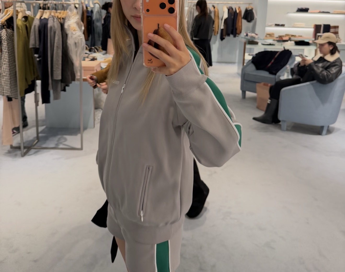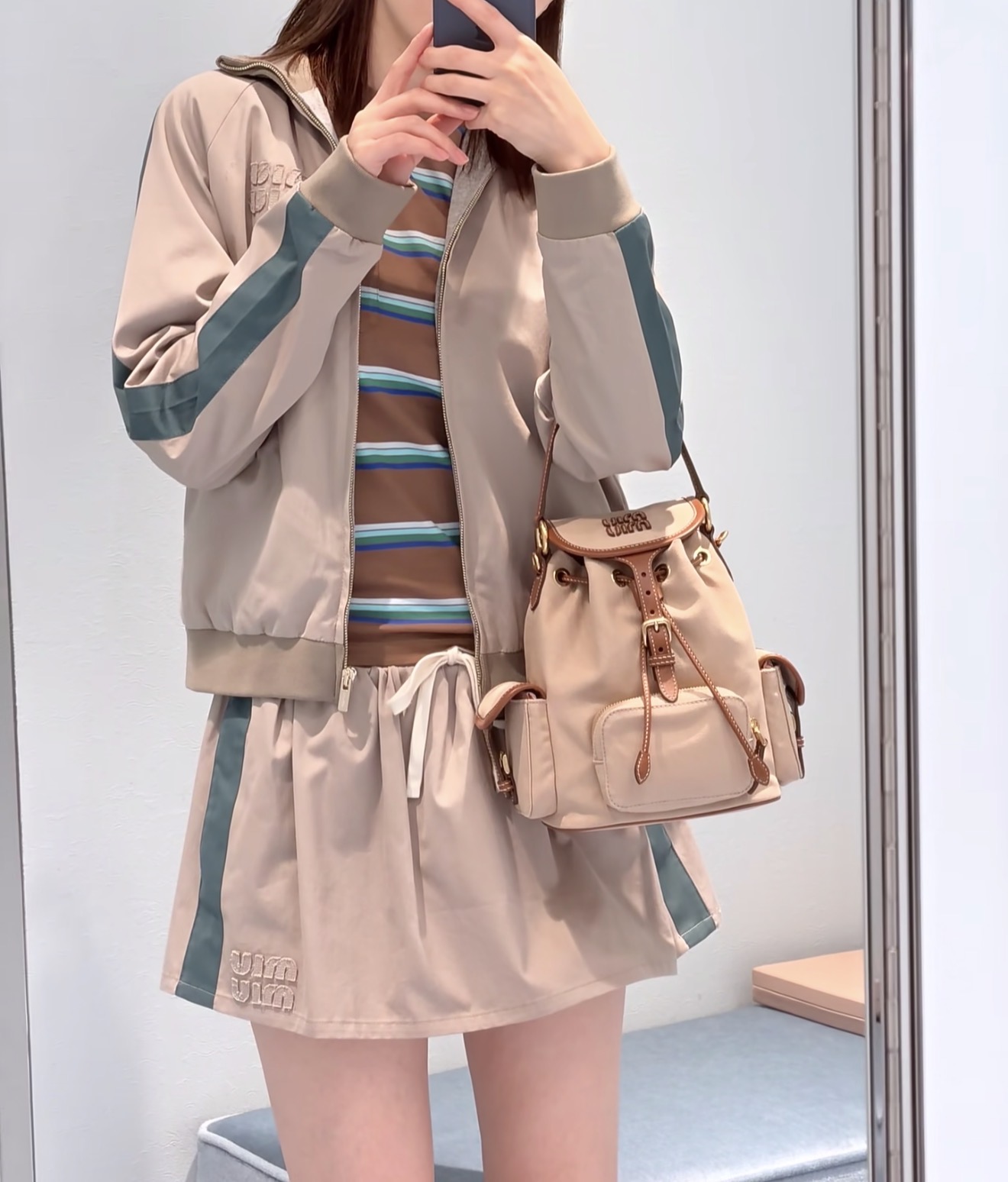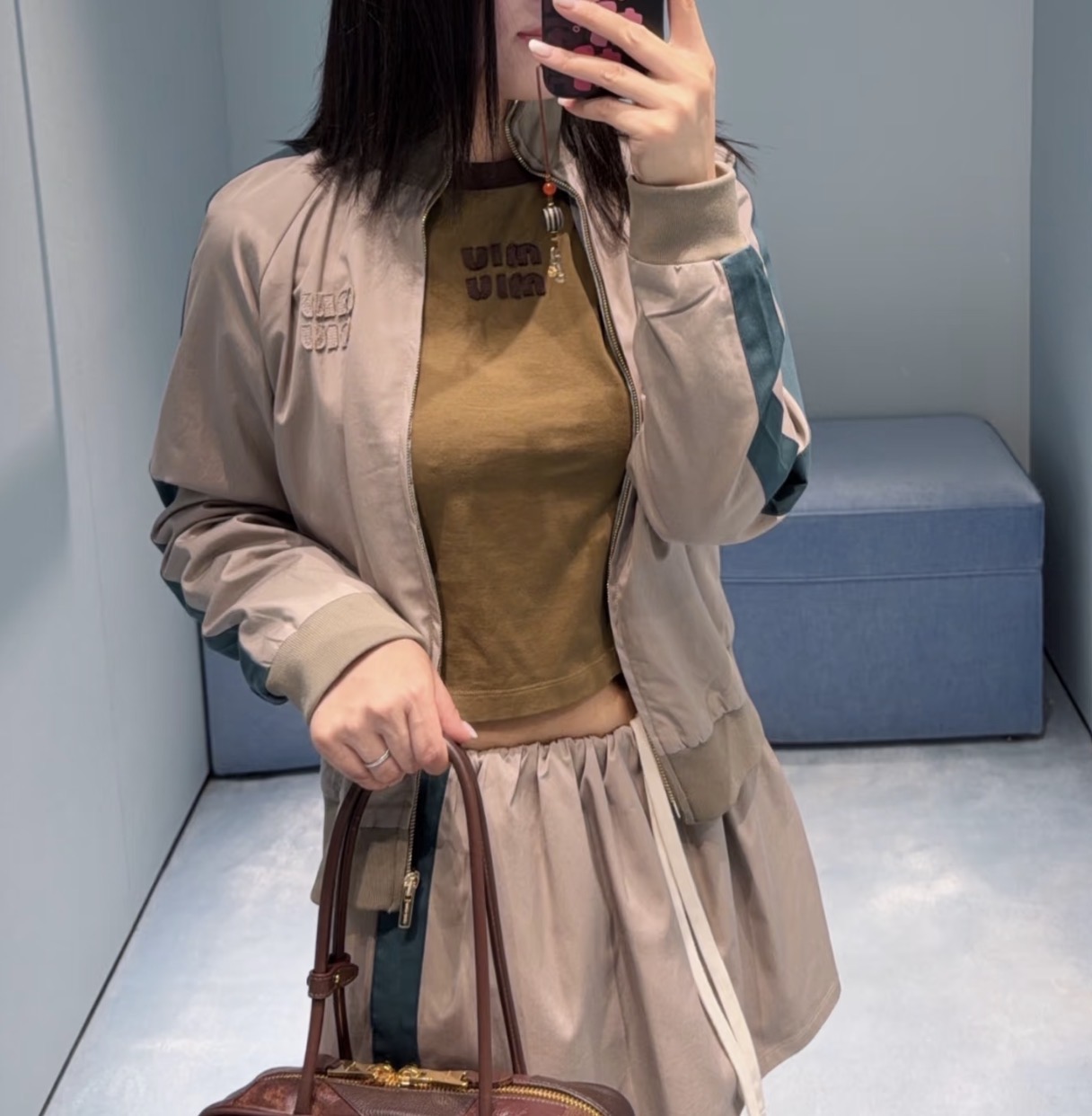 Miumi * 缪缪 2026春夏新品 立领长袖拉链 百搭夹克 显瘦外套+通勤百搭短裙1️⃣色3️⃣码SML. Features: Stand collar, long sleeve, zipper closure, slim fit, versatile for commuting. Quality materials with fine stitching.