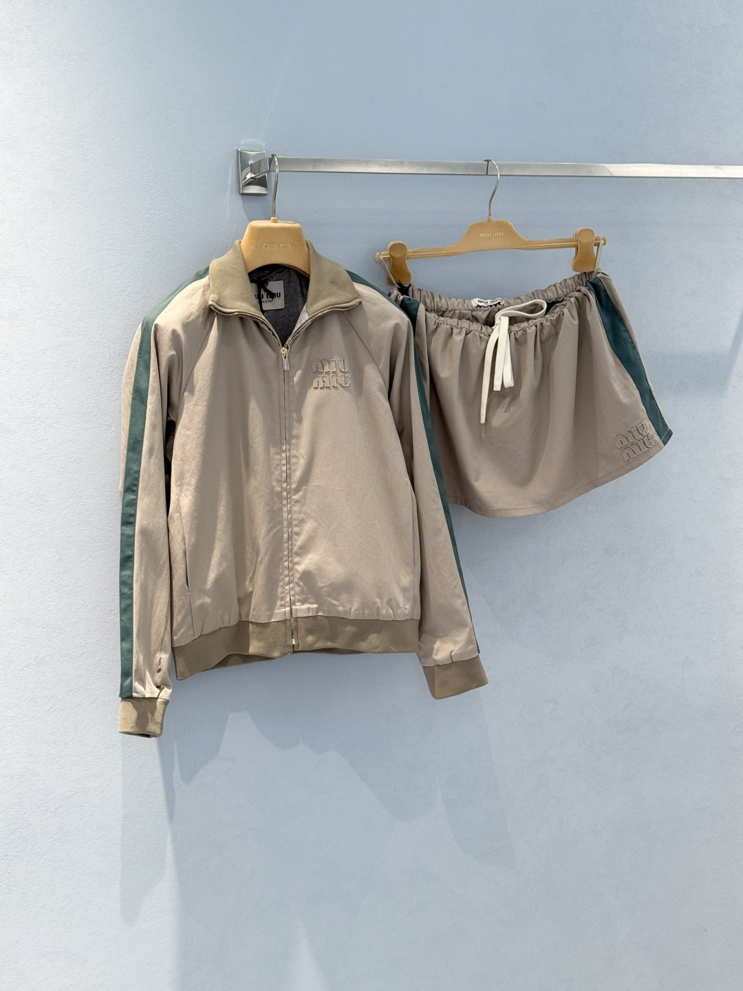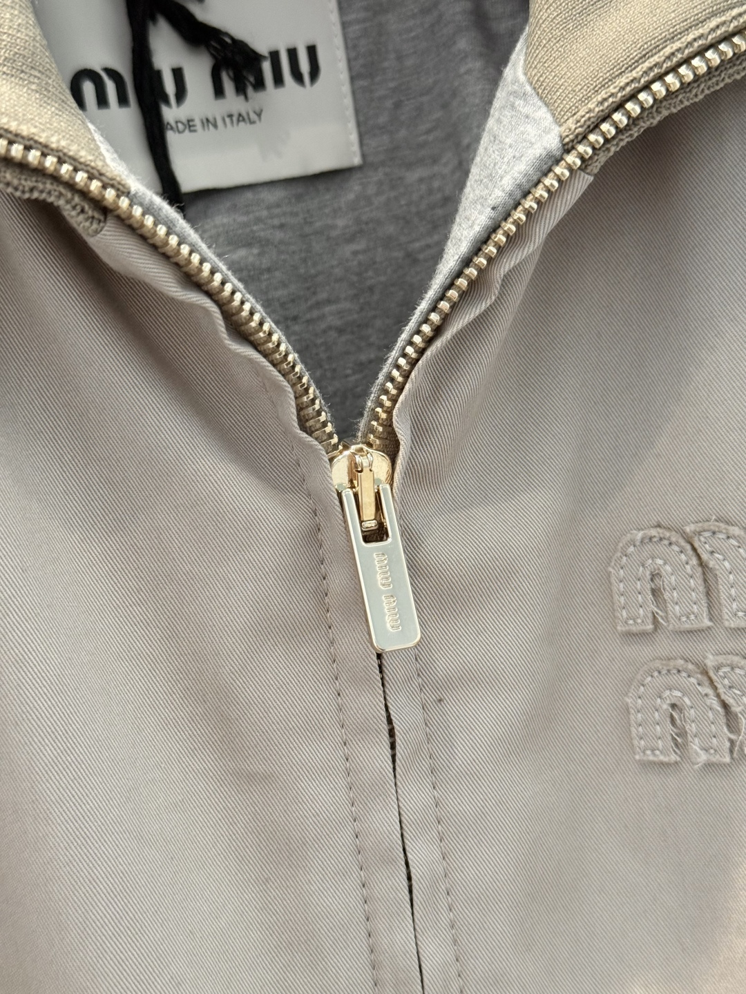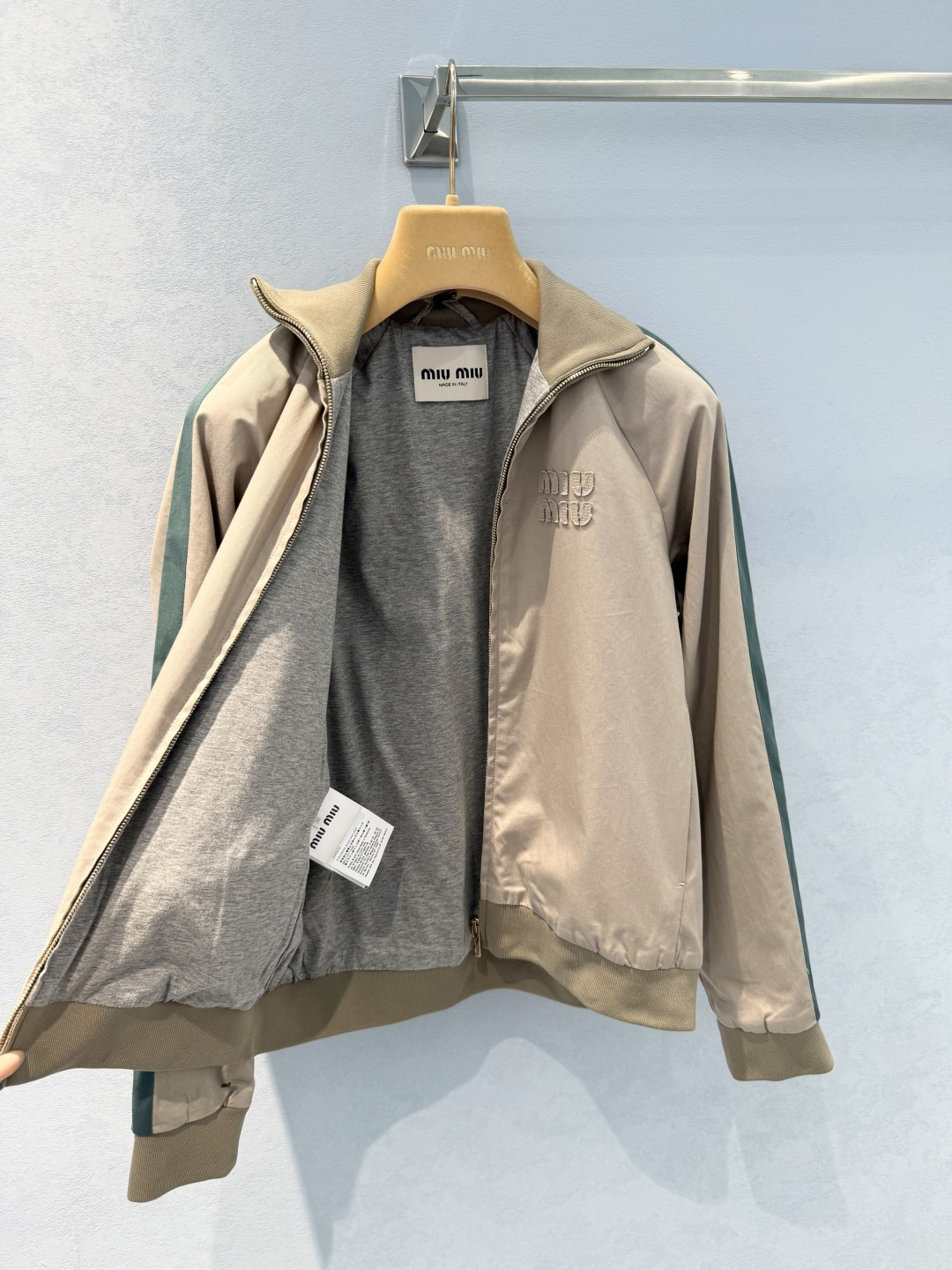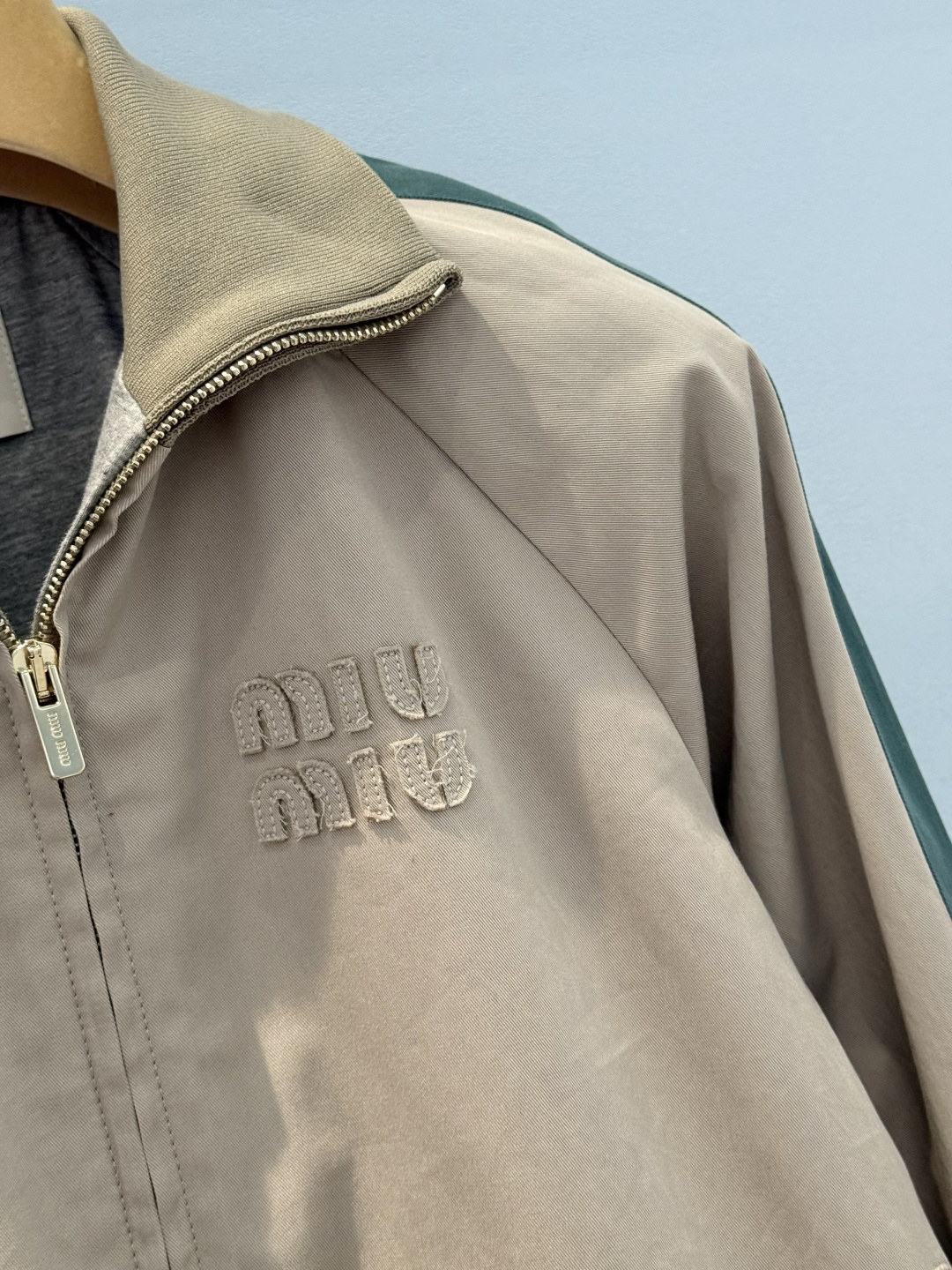 MiuMiu letter graphic zipper jacket with letter patch design. Contrasting color tape details, zipper closure. Premium imported yb100% cotton material. Trendy casual style, comfortable fit. 1:1 high quality version.
