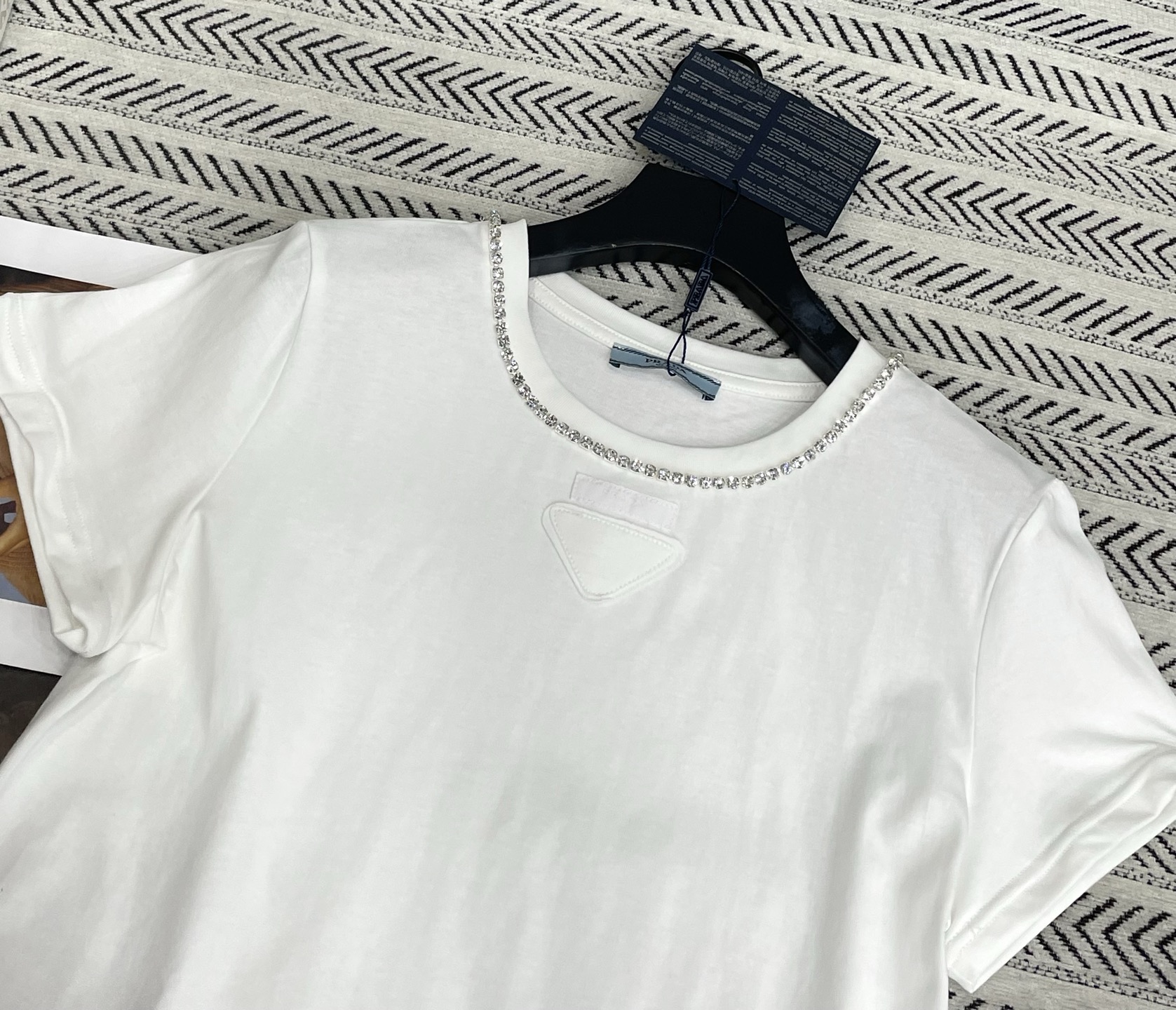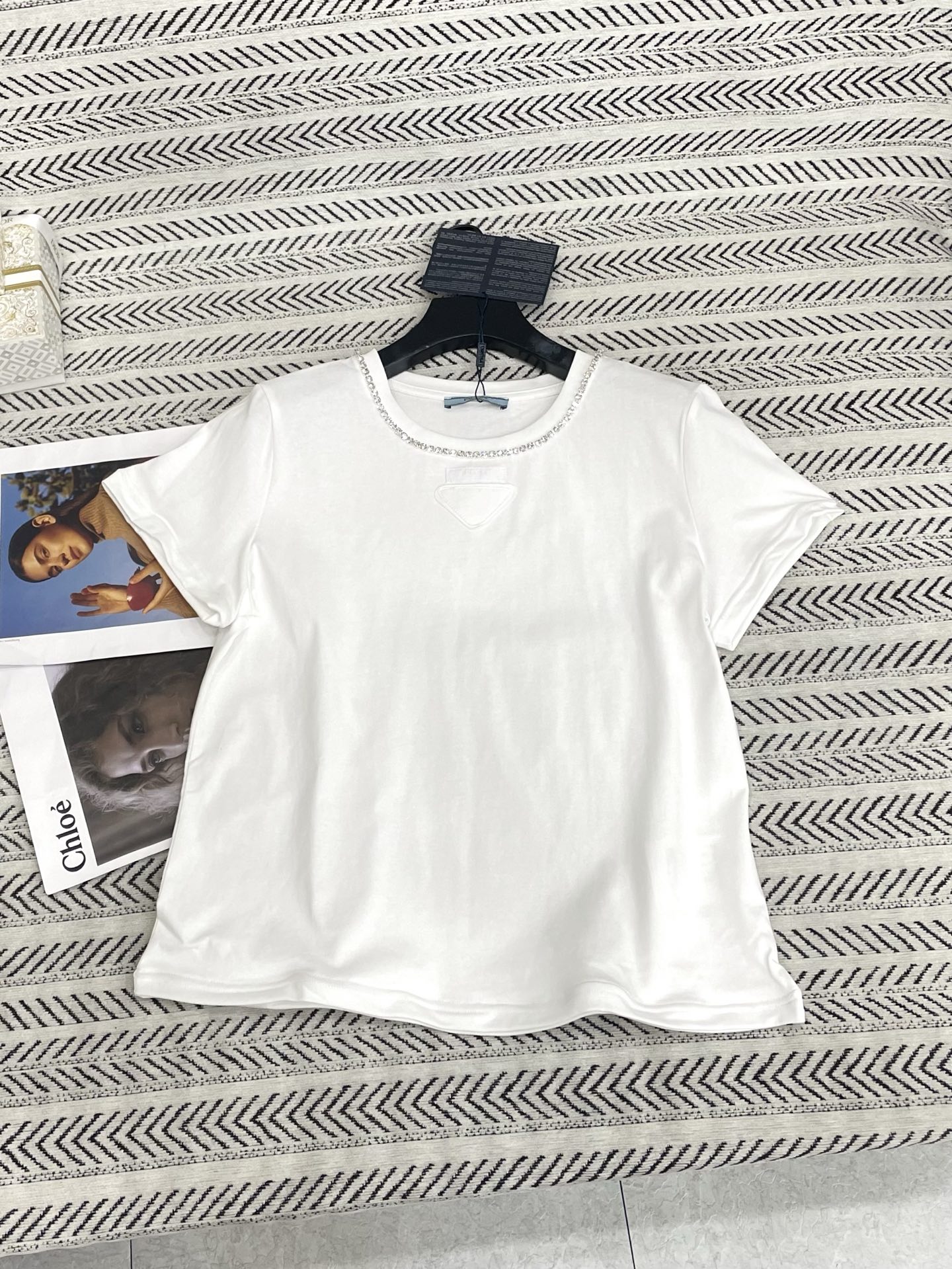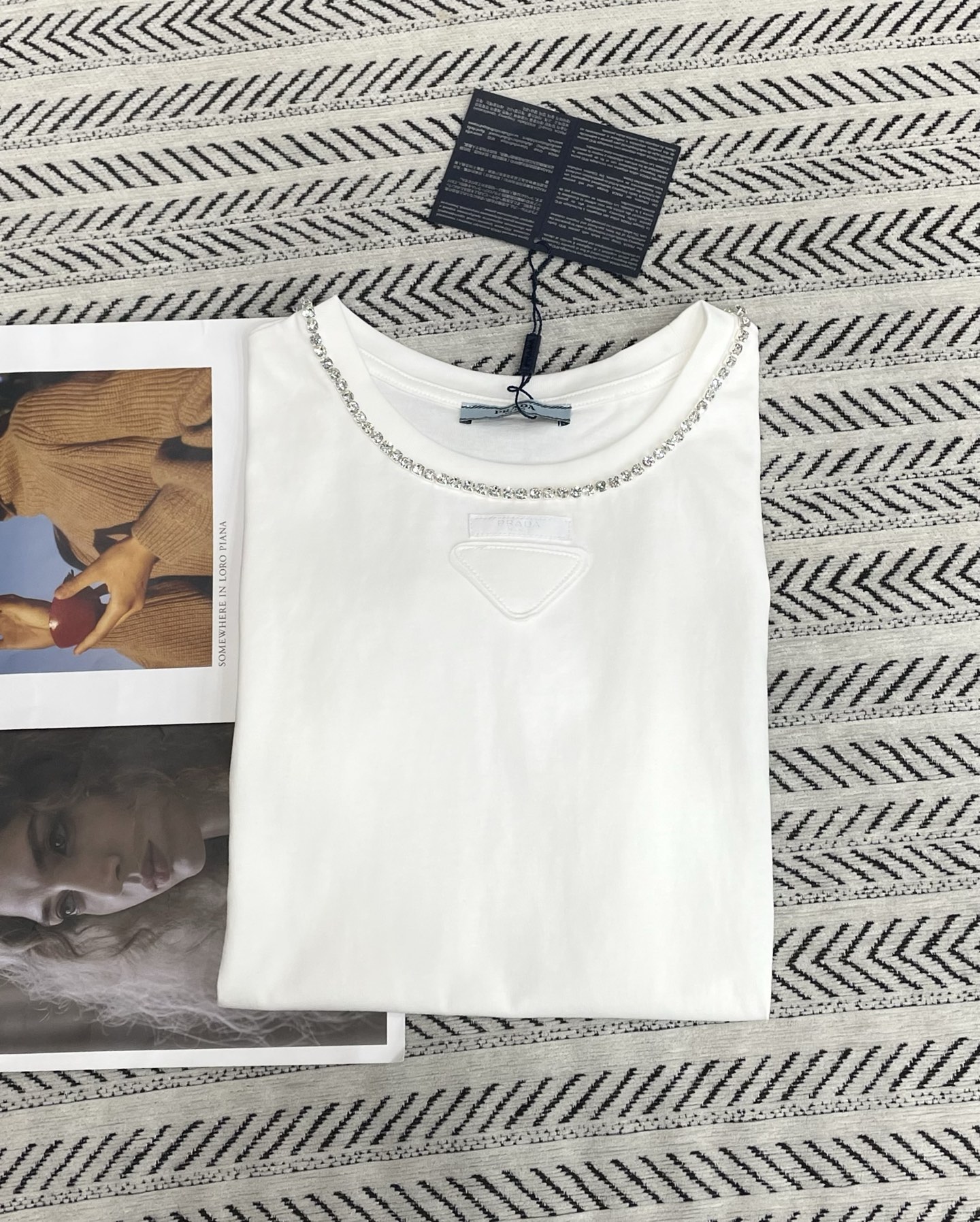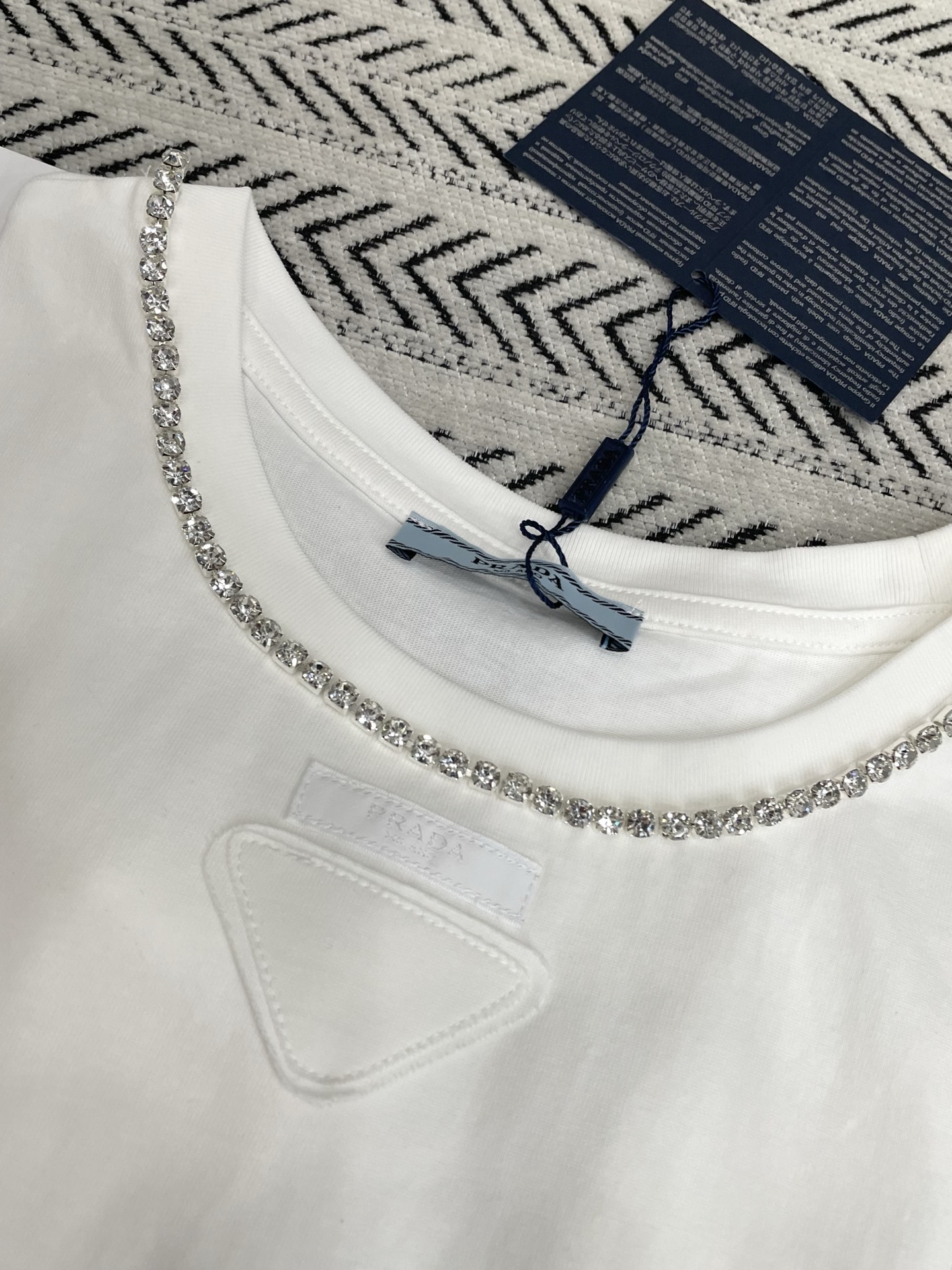 Prada Cotton jersey T-shirt White For Women. Diamond studded triangle logo. 26SS Spring/Summer.