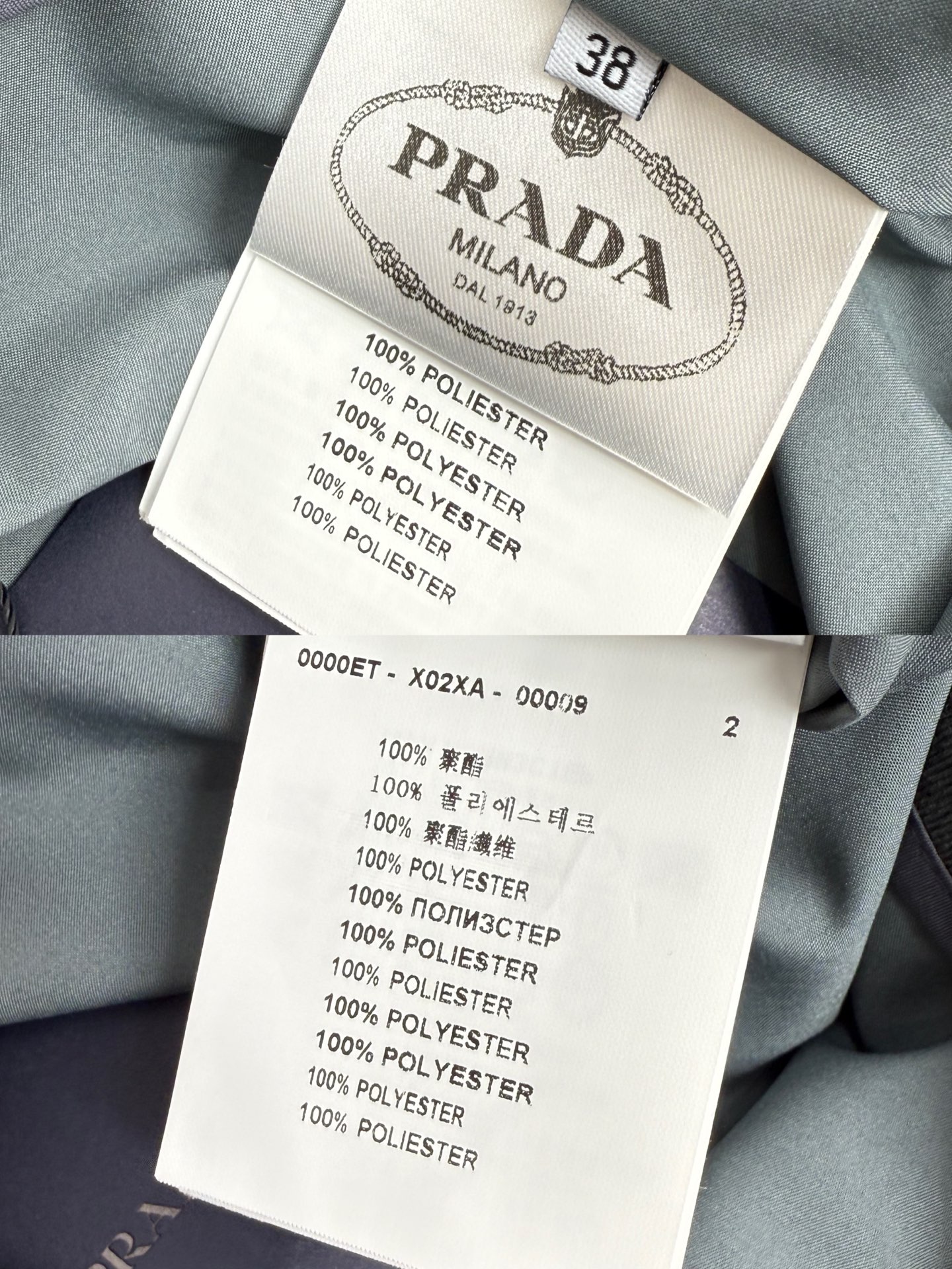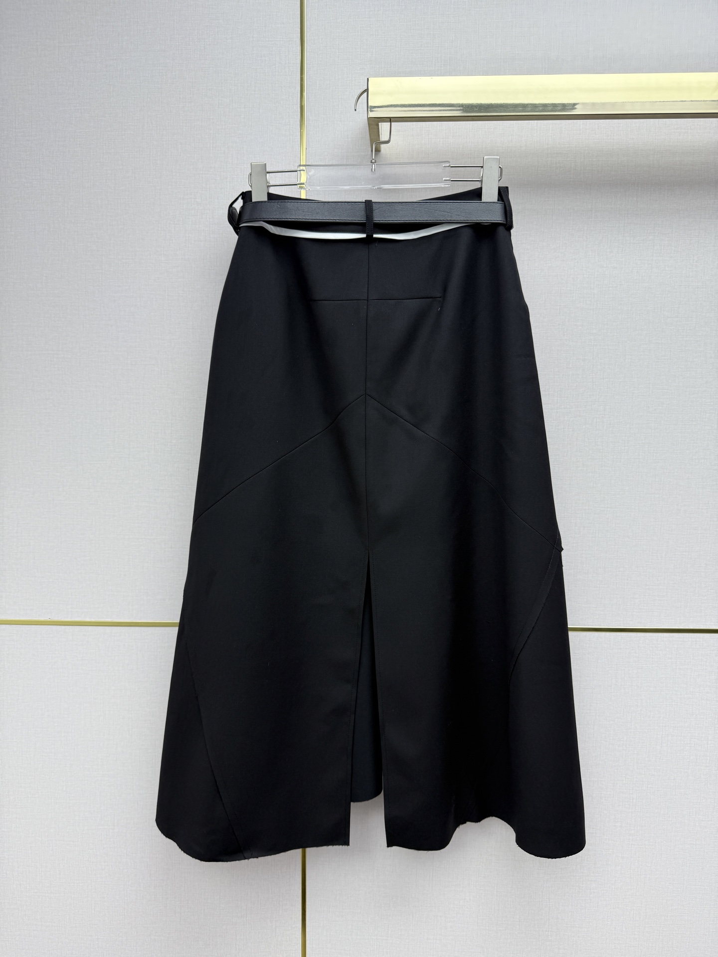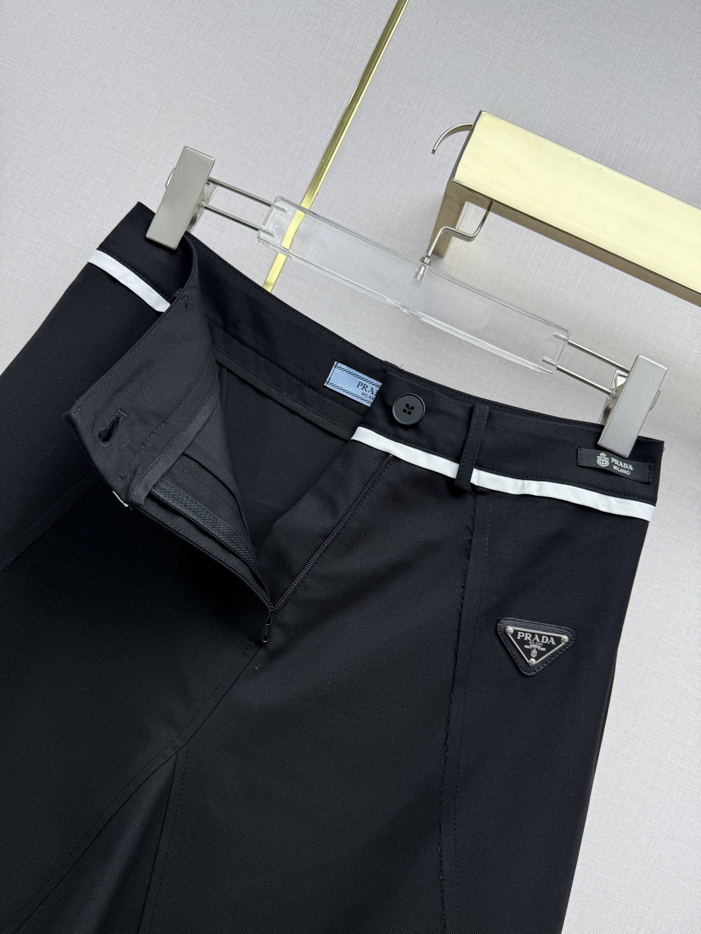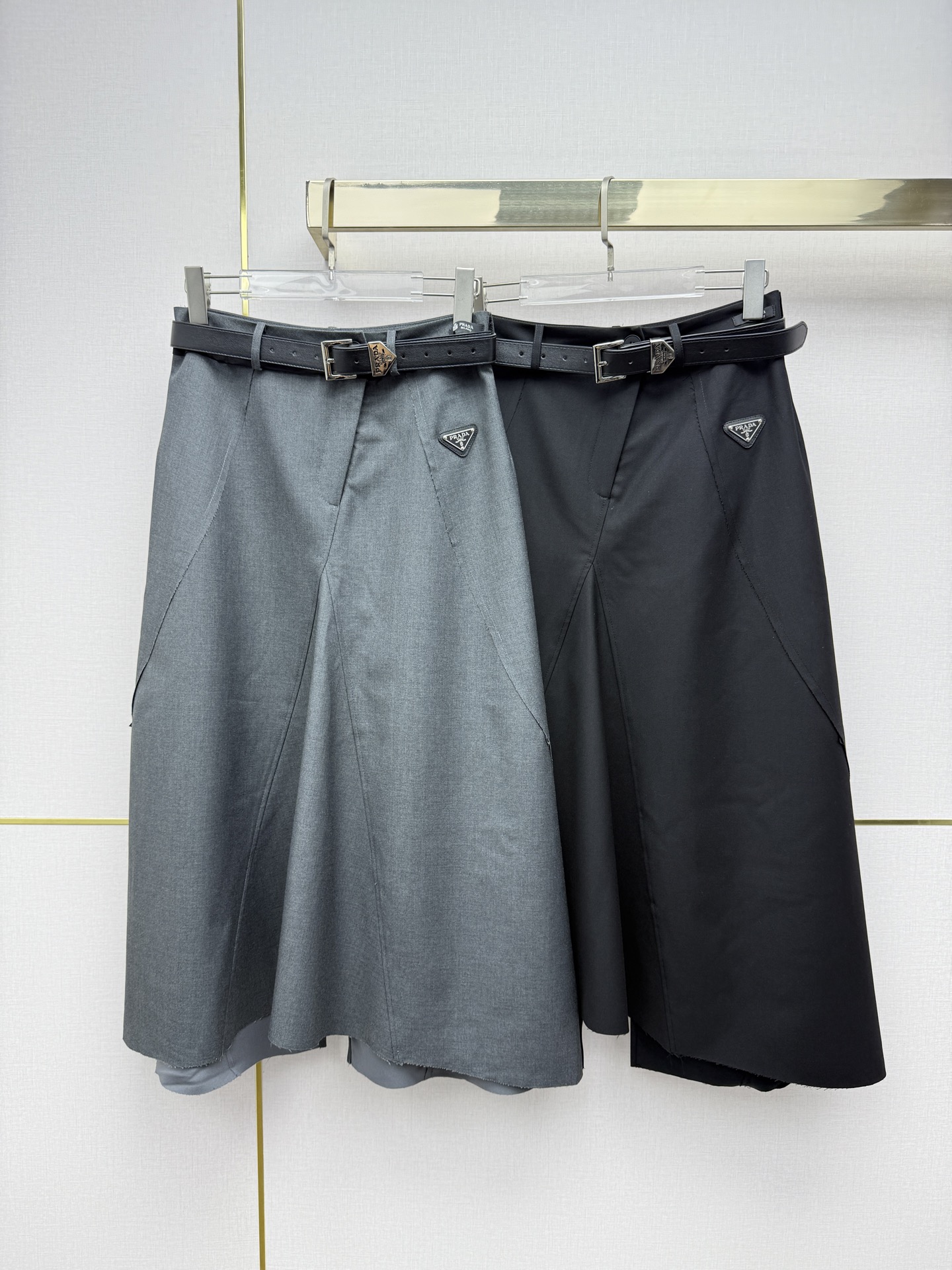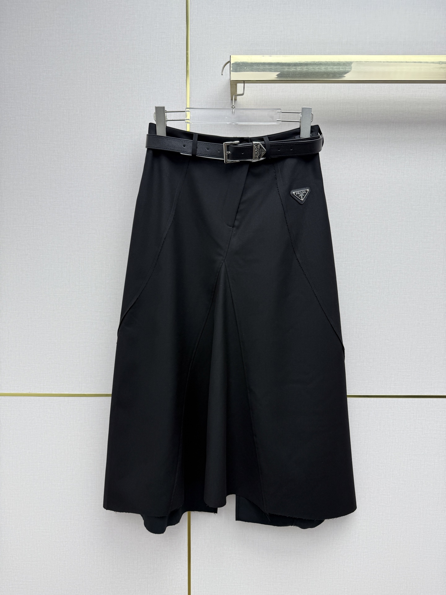 Prada 2026 Spring/Summer Collection. New midi skirt with irregular hemline. Features classic triangle logo decoration and waist belt. Versatile style.