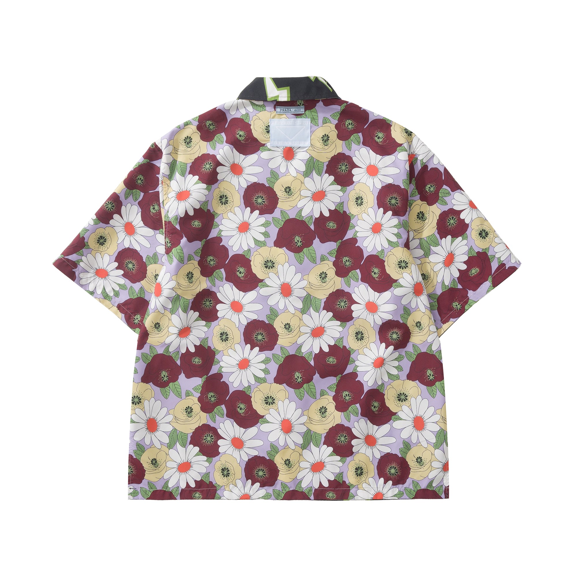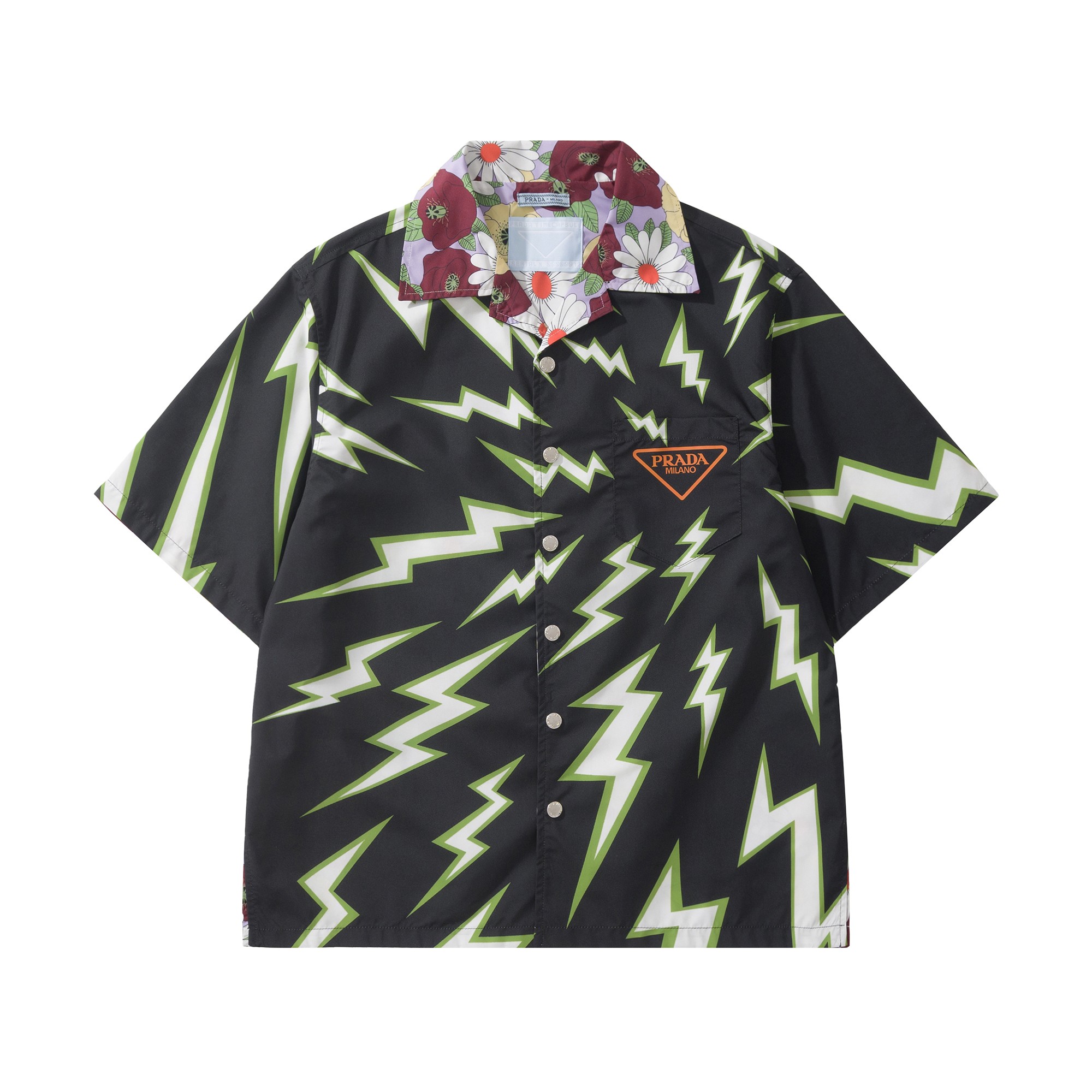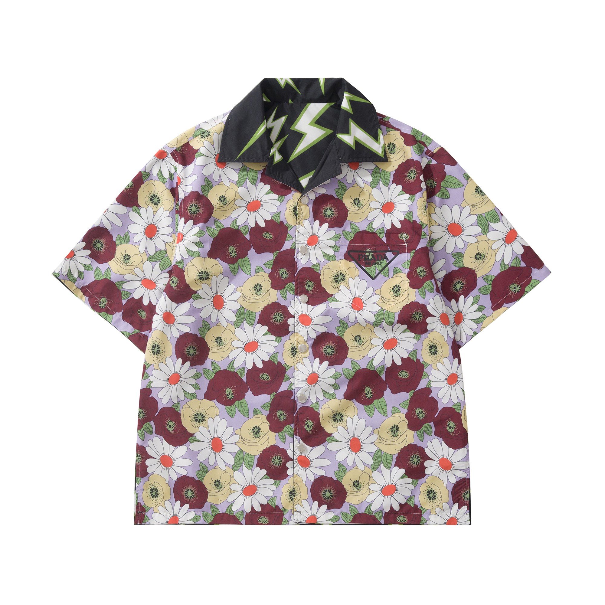 Prada Lightning printed Timecapsule Shirt For Men. Reversible lightning and flower pattern. 100% cotton. Size: S/M/L/XL.