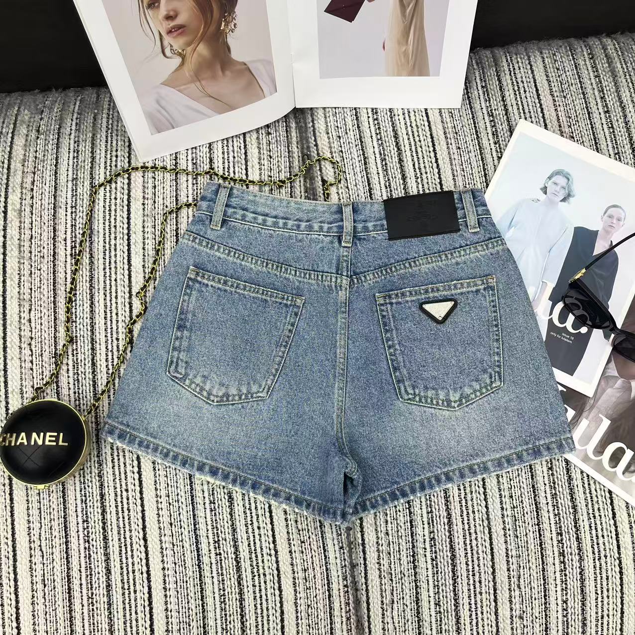Prada 2026 Spring/Summer Collection. Rhinestone denim shorts with rhinestone triangle logo pocket embellishment. Authentic design with detailed crystal work.