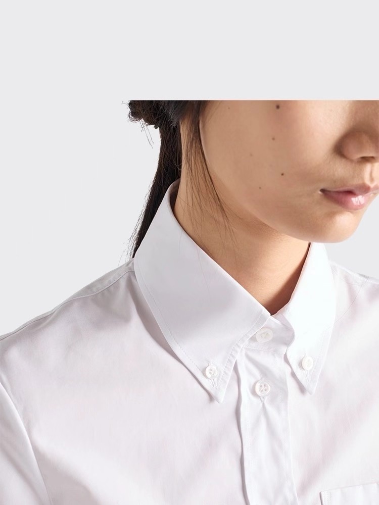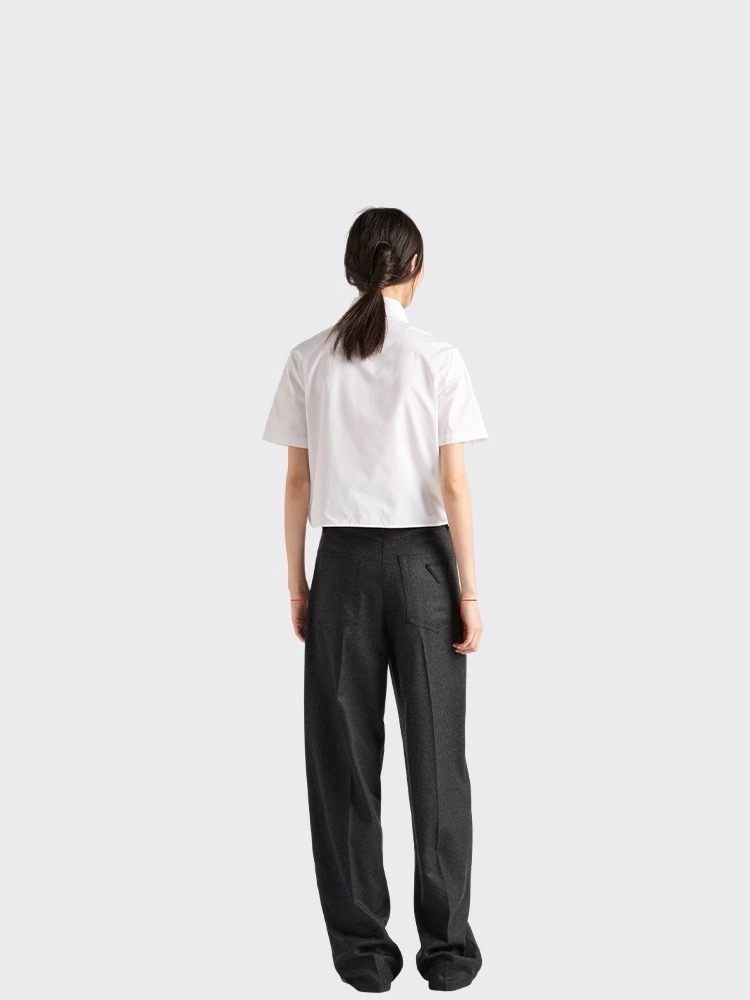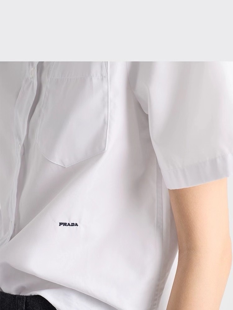Prada 2026 Spring/Summer New Arrival Straight Cut Embroidered Short-Sleeve White Shirt Top with Small Lettering. Authentic quality, size exchange within 10 days, no returns or exchanges. Available in sizes S, M, L. Perfect for a polished, preppy style look.