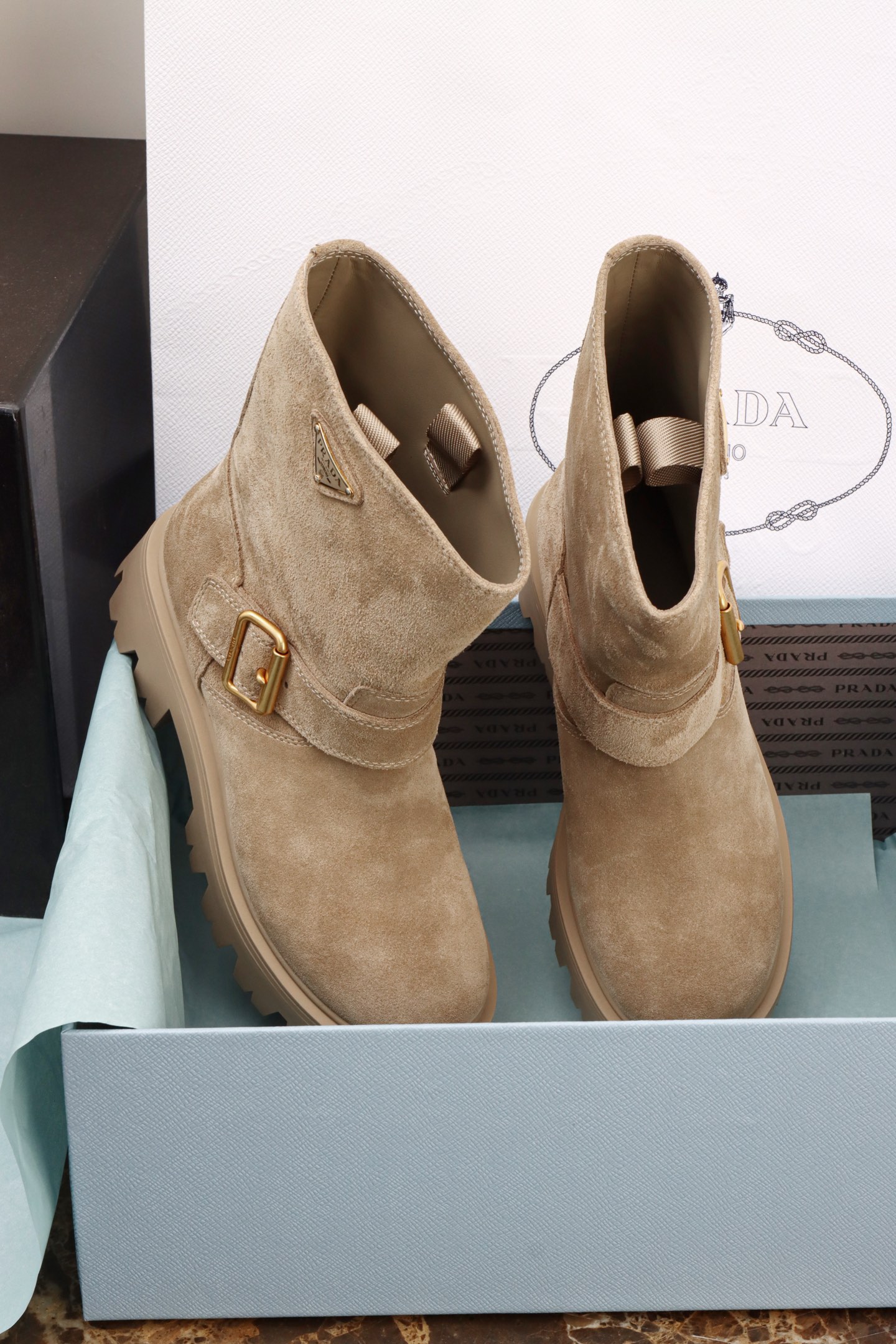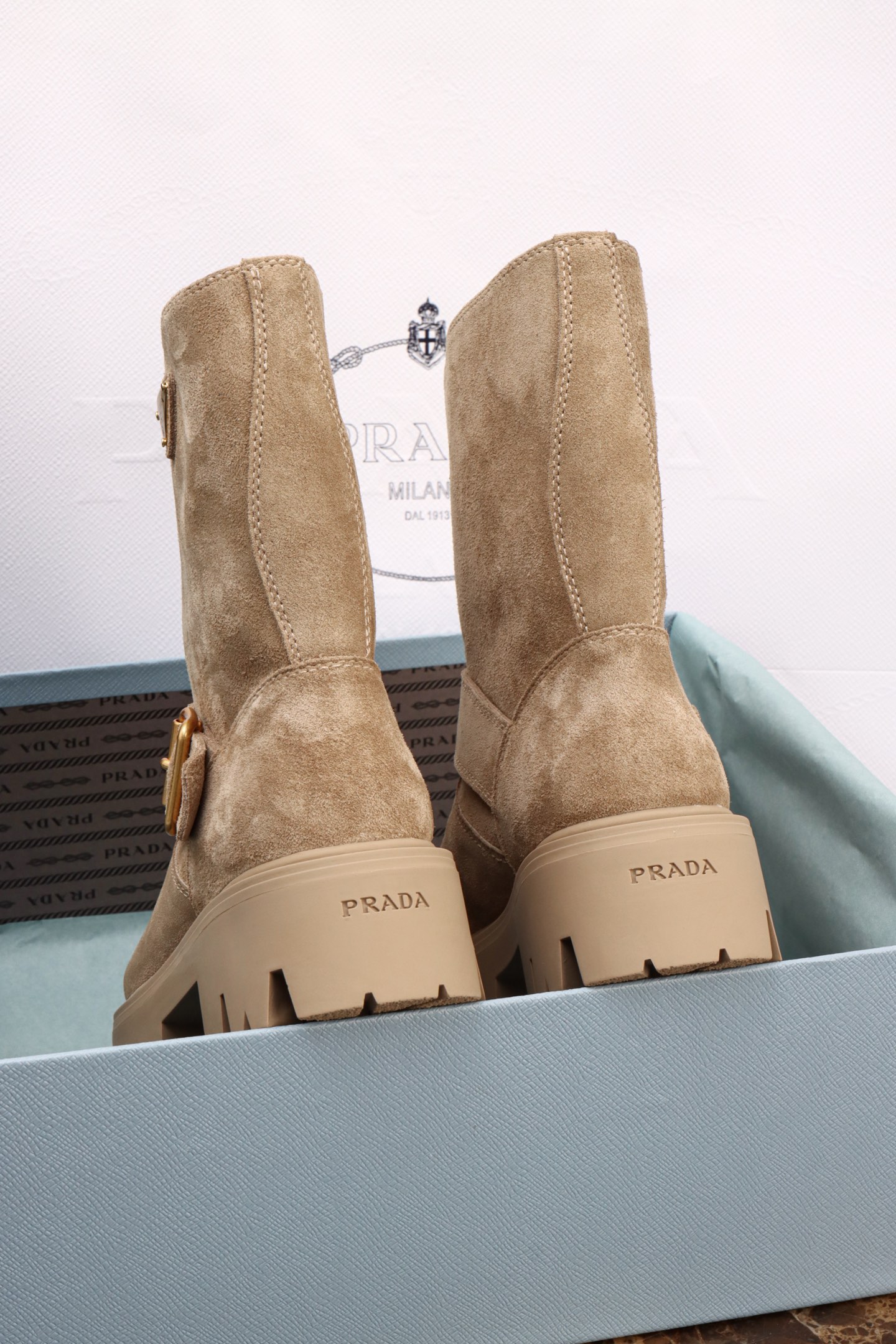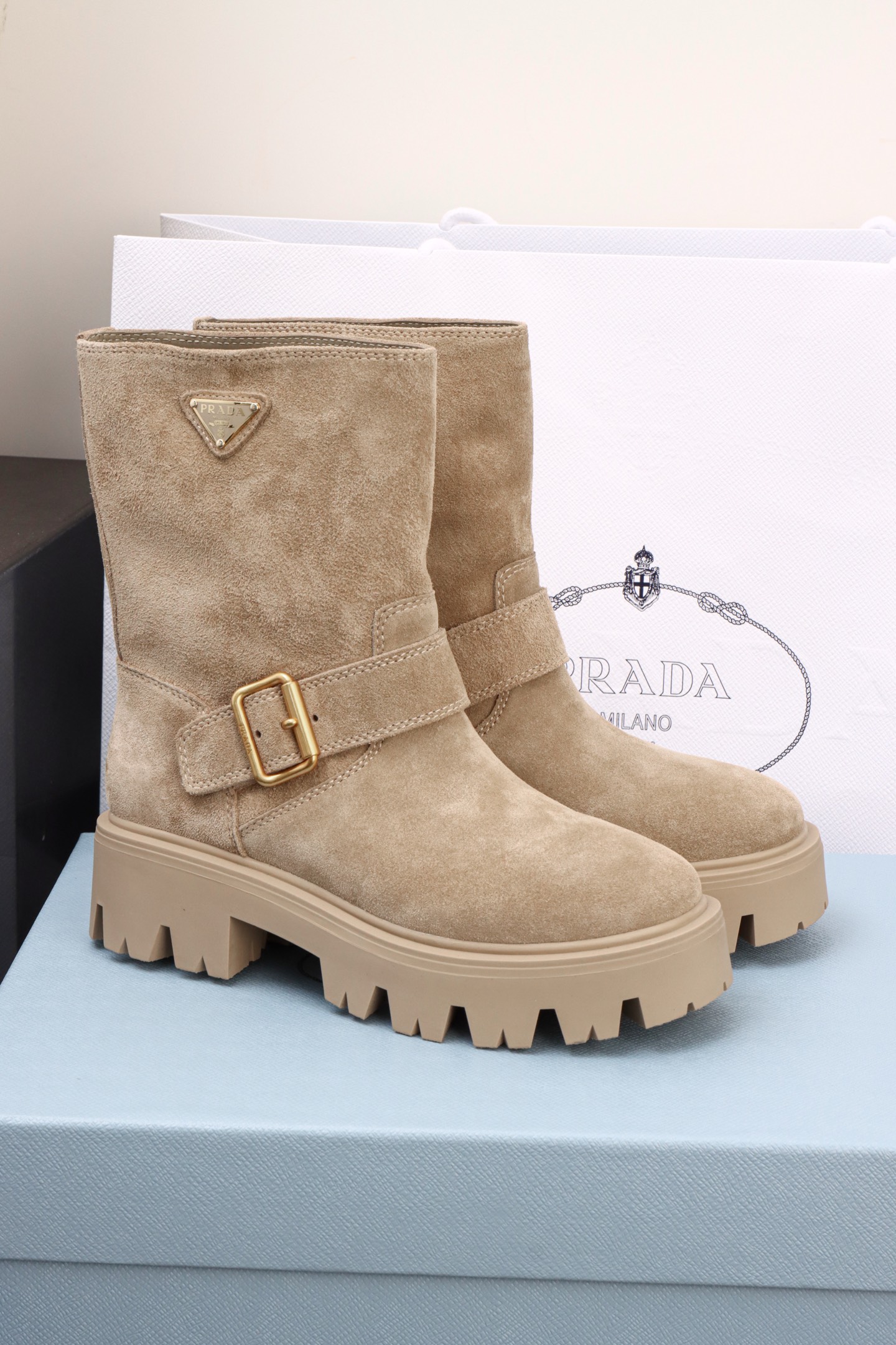 Prada Suede Platform Ankle Boots. Luxurious suede upper with chunky platform sole. Ankle-height design with modern silhouette. Sizes 35-40.