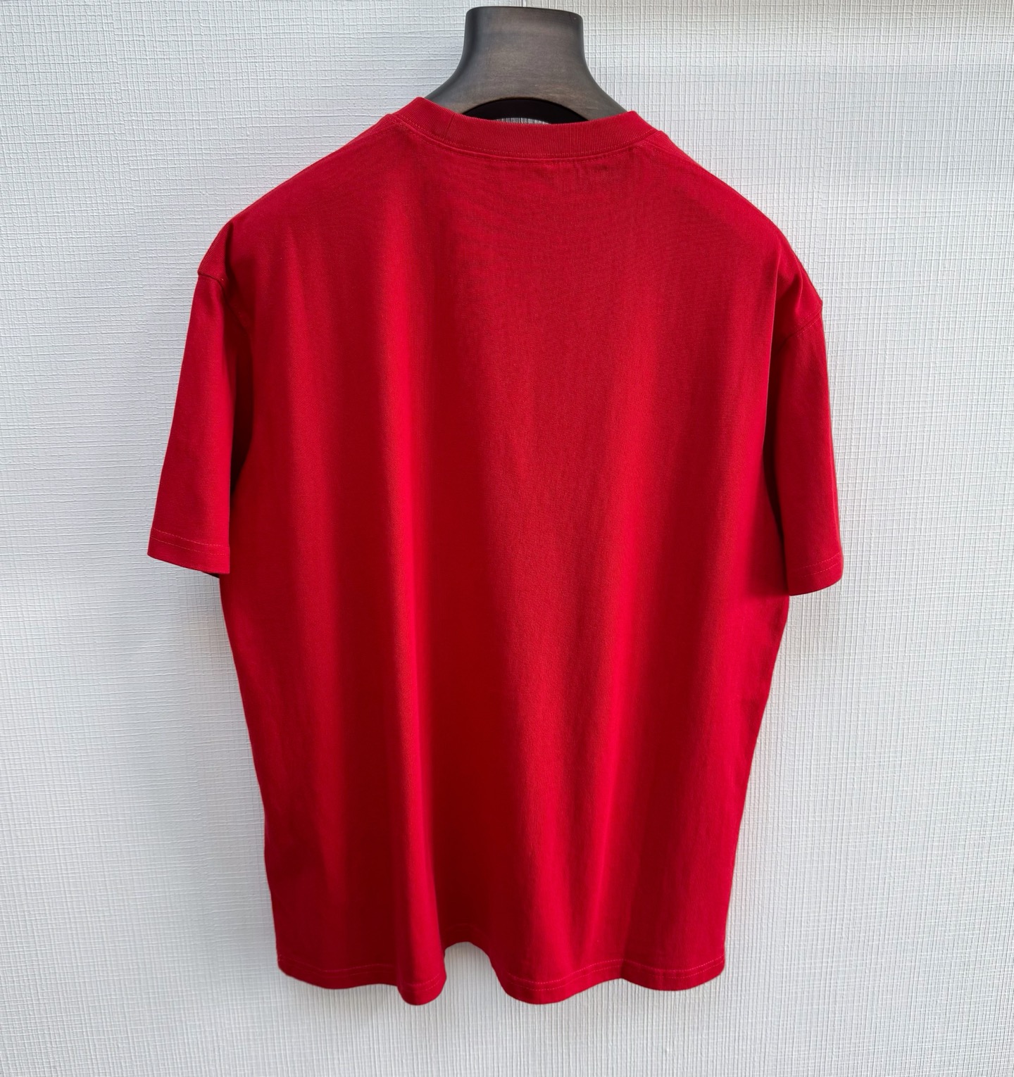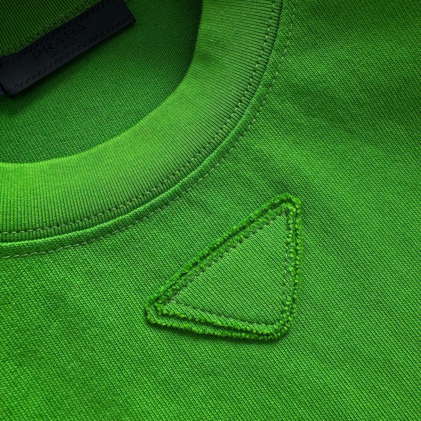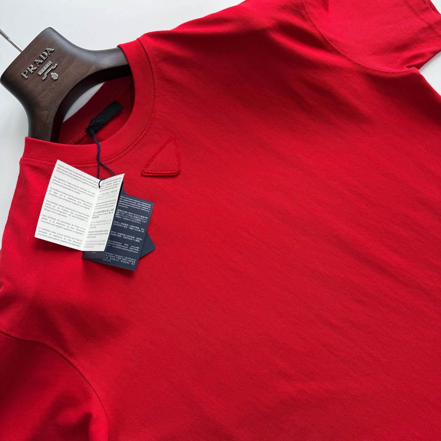 Prada 26SS triangle logo round neck short sleeve T-shirt. 230g 12支精棉平纹针织面料,中等偏重磅确保挺括感、垂坠性和抗皱性。三角形徽标贴片,高密度锁边绣工艺。洗水褪色做旧处理,模拟自然旧化感。Premium cotton, distressed vintage finish.