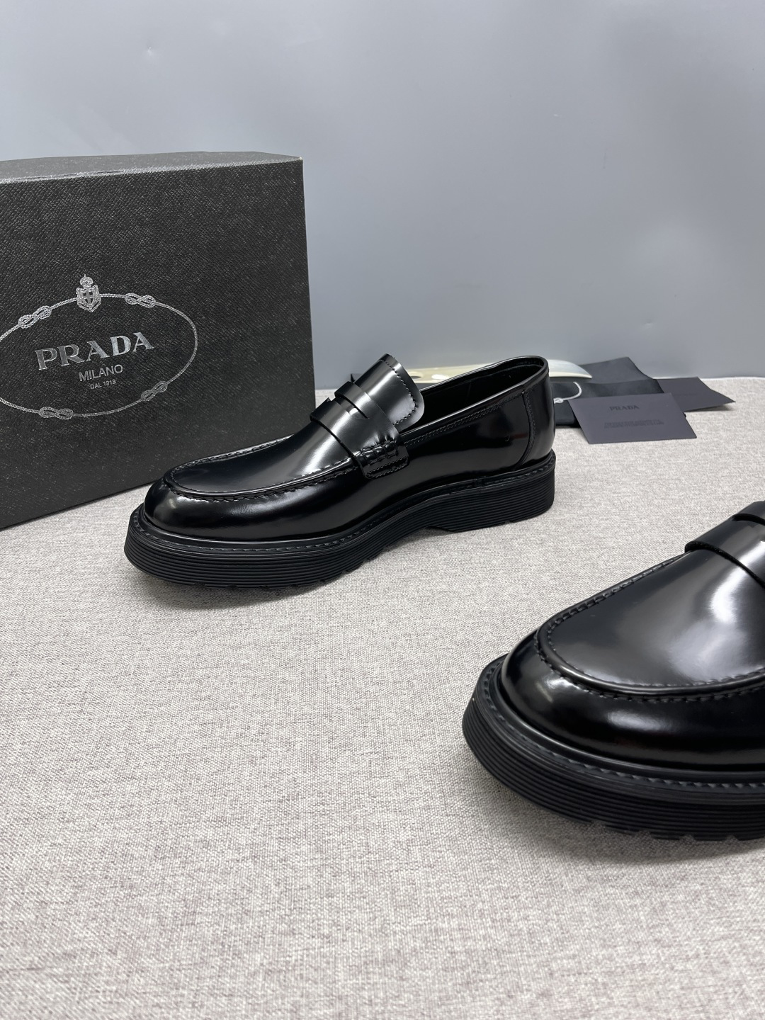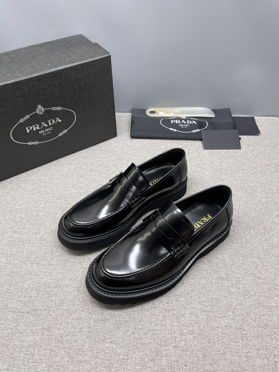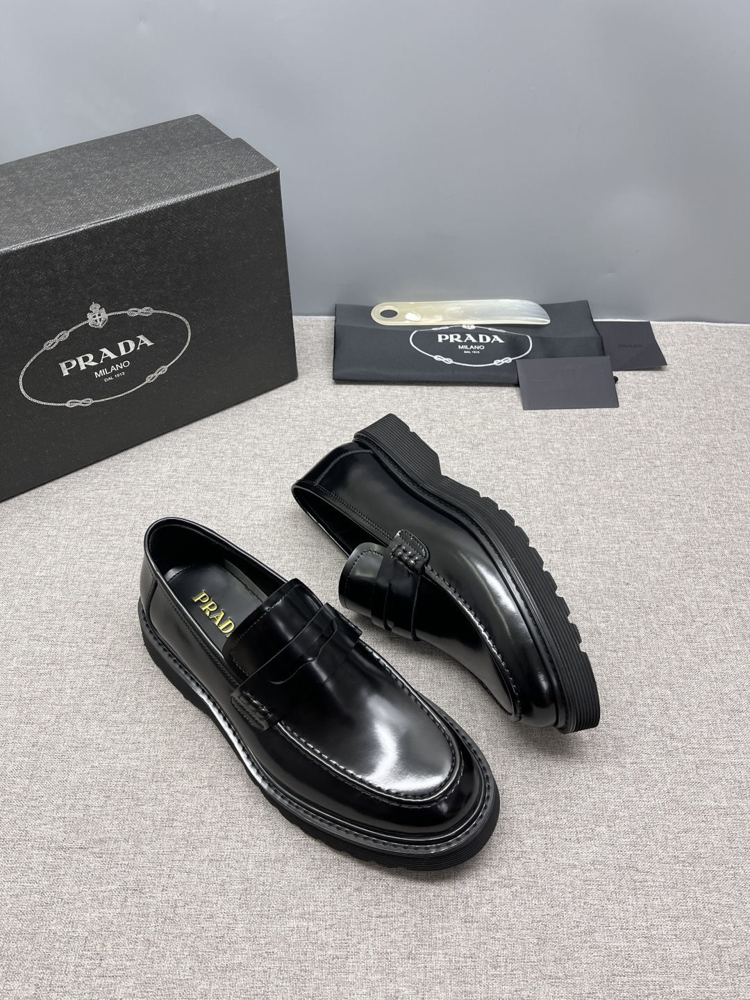 Prada 2026 Spring Collection triangle metal logo leather derby shoes. Cowhide loafers with chunky sole and handcrafted details. Enameled triangle metal logo with decorative straps. Toe cap with visible stitching. Chunky sole with double welt.
