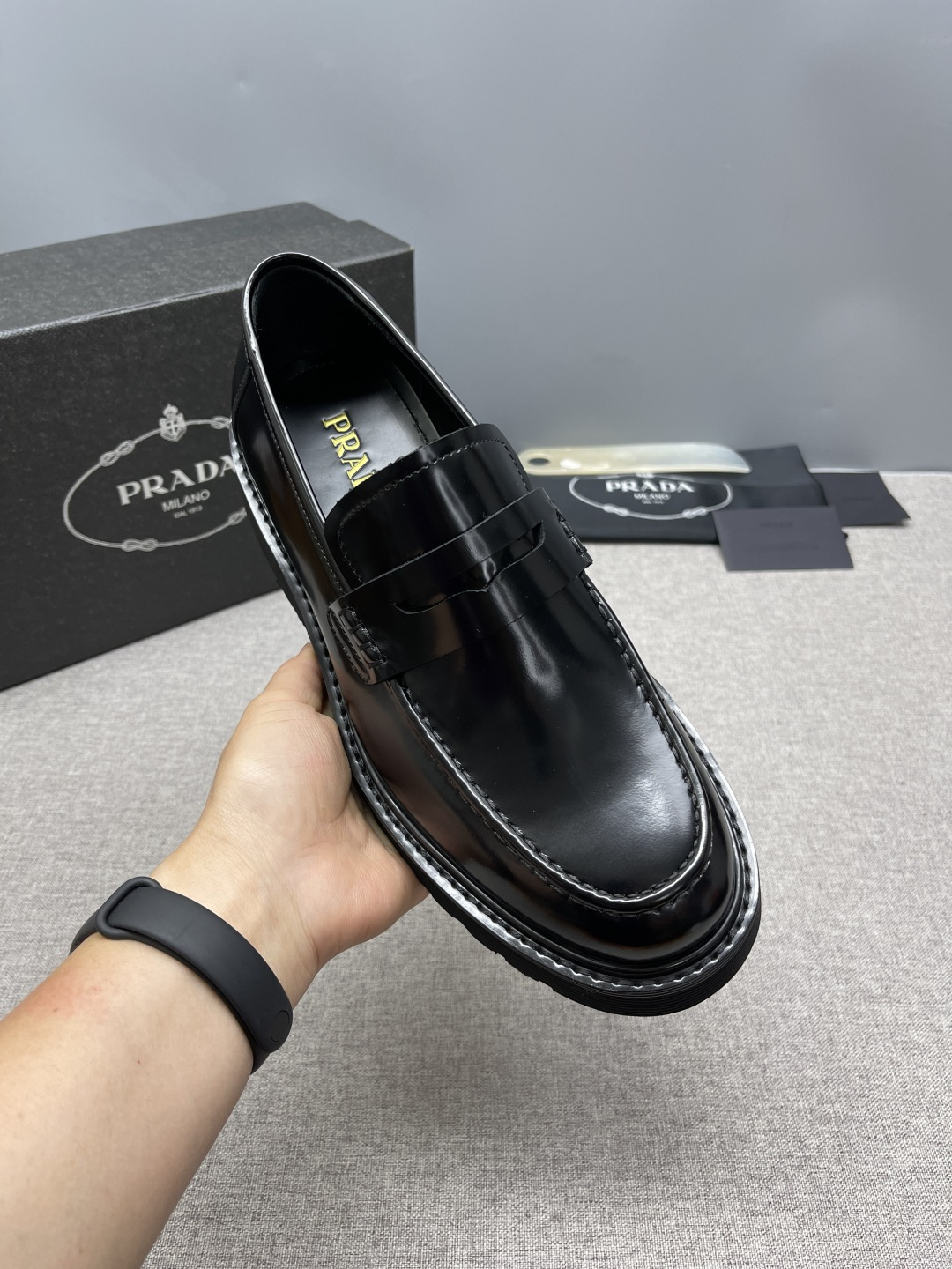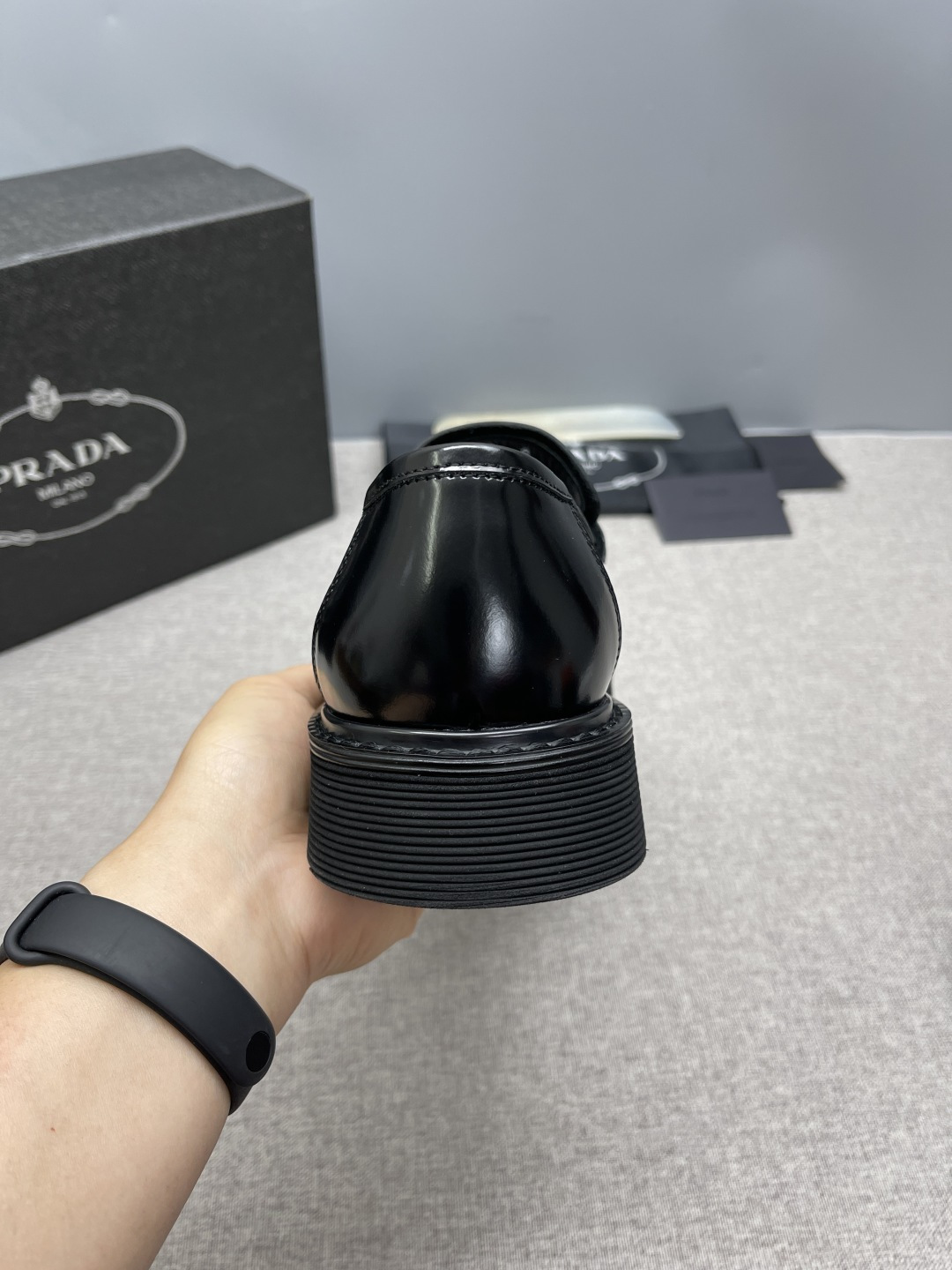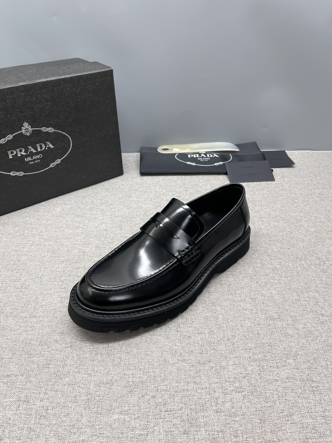 Prada 2026 Spring Collection triangle metal logo leather derby shoes. Cowhide loafers with chunky sole and handcrafted details. Enameled triangle metal logo with decorative straps. Toe cap with visible stitching. Chunky sole with double welt.