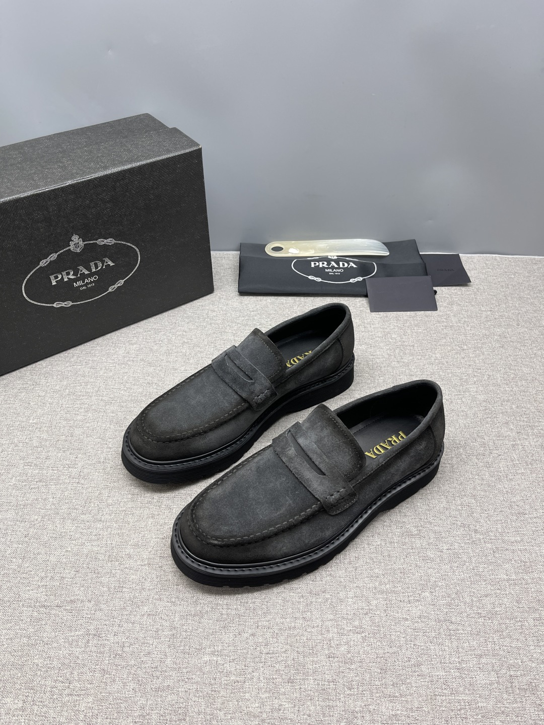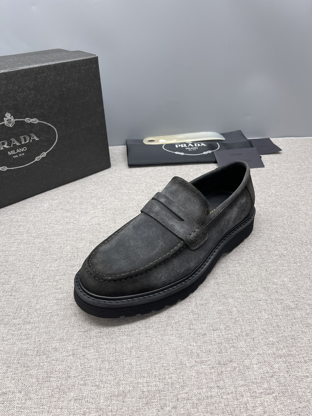 Prada 2026 Spring Collection triangle metal logo leather derby shoes. Cowhide loafers with chunky sole and handcrafted details. Enameled triangle metal logo with decorative straps. Toe cap with visible stitching. Chunky sole with double welt.