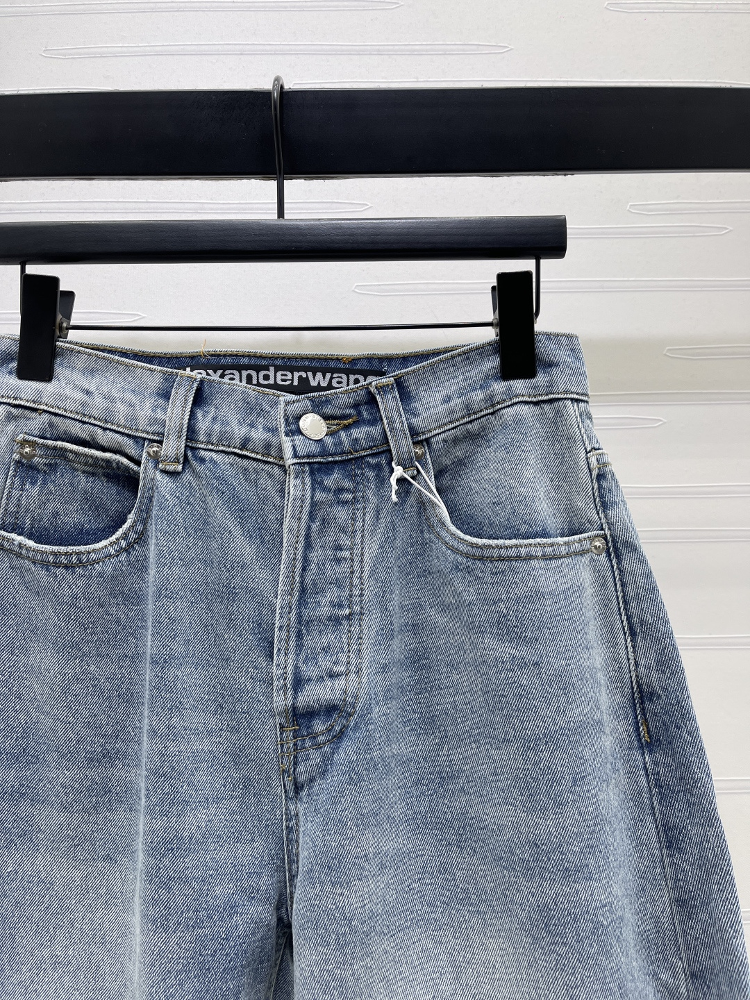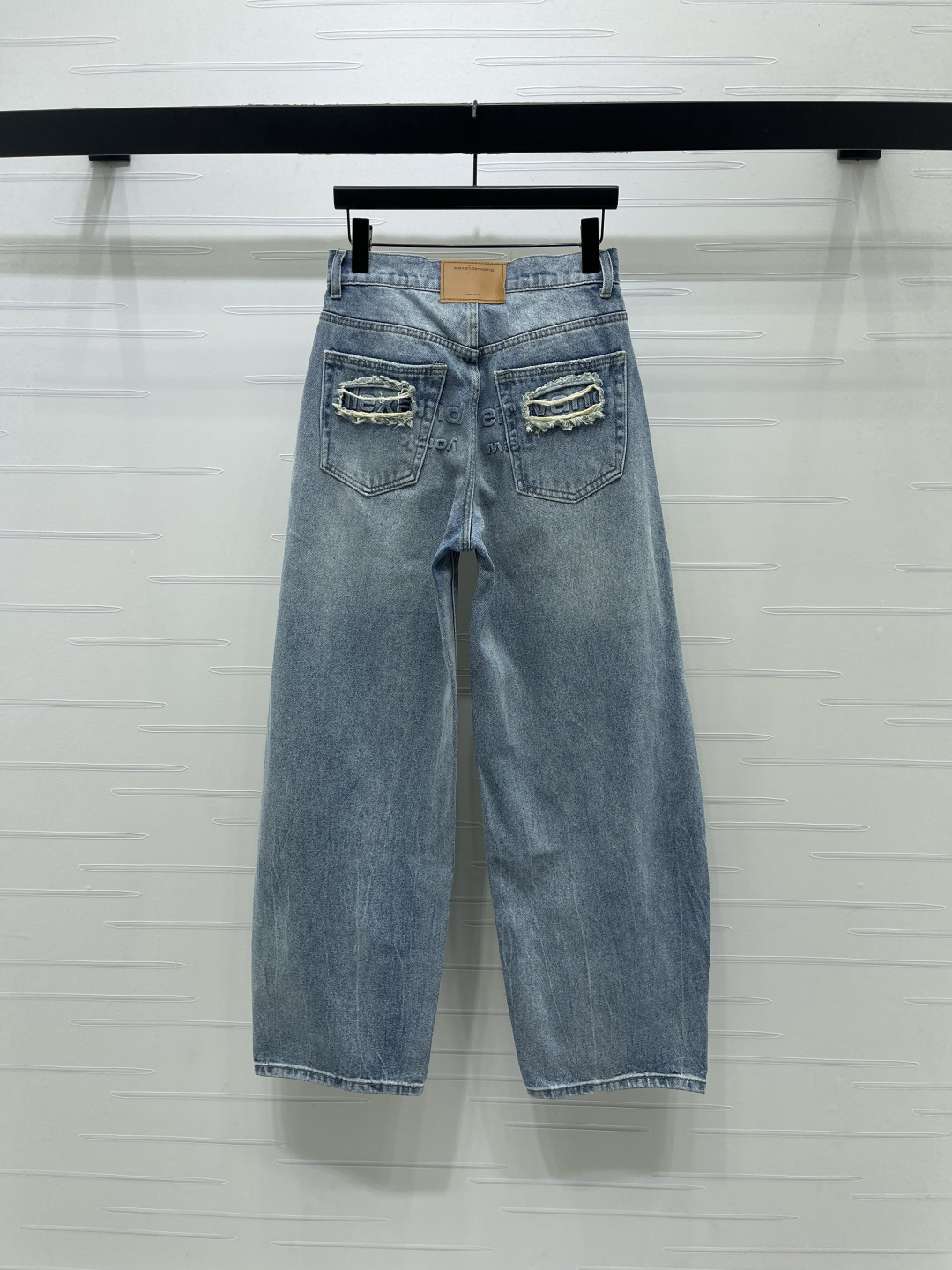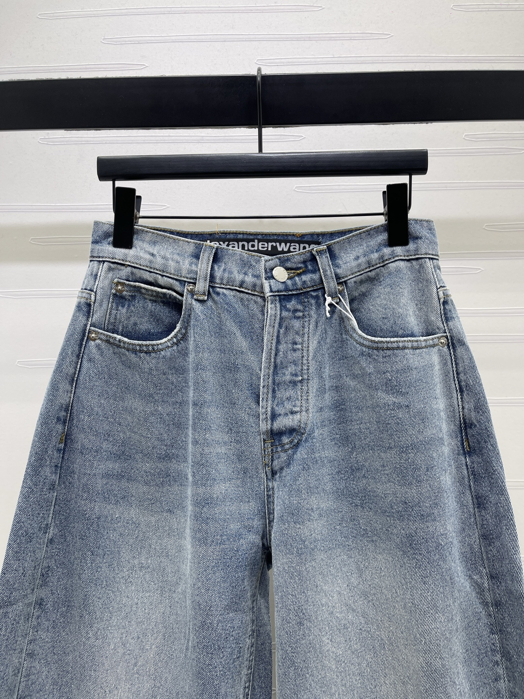 Alexander Wang 2026 early spring collection. Spliced denim curved wide-leg pants. Custom twill cotton denim fabric, breathable, soft and skin-friendly. High waist with symmetrical pockets, wide leg curved cut. Multiple enzyme wash treatment for even light blue distressed effect. Clear seaming details on outer leg, retro structural design. Back pocket distressed with letter logo detail. Loose fit, flattering and leg-lengthening.