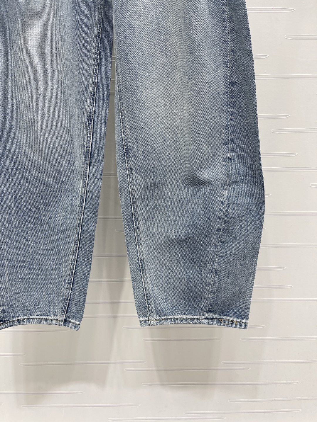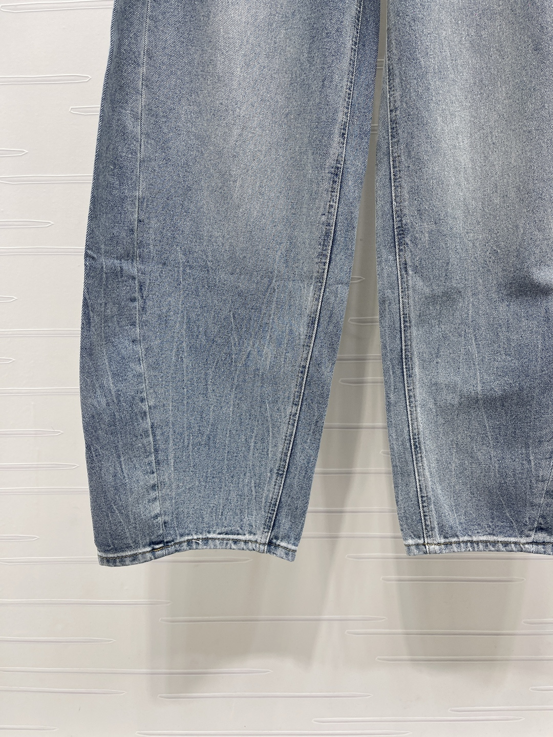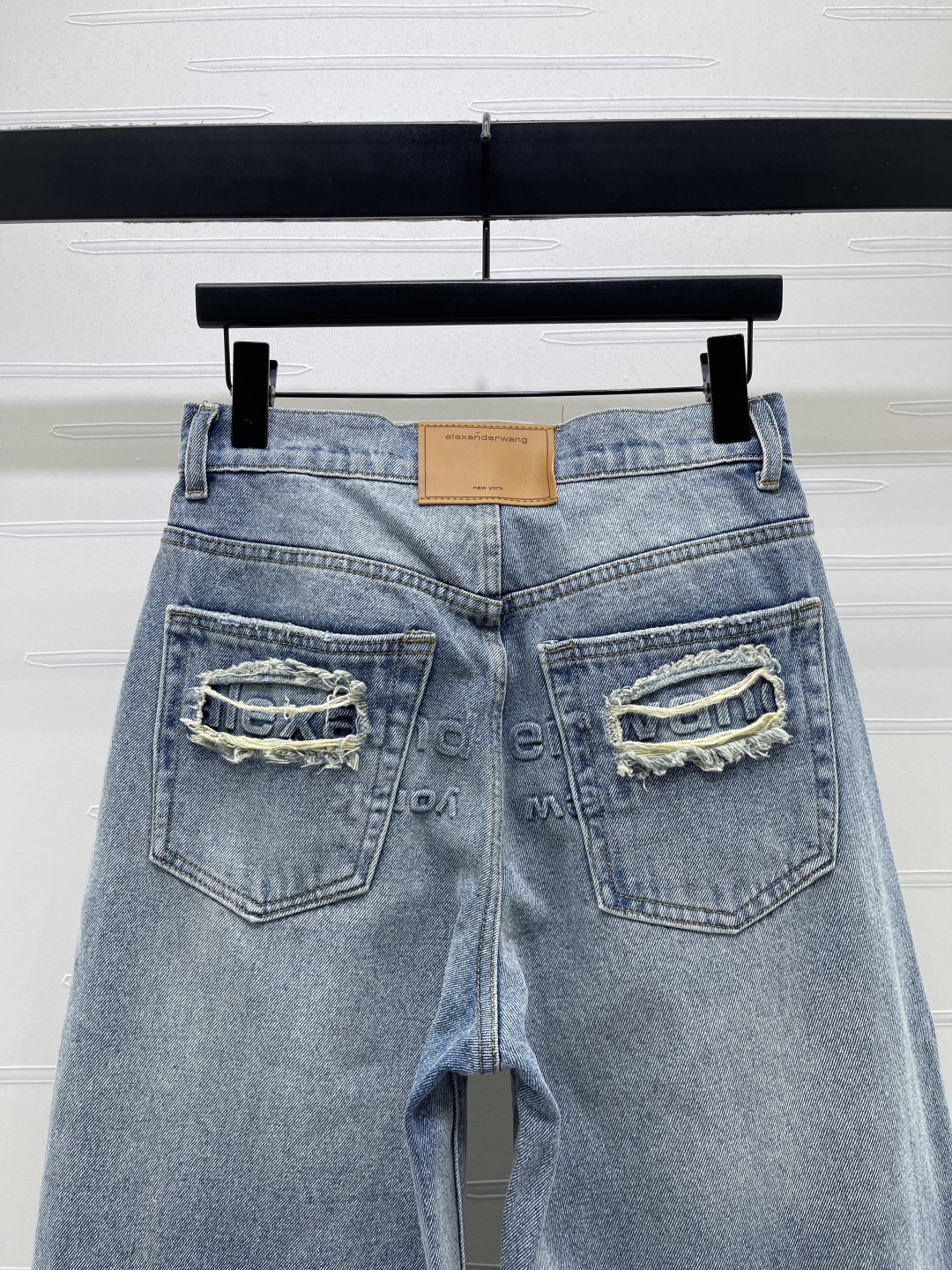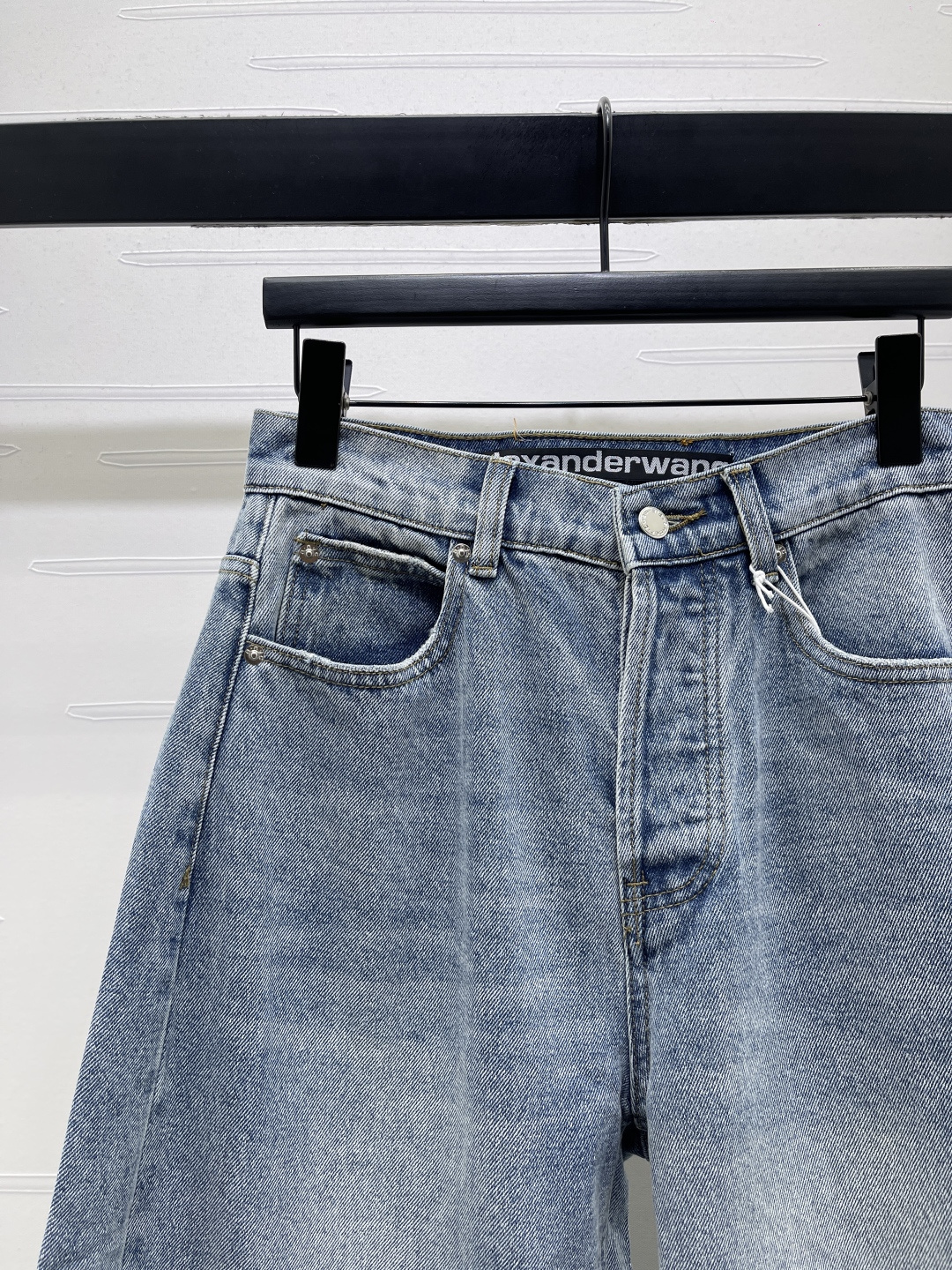 Alexander Wang 2026 early spring collection. Spliced denim curved wide-leg pants. Custom twill cotton denim fabric, breathable, soft and skin-friendly. High waist with symmetrical pockets, wide leg curved cut. Multiple enzyme wash treatment for even light blue distressed effect. Clear seaming details on outer leg, retro structural design. Back pocket distressed with letter logo detail. Loose fit, flattering and leg-lengthening.