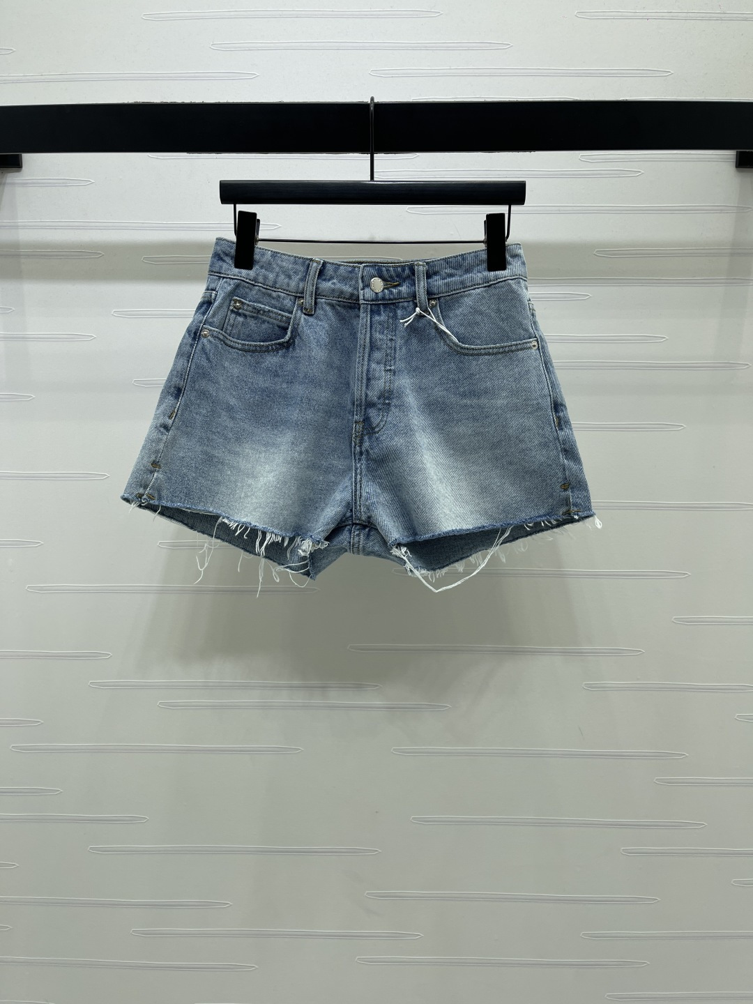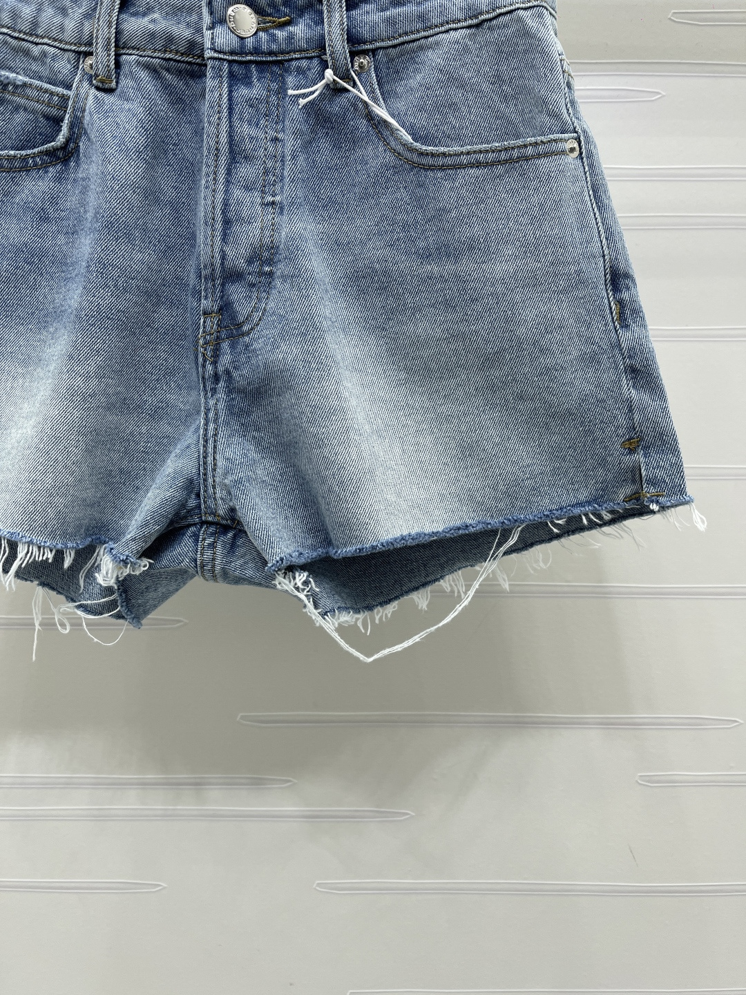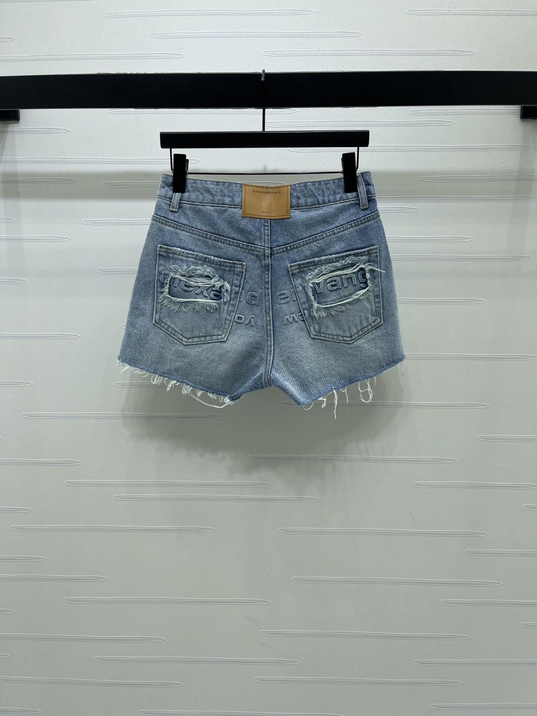 Alexander Wang 2026 early spring collection. Distressed denim shorts. Custom twill cotton denim, premium texture, structured fit. High waist button-fly shorts, enzyme wash light blue with striped wrinkle texture. Raw cut hem for a free-spirited look. Back pocket distressed with letter logo detail.