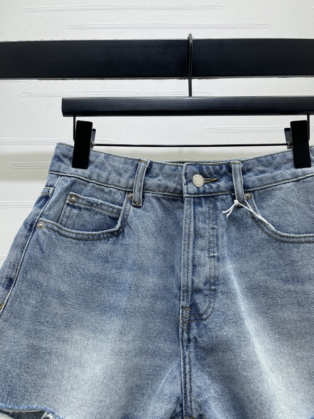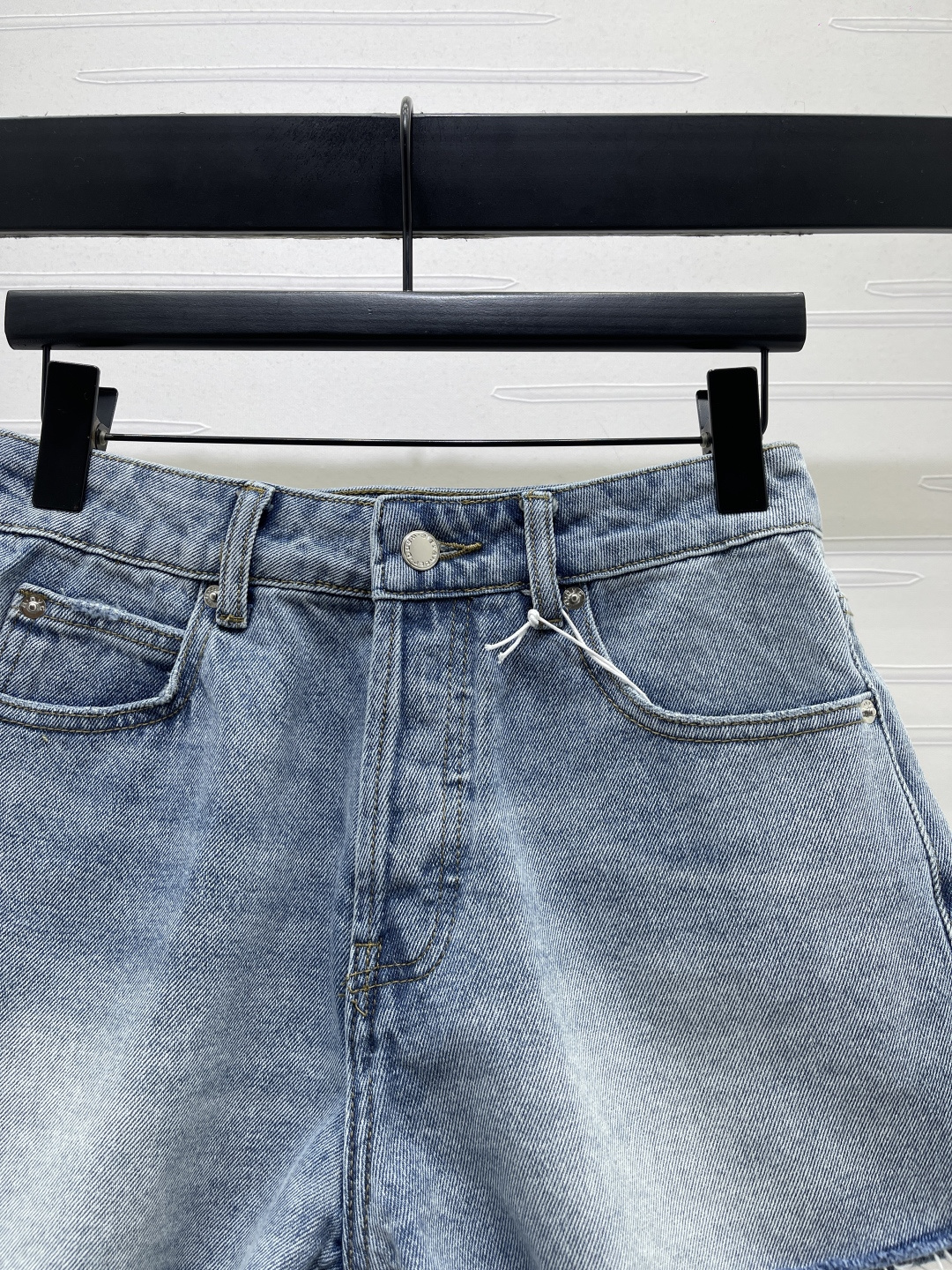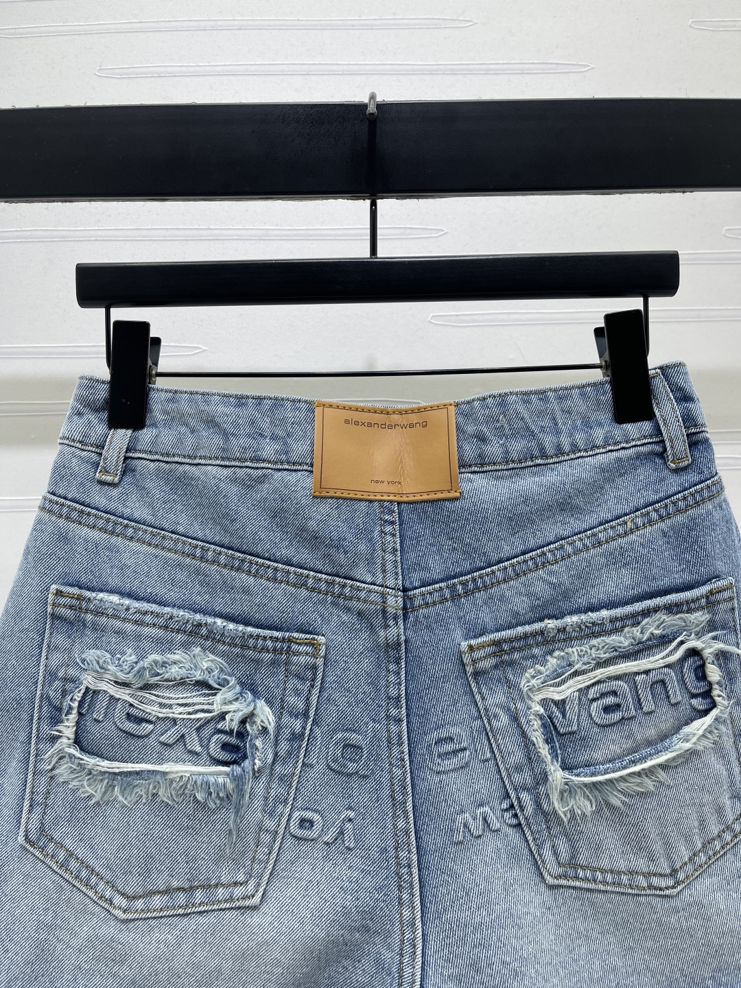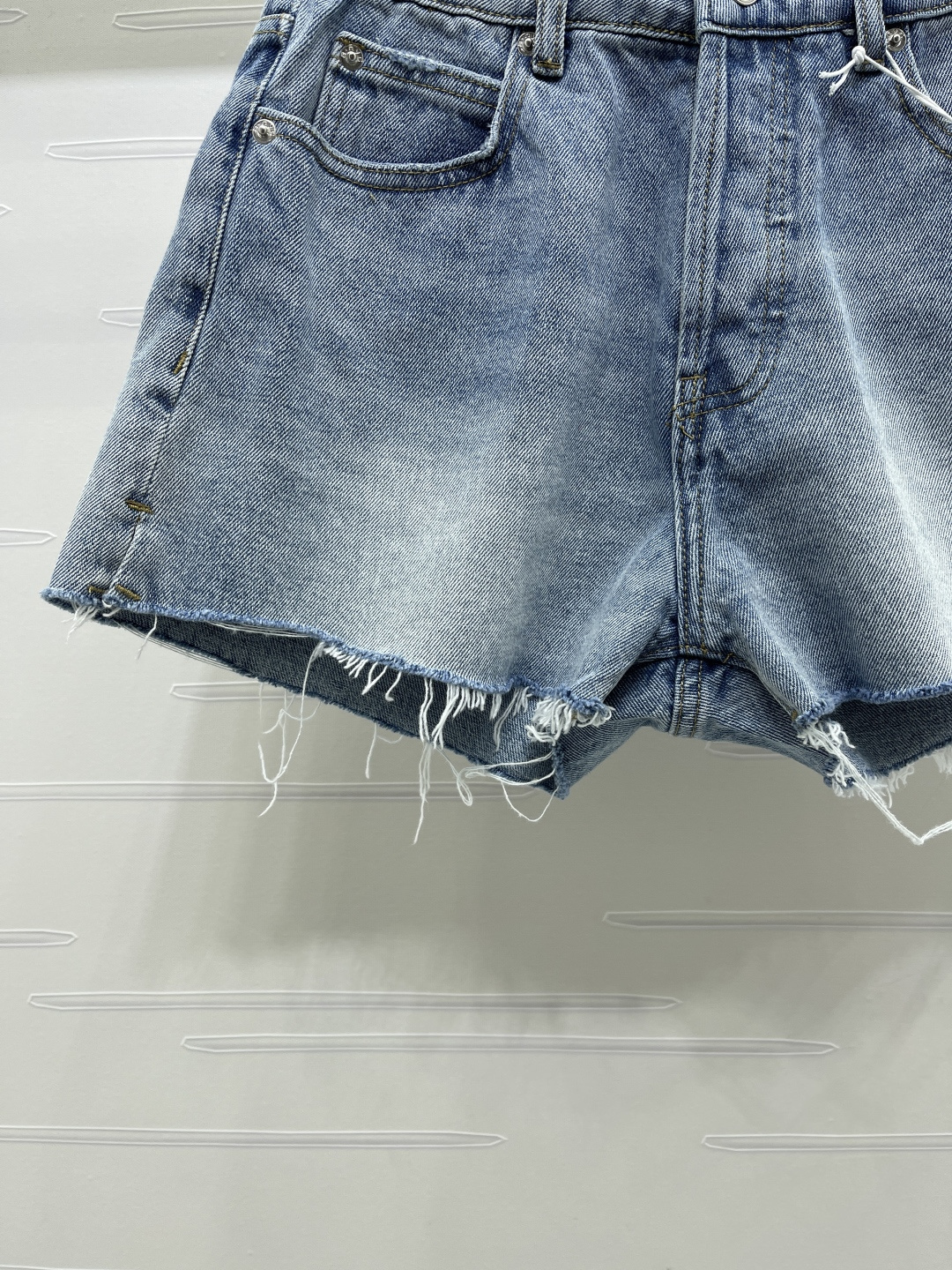 Alexander Wang 2026 early spring collection. Distressed denim shorts. Custom twill cotton denim, premium texture, structured fit. High waist button-fly shorts, enzyme wash light blue with striped wrinkle texture. Raw cut hem for a free-spirited look. Back pocket distressed with letter logo detail.