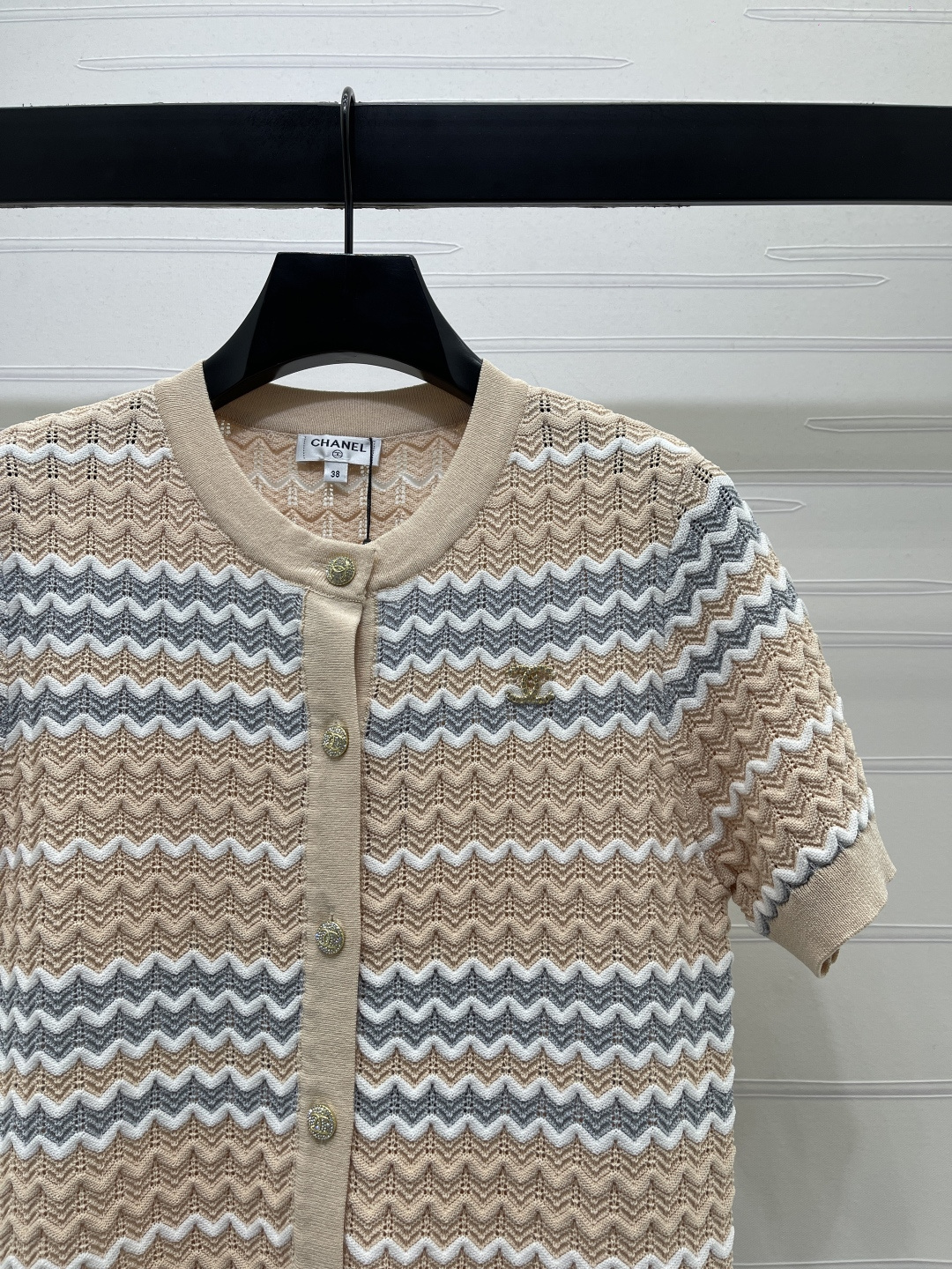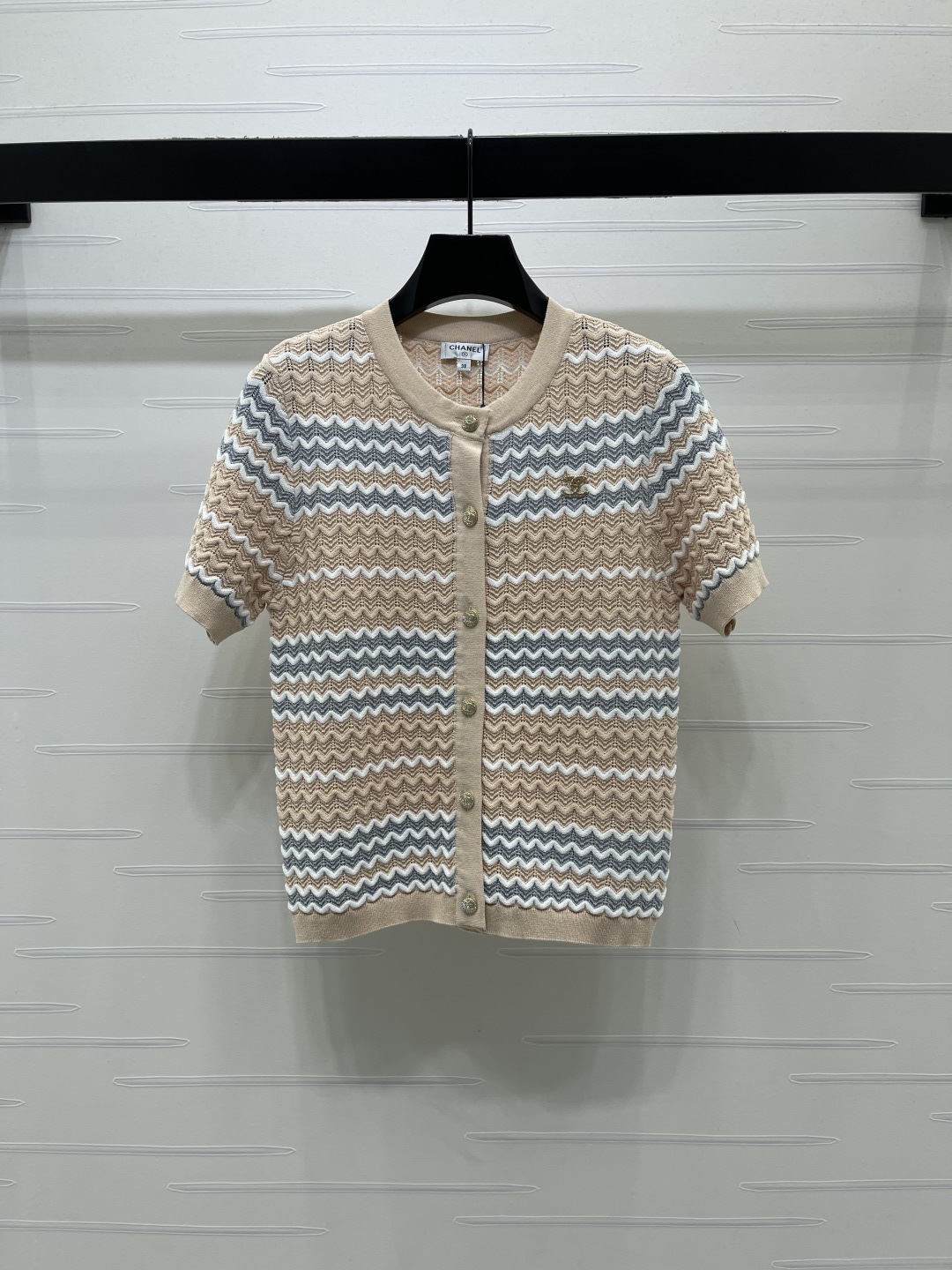 Chanel 2026 Spring Summer new collection. Wavy stripe knit short sleeve cardigan. Custom imported knit fabric, premium texture, highly breathable. Round neck short sleeve cut with contrast color wave openwork pattern, sweet and fresh. Rhinestone double C logo on chest. Regular fit, versatile and flattering. 2 colors available.