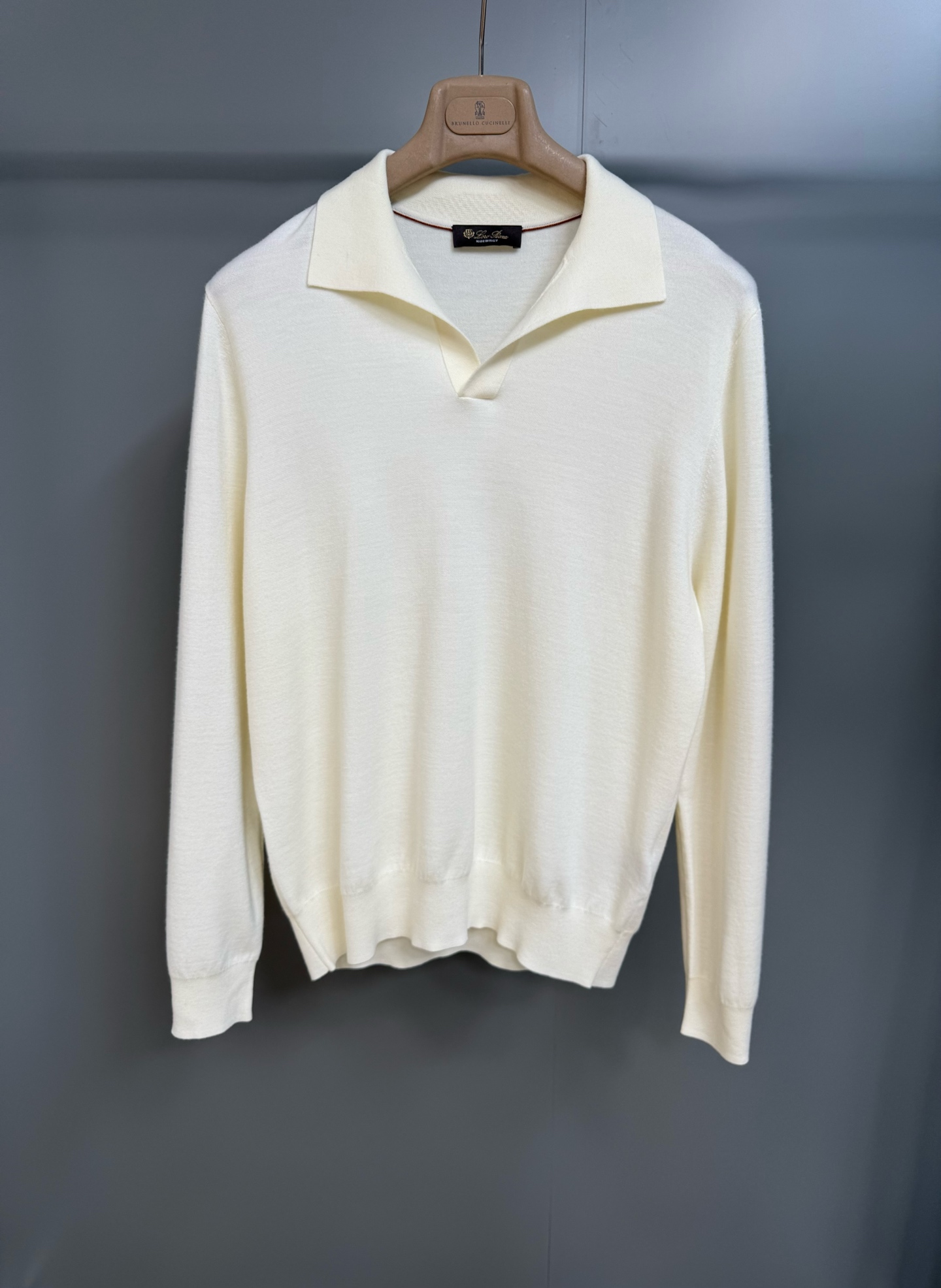 Loro Piana Wish Empire mens wool polo shirt. Made from Wish wool sourced from Australian and New Zealand merino sheep. Dense knit fabric, drop shoulder design, relaxed fit, buttonless polo collar, ribbed collar and cuffs. 100% wool.
