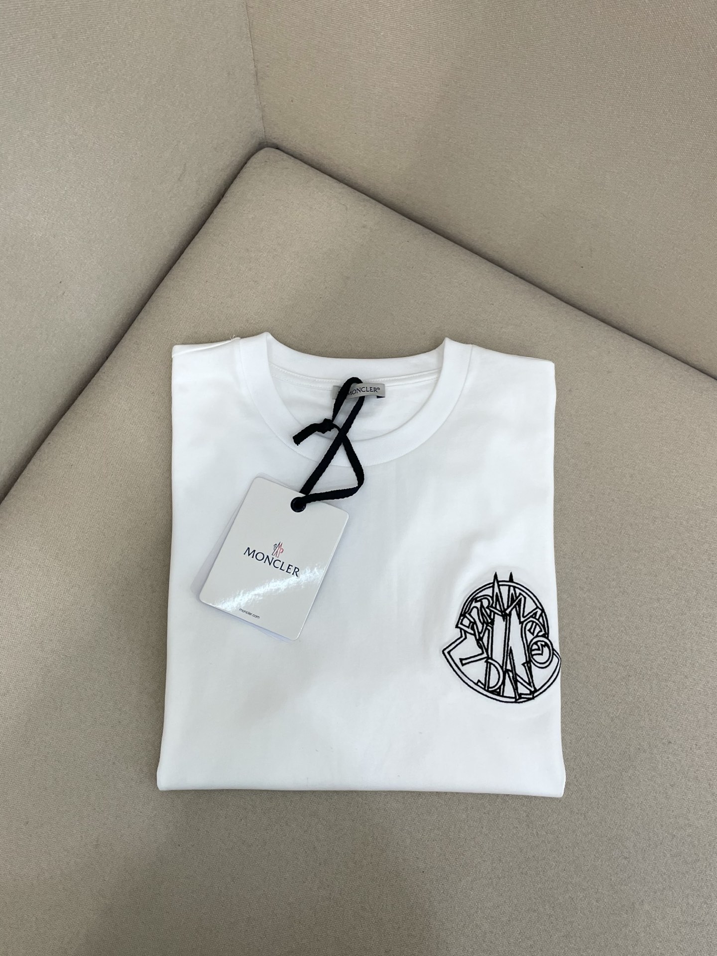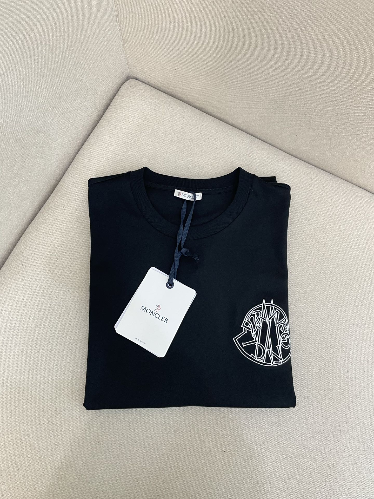 Moncler logo t-shirt. Round logo embroidery on chest, classic embroidered badge on sleeve. Oversized fit.